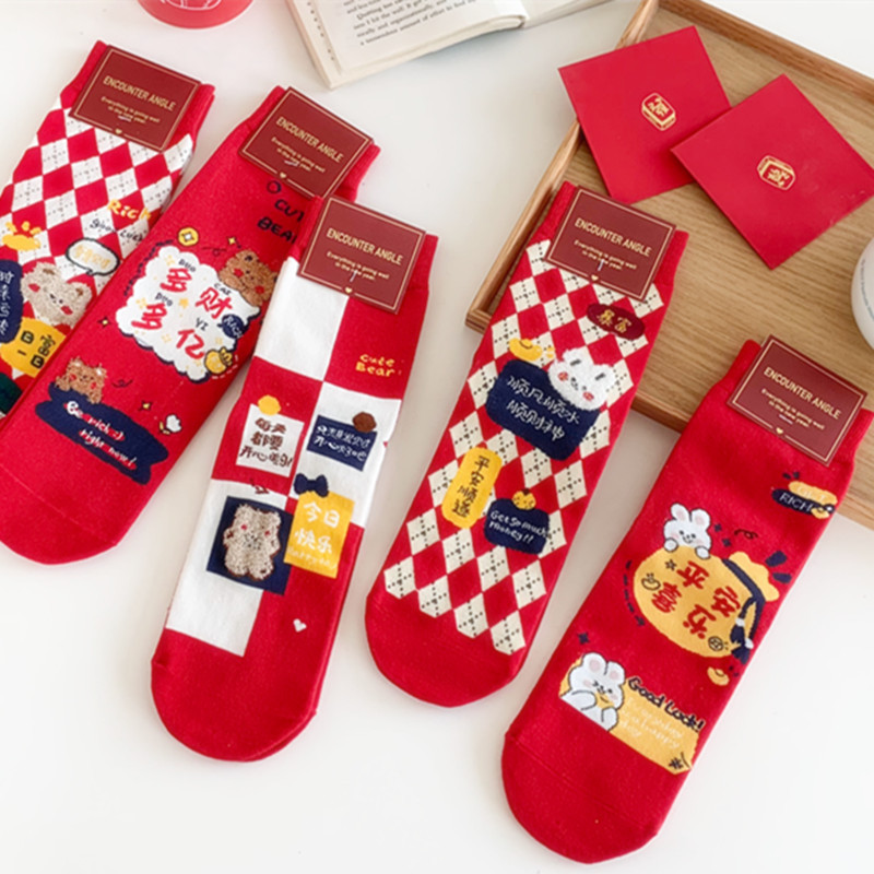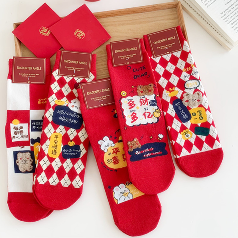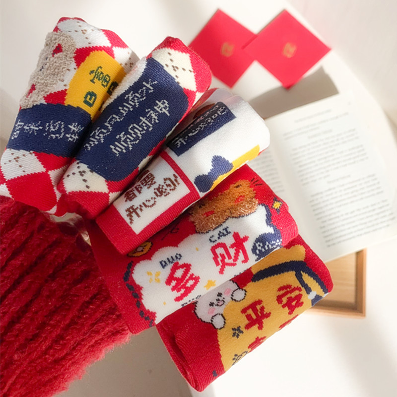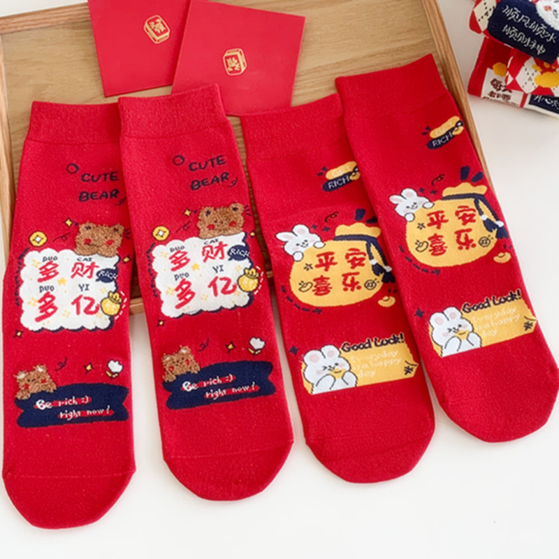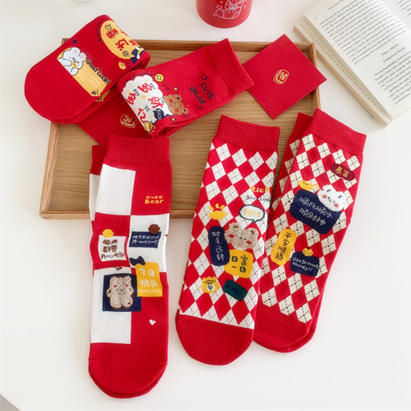 새해 양말 남자와 여자를위한 여자의 봄과 가을 빨간 양말 귀여운 토끼 고양이 빨간 커플 결혼식 축제 면화스토어 가기