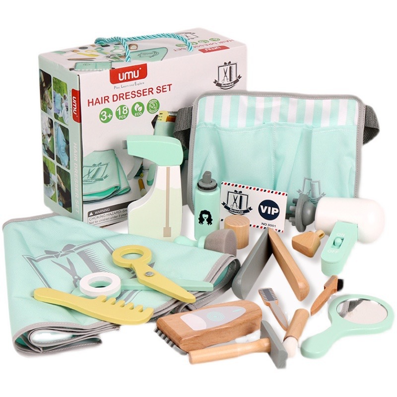 이발사 장난감 나무 세트 어린이 선물 시뮬레이션 가위 헤어 드라이어 이발사 도구 아기 역할 놀이