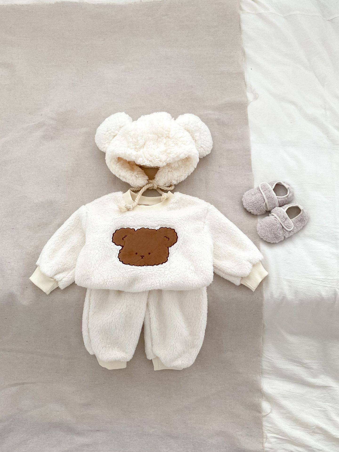 겨울 새로운 아기 두 조각 두꺼운 따뜻한 북극 벨벳 귀여운 곰 풀오버 긴 소매 탑 바지 세트
