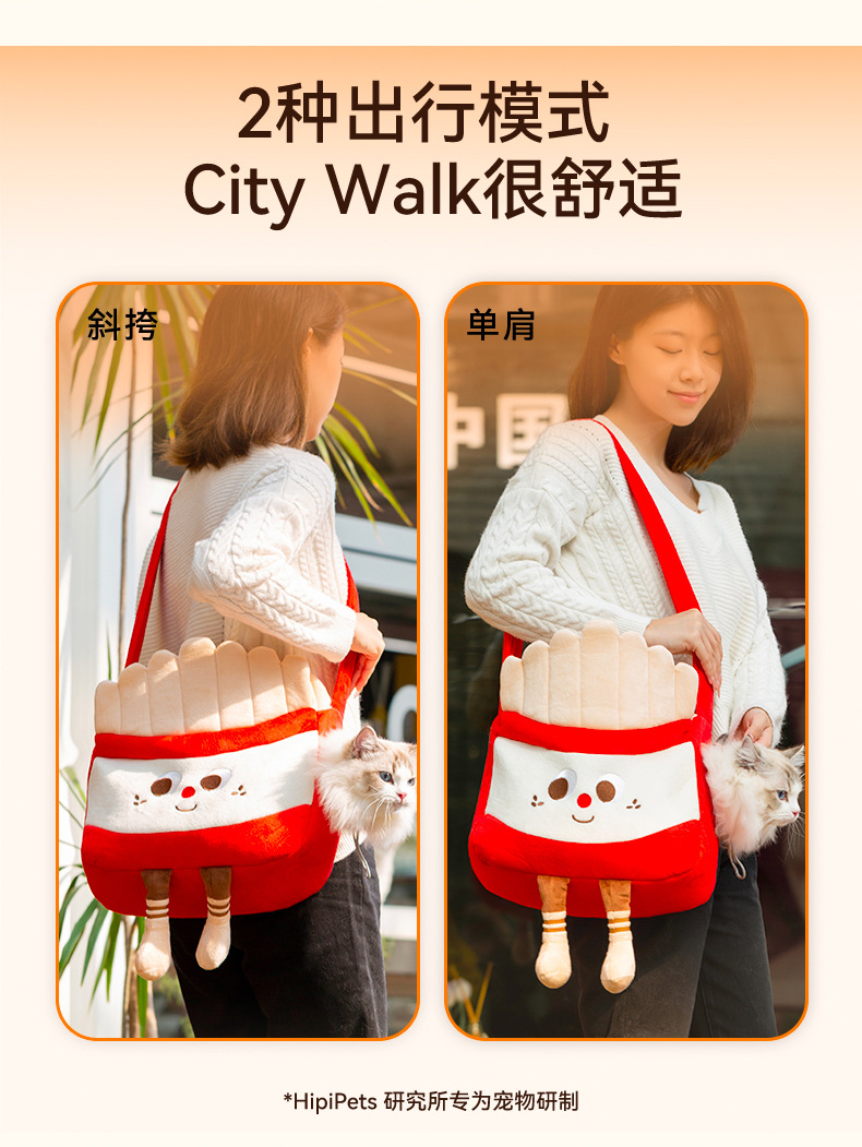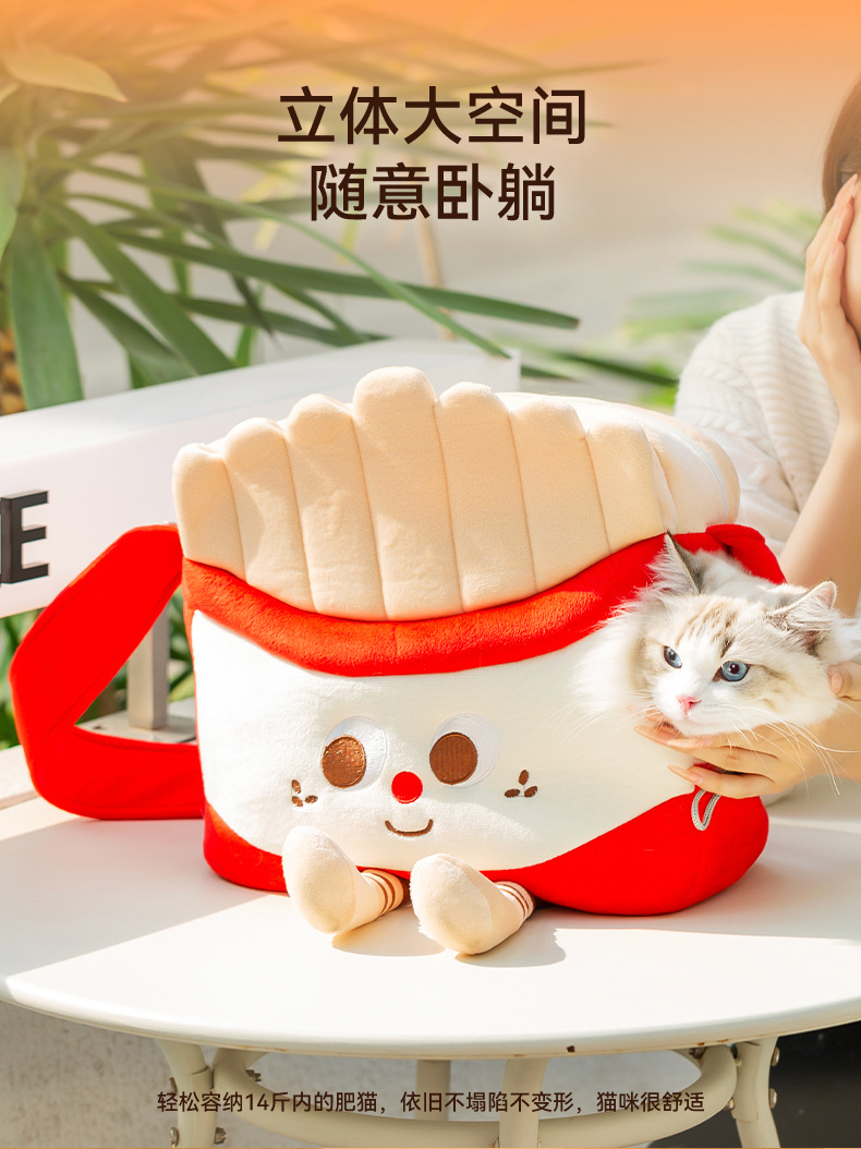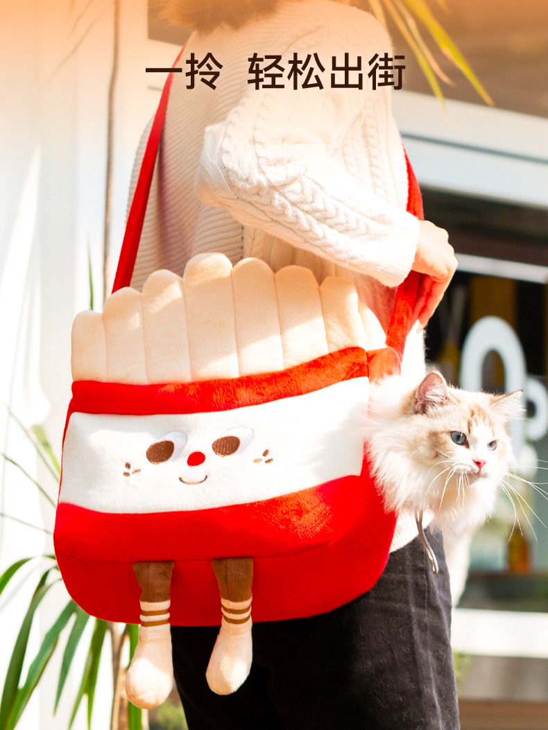 온라인 유명 인사 재미있는 햄버거 감자 튀김 고양이 모양의 나들이 가방 가을과 겨울 따뜻한 노출 개 메신저 가방 애완 동물 가방스토어 가기