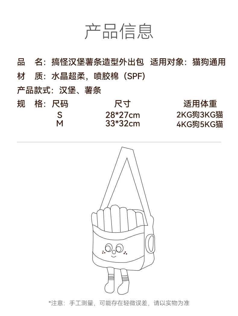 온라인 유명 인사 재미있는 햄버거 감자 튀김 고양이 모양의 나들이 가방 가을과 겨울 따뜻한 노출 개 메신저 가방 애완 동물 가방