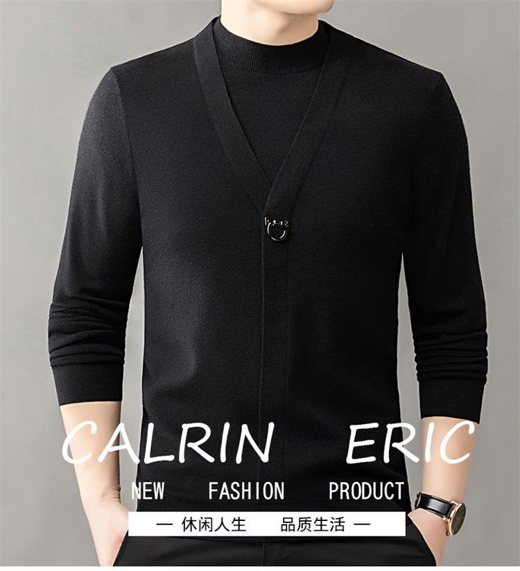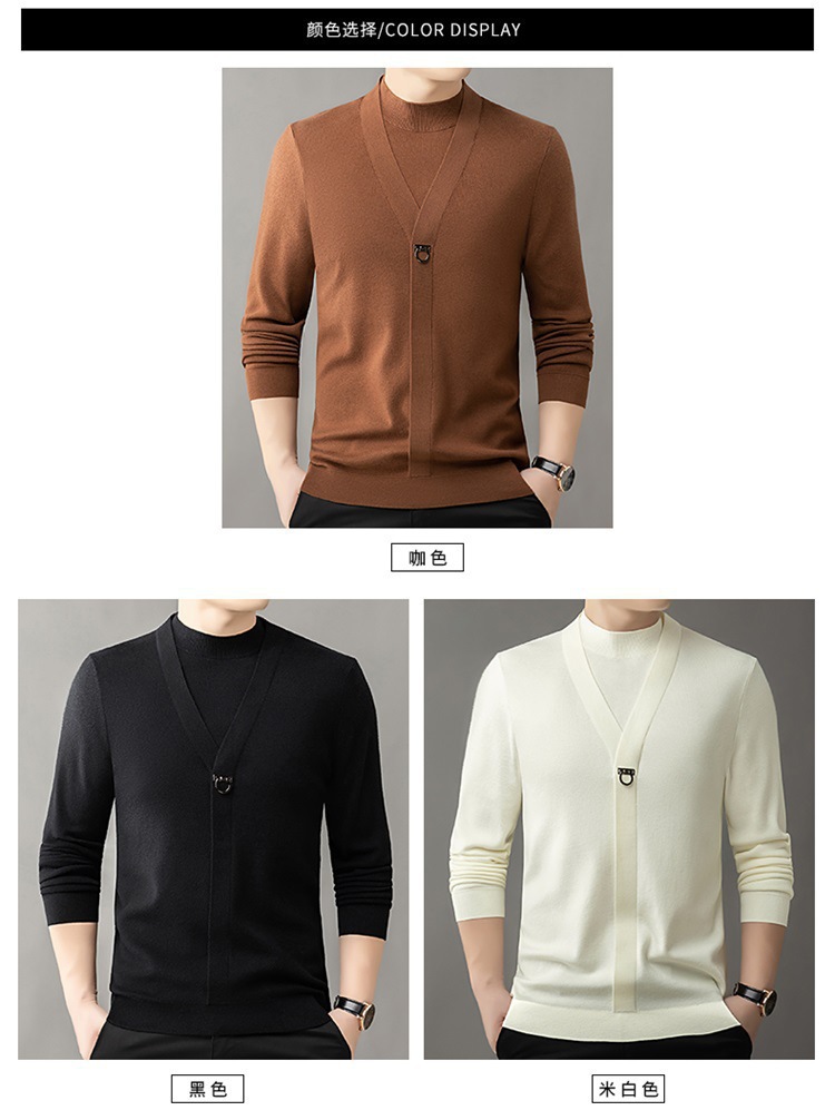 跨境春秋男式针织衫半高领假两件毛衣现货套头修身韩版保暖衫