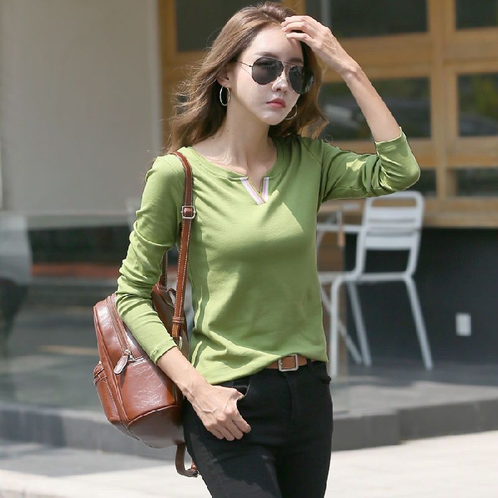 2023 가을 뉴 코튼 브이넥 긴팔 티셔츠 여성용 한국식 슬림핏 학생용 베이스 셔츠
