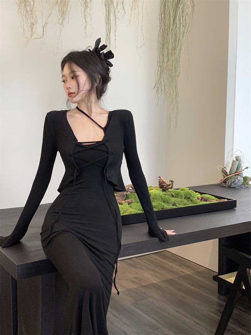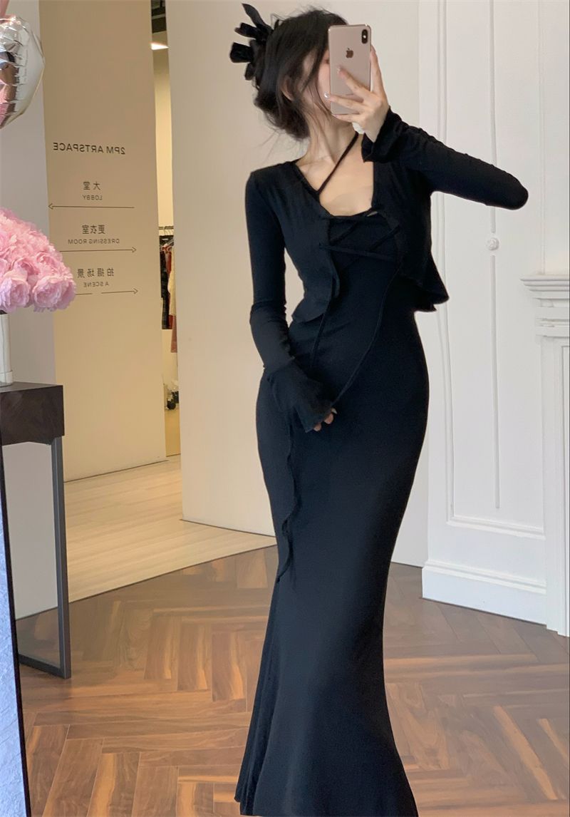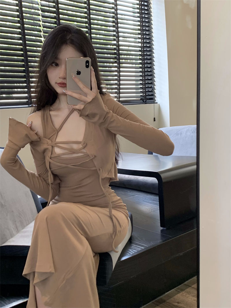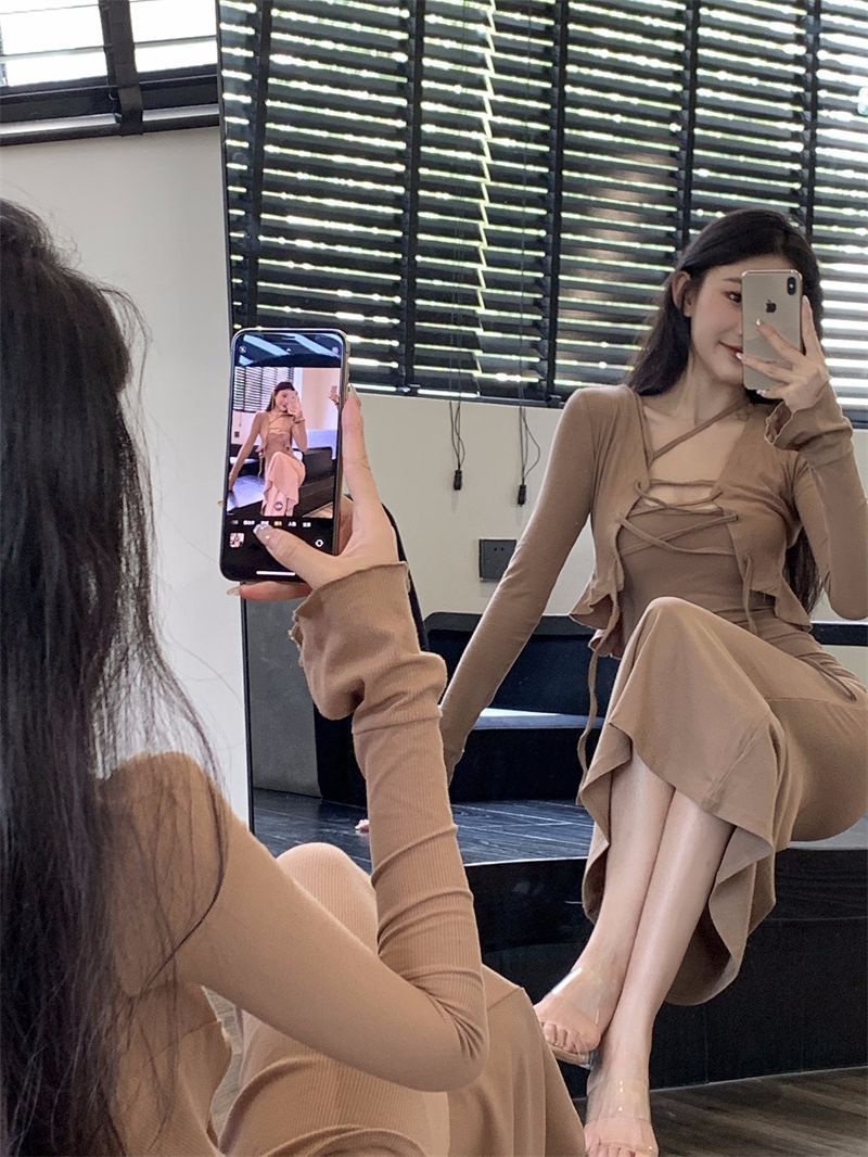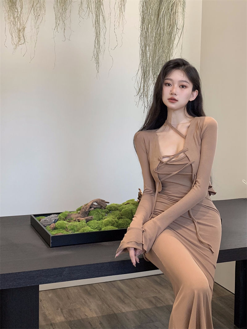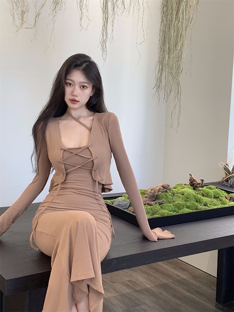 순수한 원하는 슬링 원피스 여자의 가을 카키 뜨거운 소녀 허리 우아한 엉덩이 중간 길이 피쉬 테일 스커트