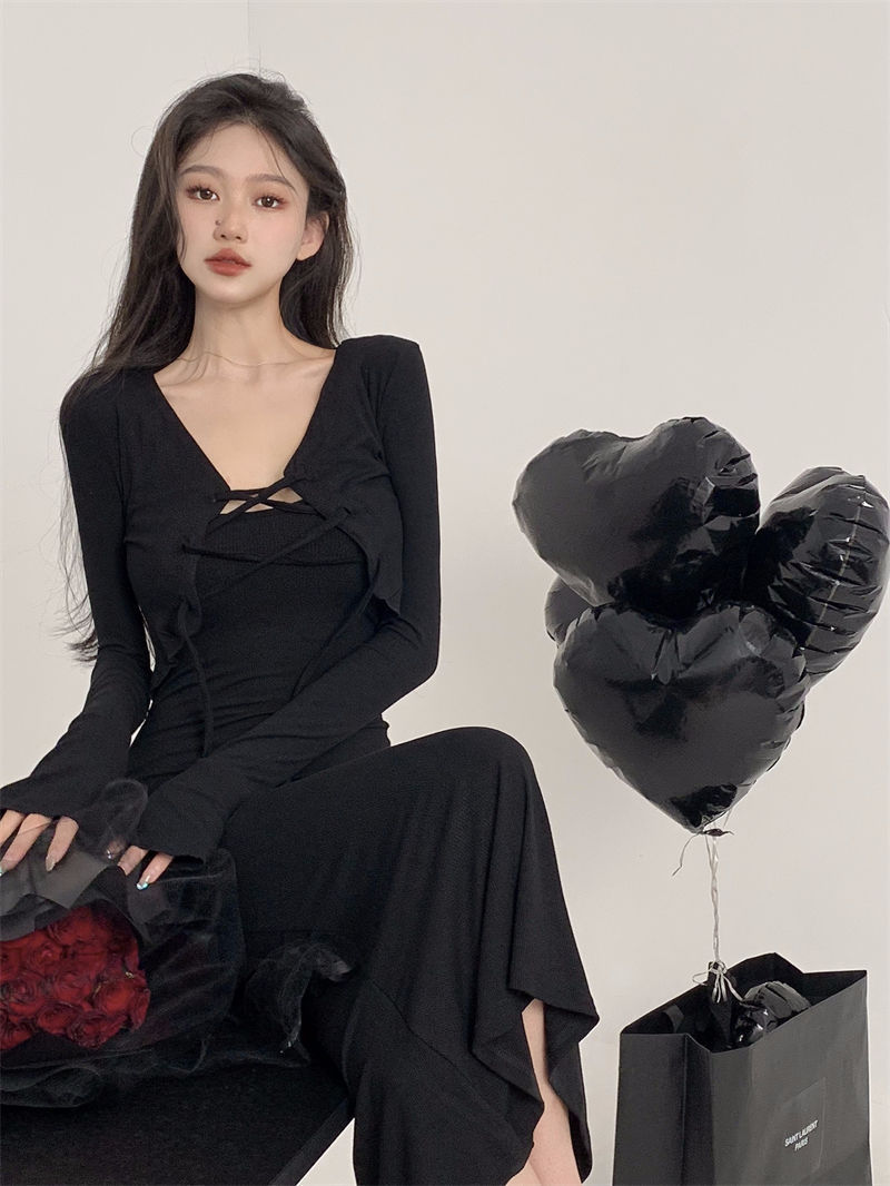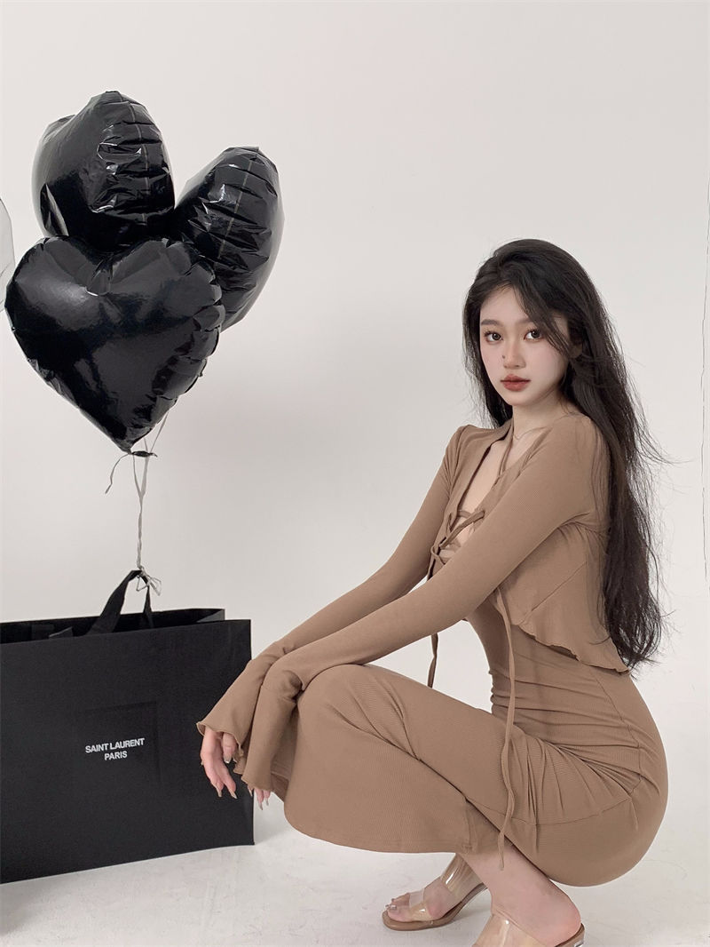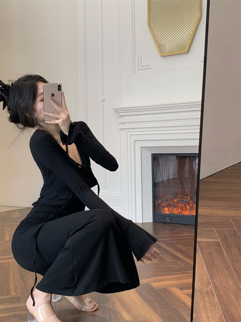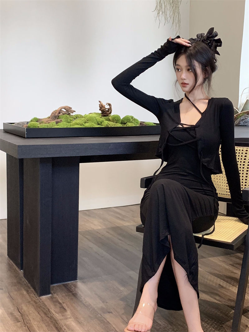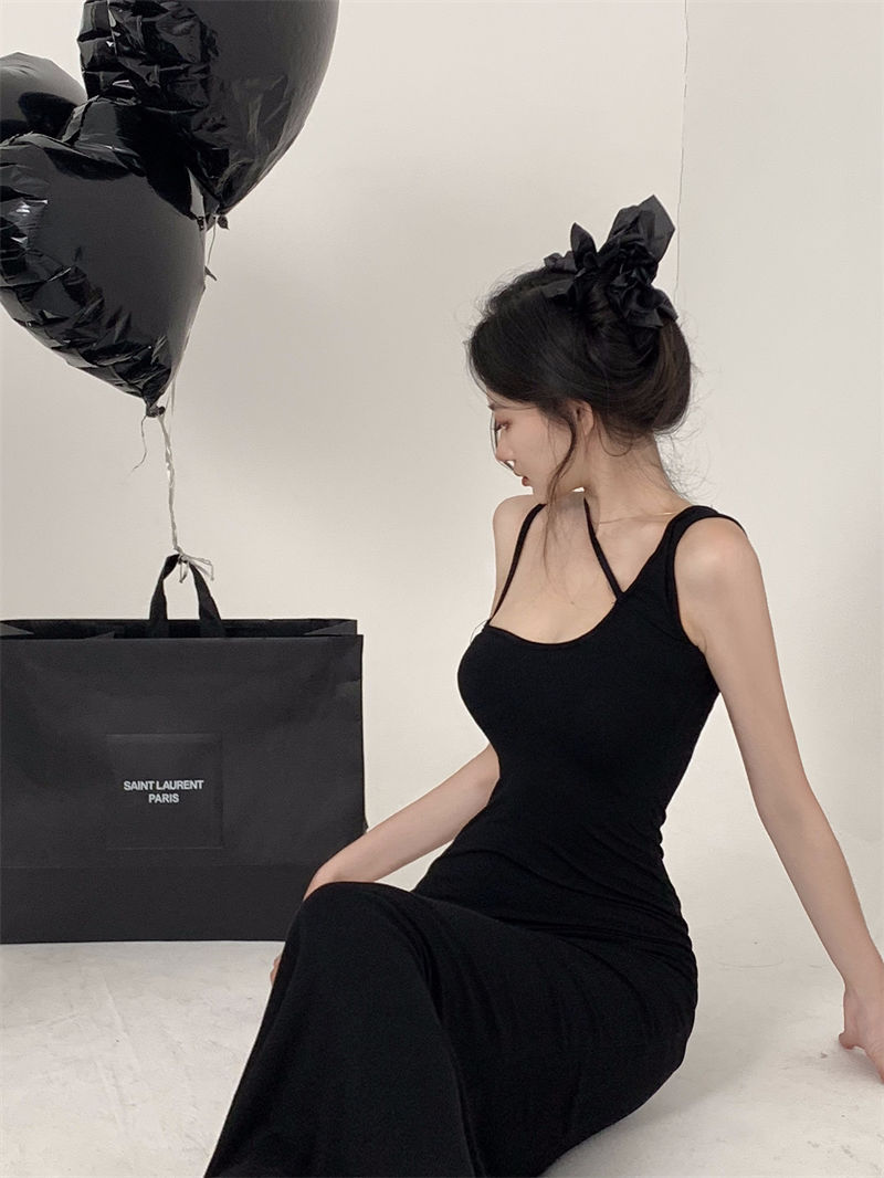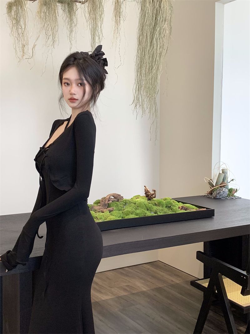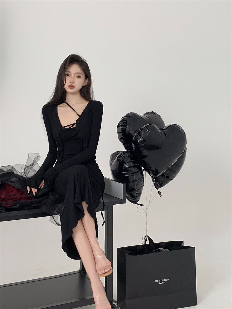순수한 원하는 슬링 원피스 여자의 가을 카키 뜨거운 소녀 허리 우아한 엉덩이 중간 길이 피쉬 테일 스커트