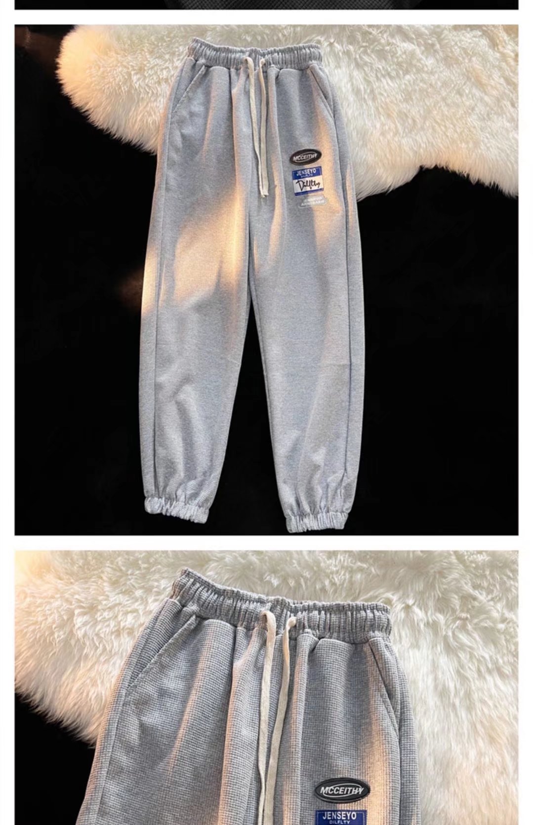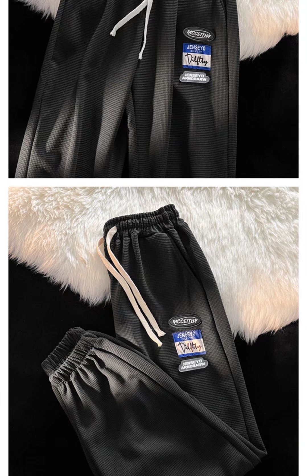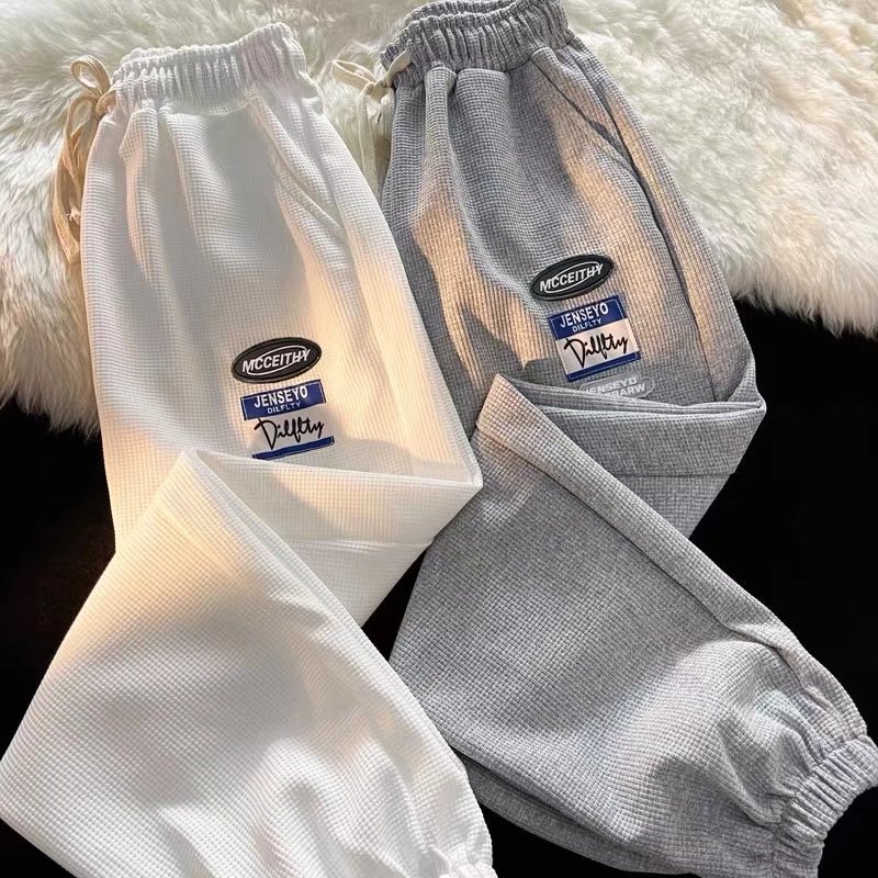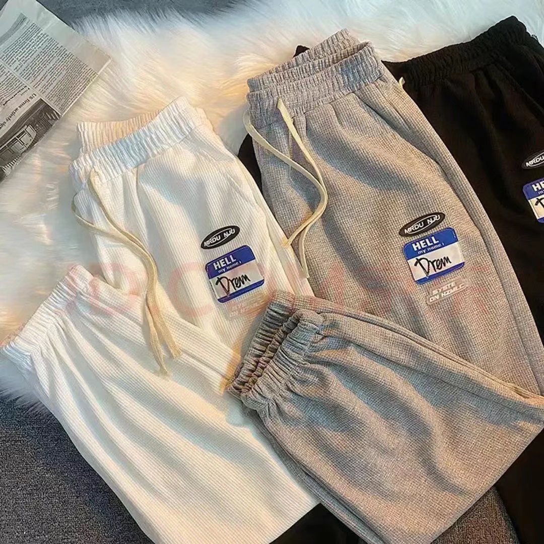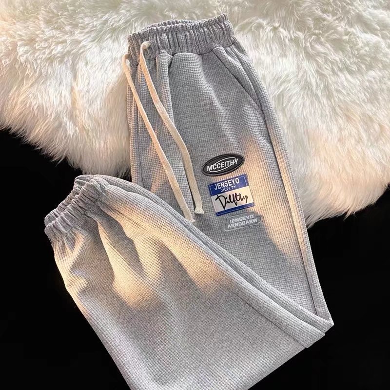 바지 남성 캐주얼 바지 모든 매치 봄 신상품 와플 홍콩 스타일 트렌디 한 다리 묶인 바지 하이 스트리트 스포츠 바지
