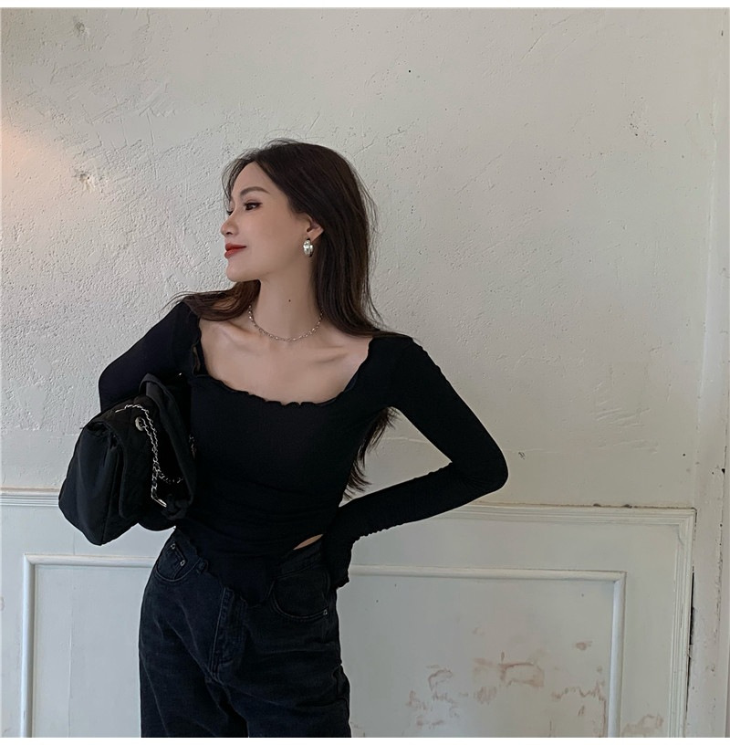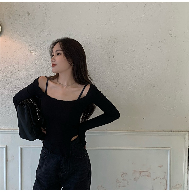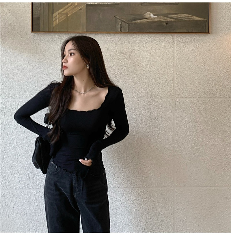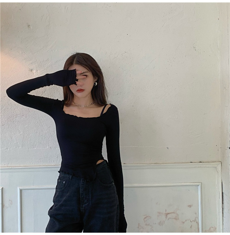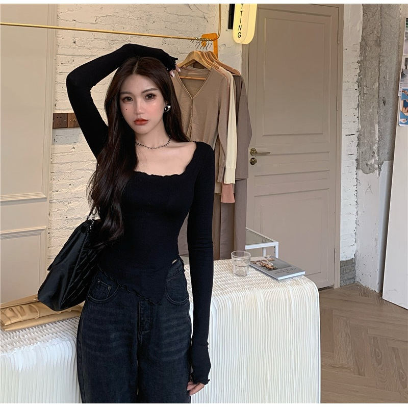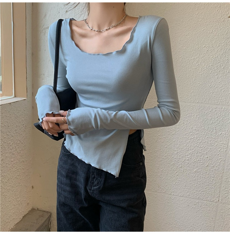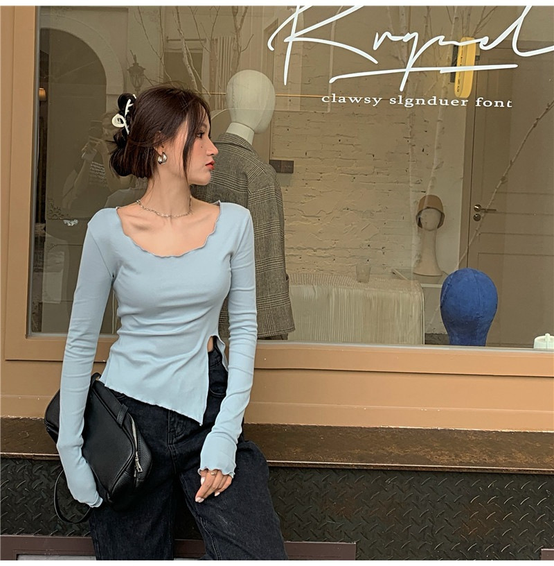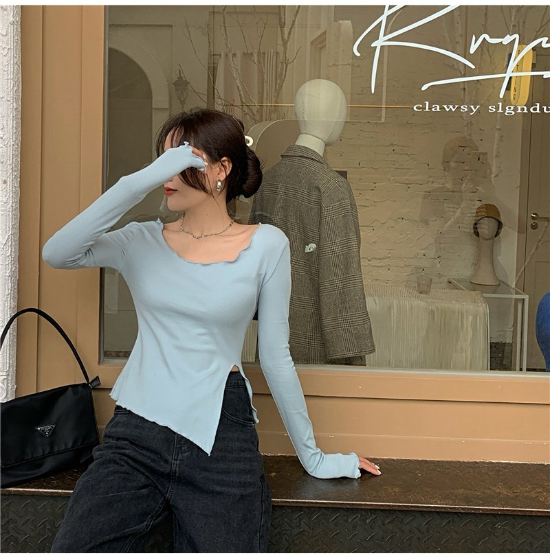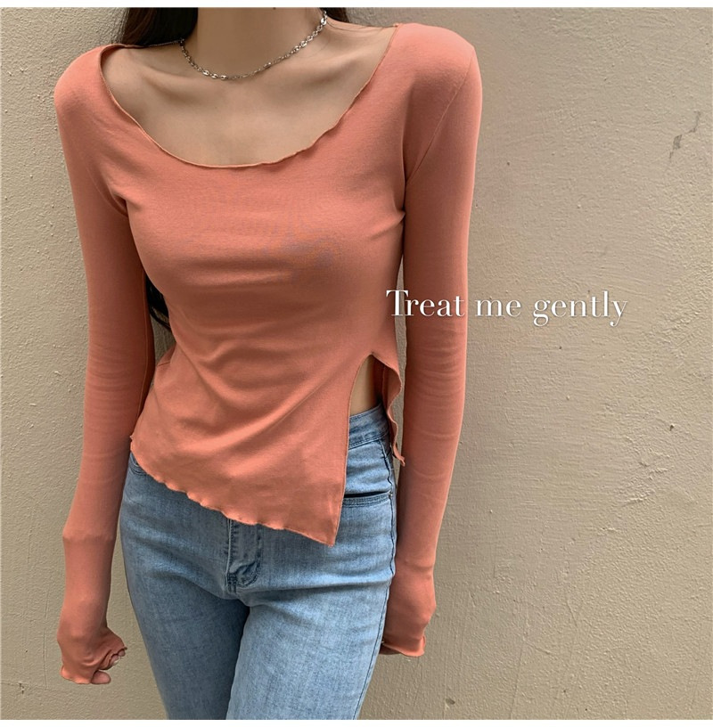 밀크 실크 단색 티셔츠 여성용 짧은 불규칙한 슬림 스플릿 긴 소매 이너베이스 셔츠스토어 가기