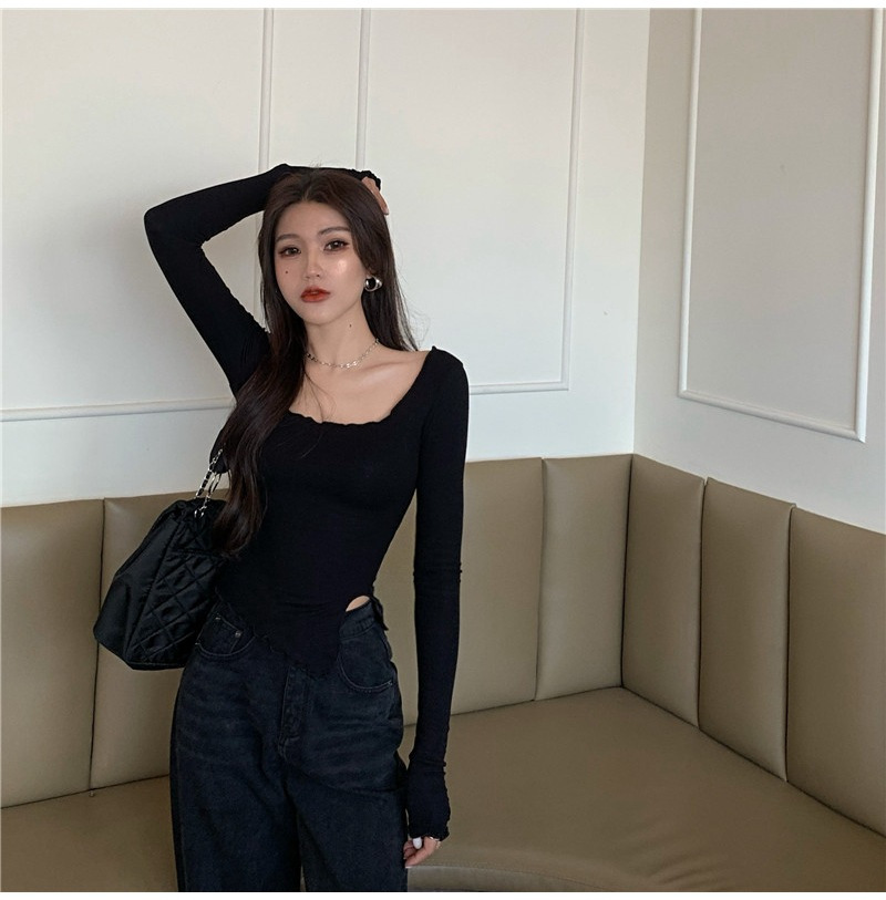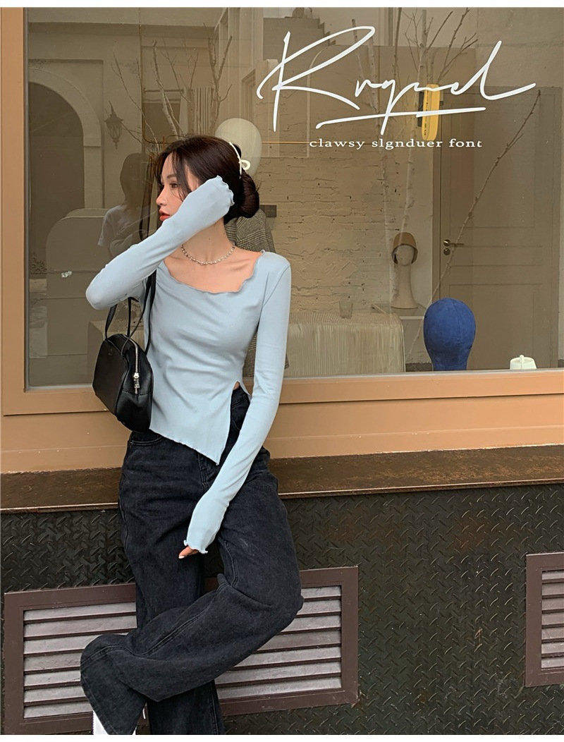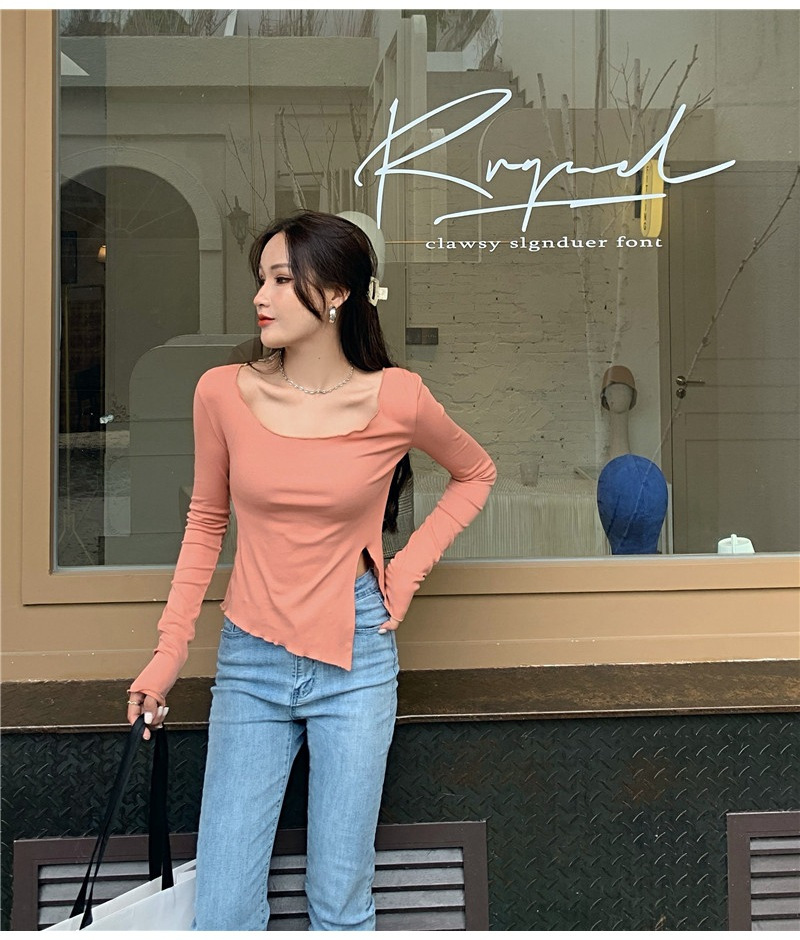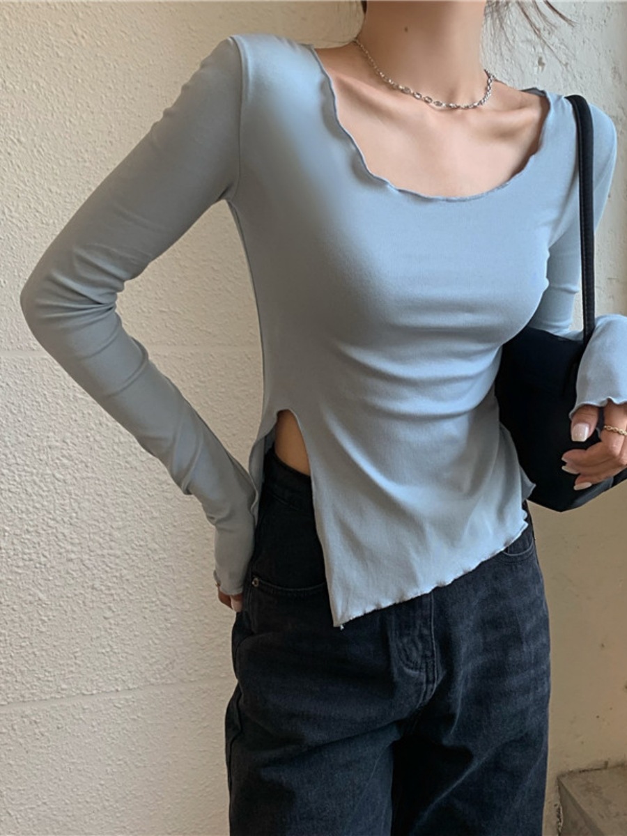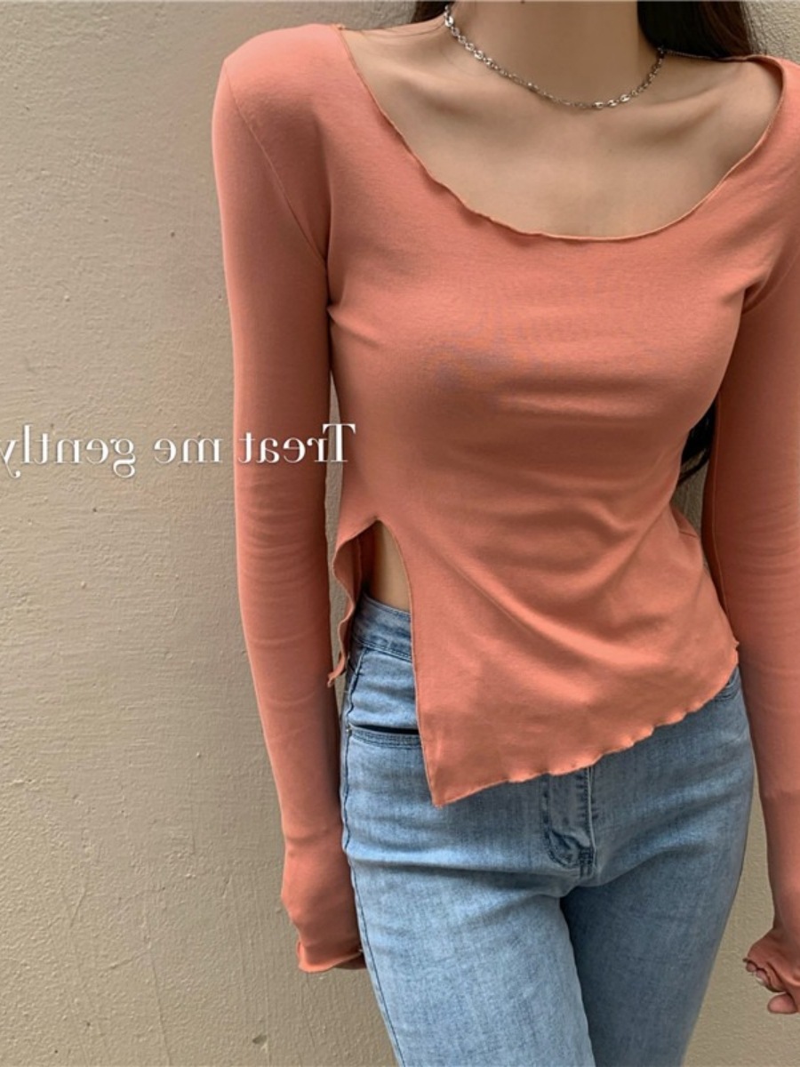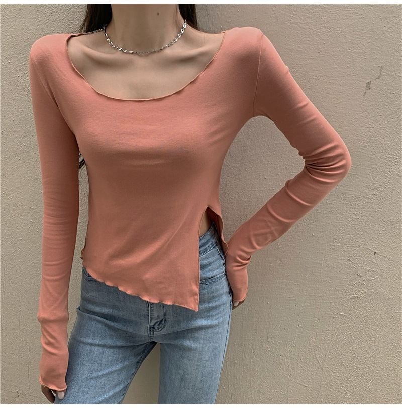 밀크 실크 단색 티셔츠 여성용 짧은 불규칙한 슬림 스플릿 긴 소매 이너베이스 셔츠