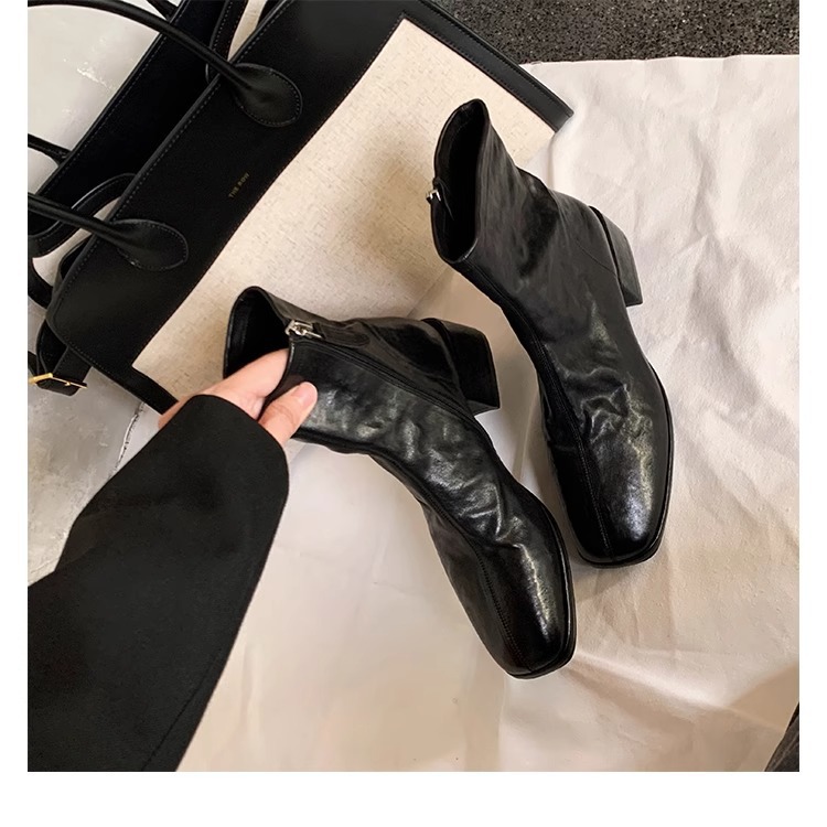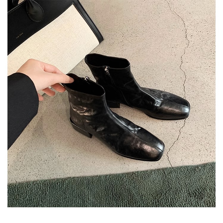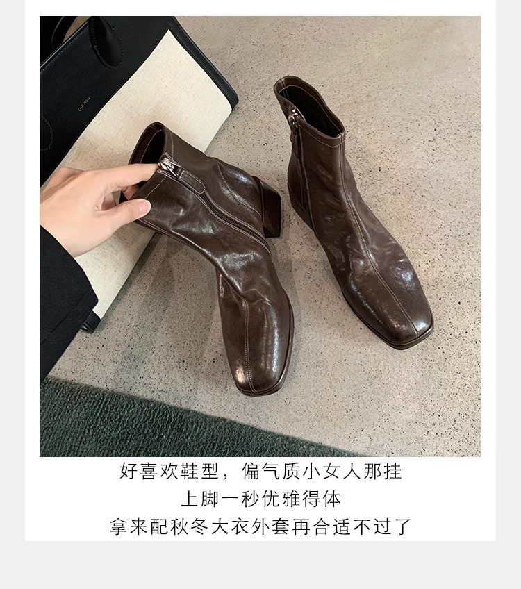 고급 감각 소가죽 버전 ~ 가을과 겨울의 포도 엄마 스퀘어 헤드 워싱 말 가죽 얇은 짧은 부츠 여성용 두꺼운 뒤꿈치 작은 발목 부츠