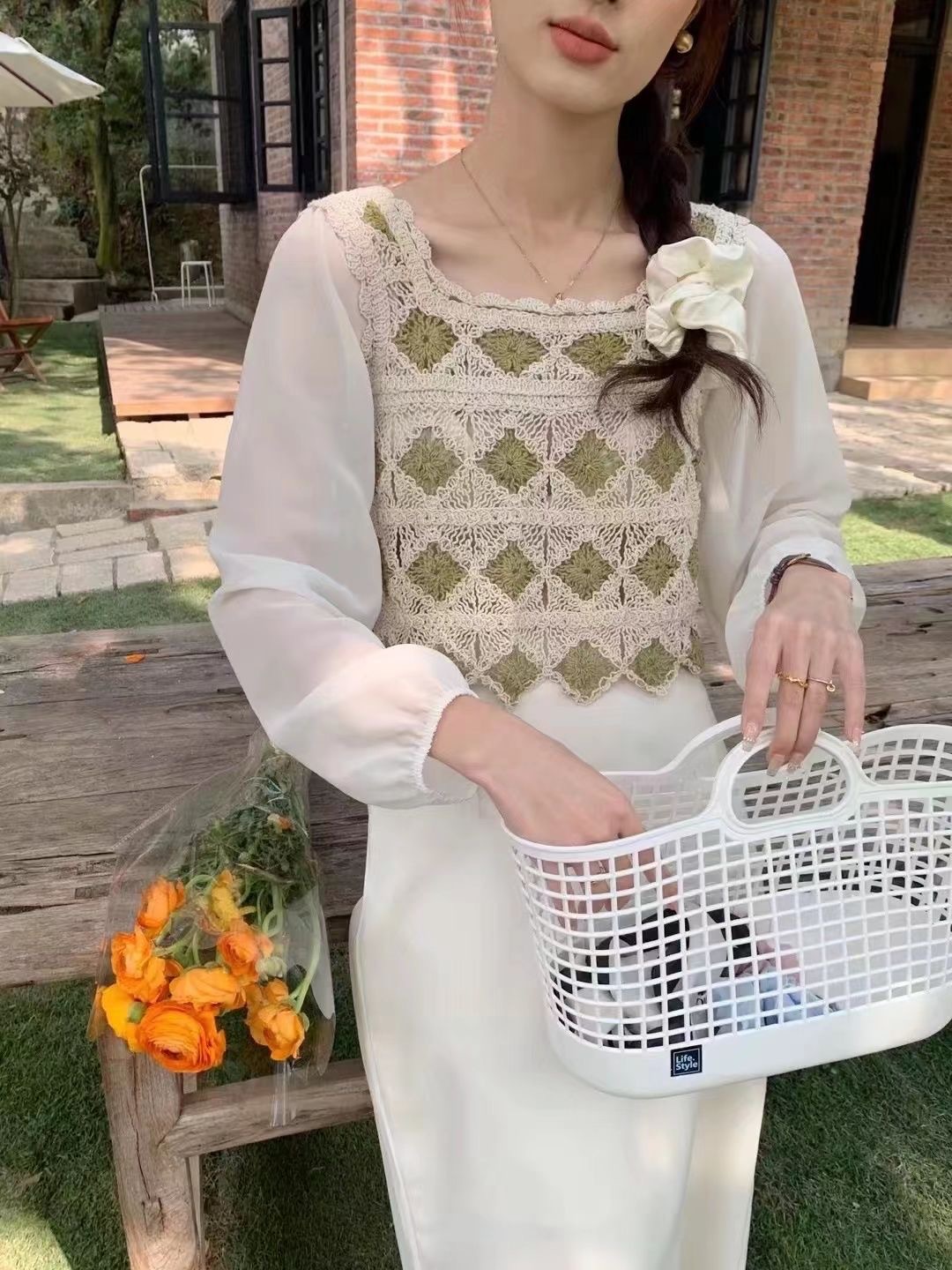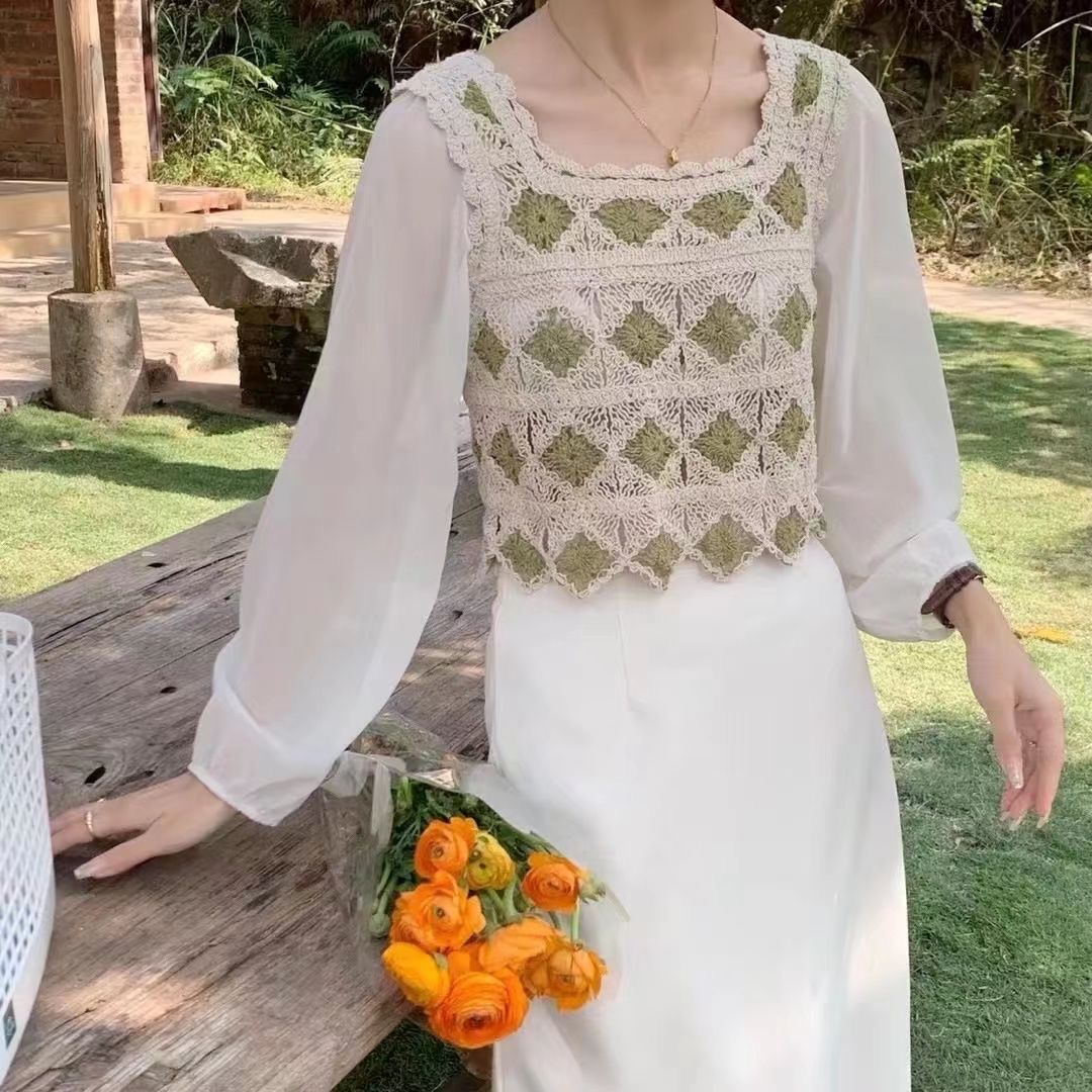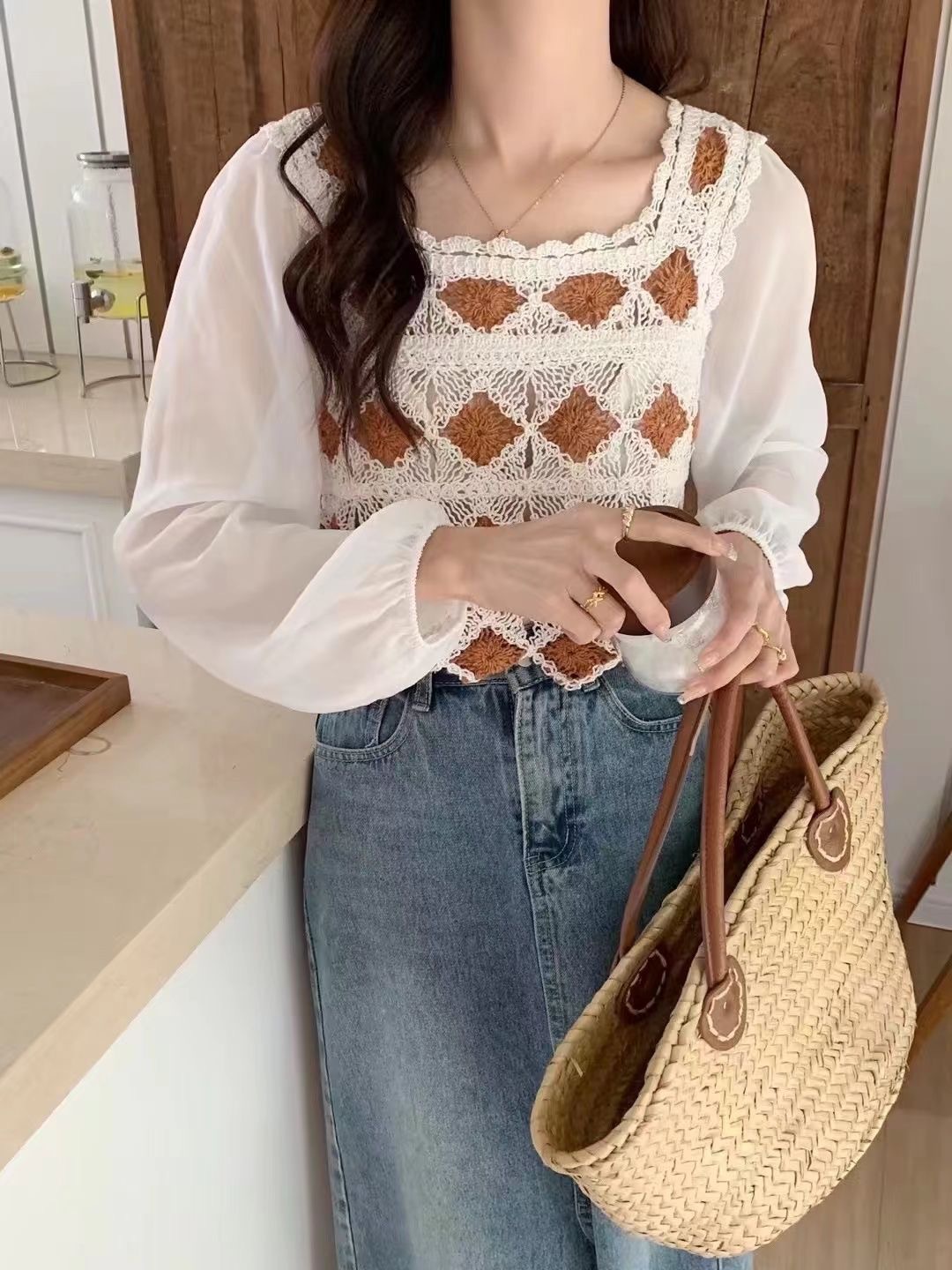 한국 스타일 심플 스위트 스퀘어 칼라 중공 크로 셰 뜨개질 바느질 디자인 틈새 긴 소매 퍼프 슬리브 짧은 쉬폰 셔츠 여성용