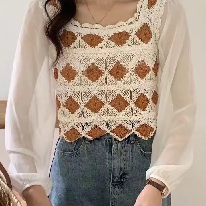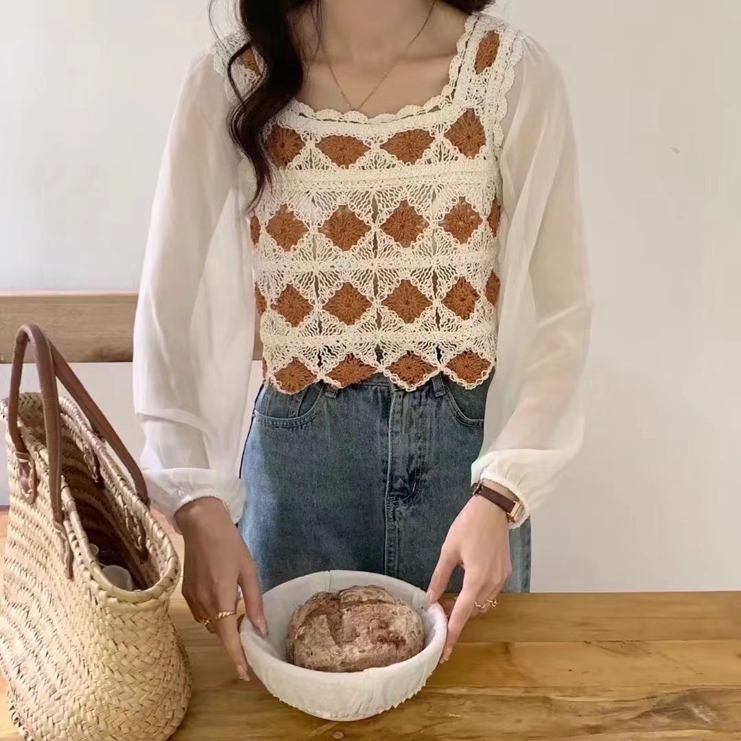 한국 스타일 심플 스위트 스퀘어 칼라 중공 크로 셰 뜨개질 바느질 디자인 틈새 긴 소매 퍼프 슬리브 짧은 쉬폰 셔츠 여성용스토어 가기