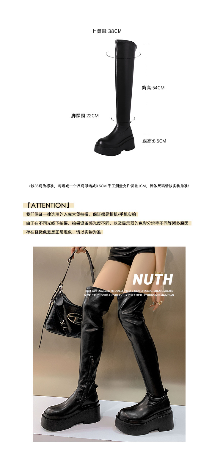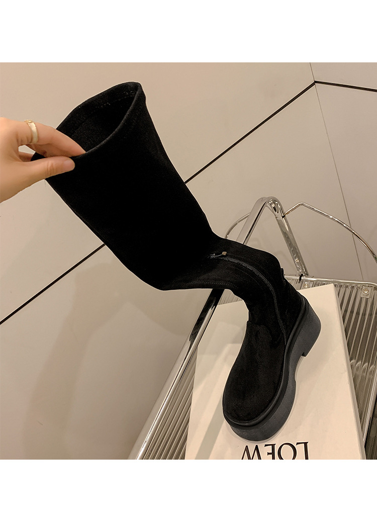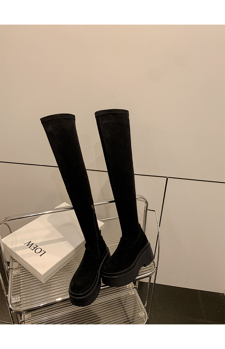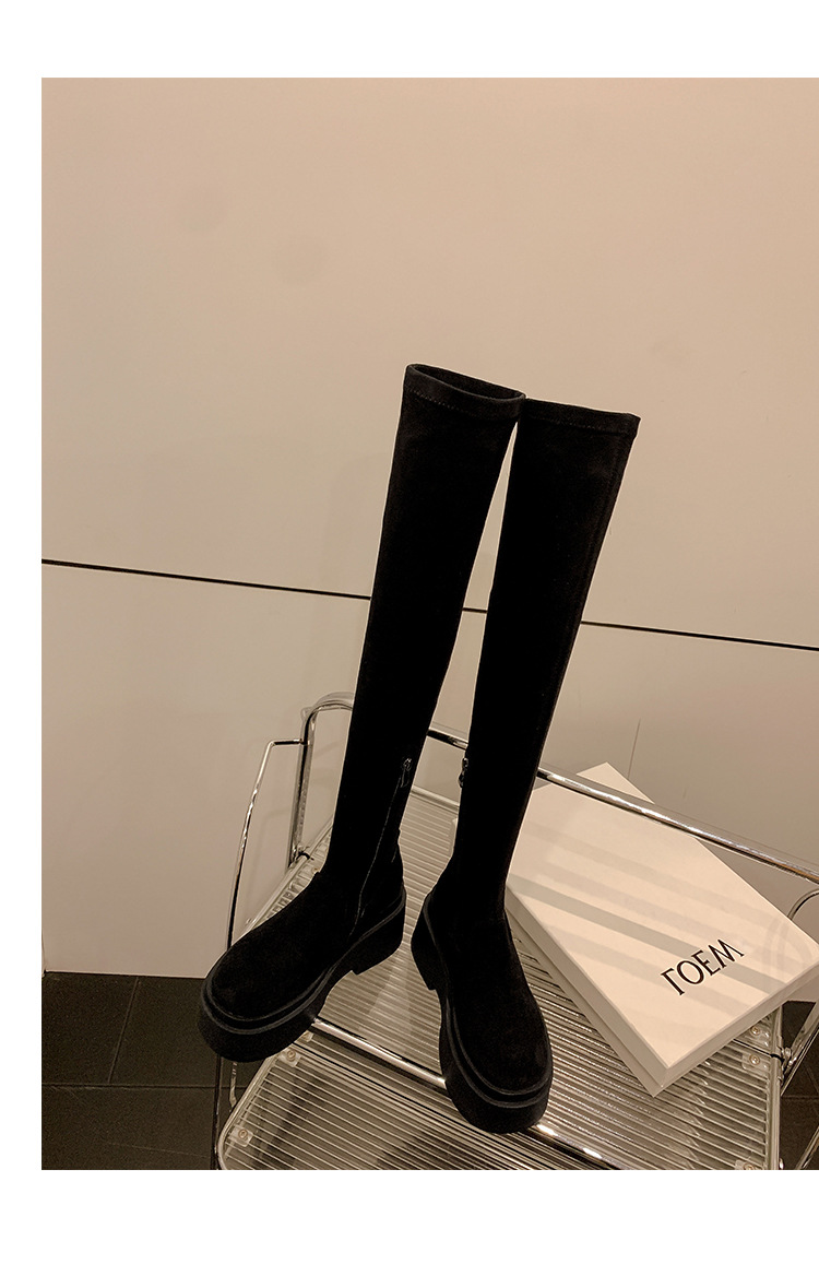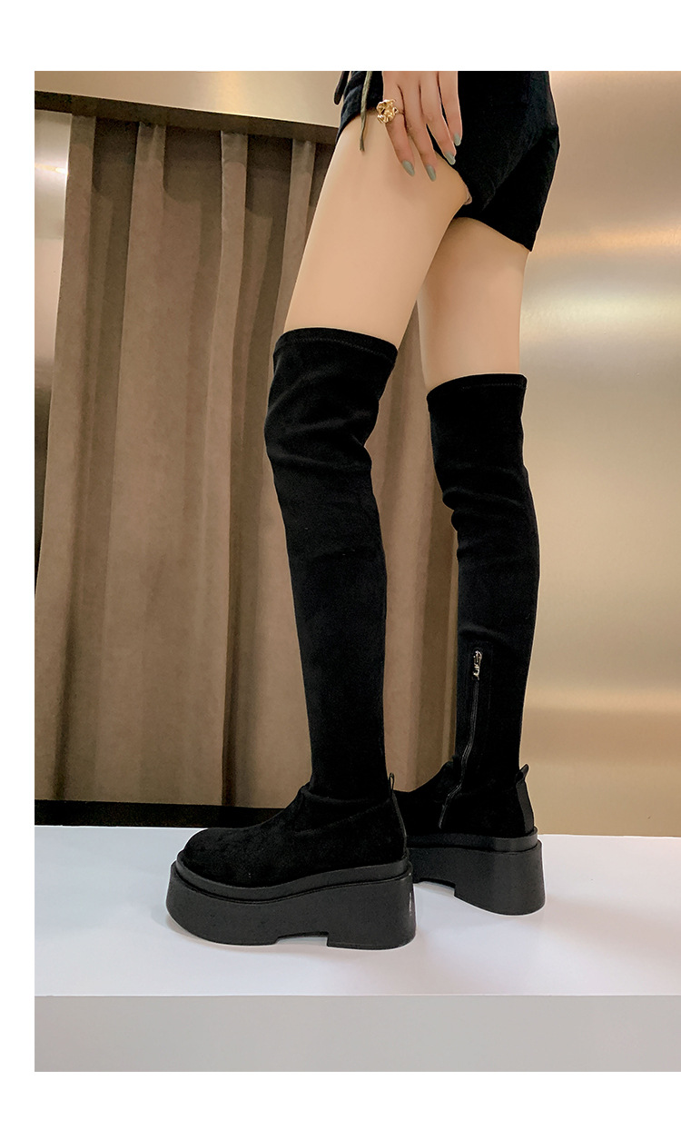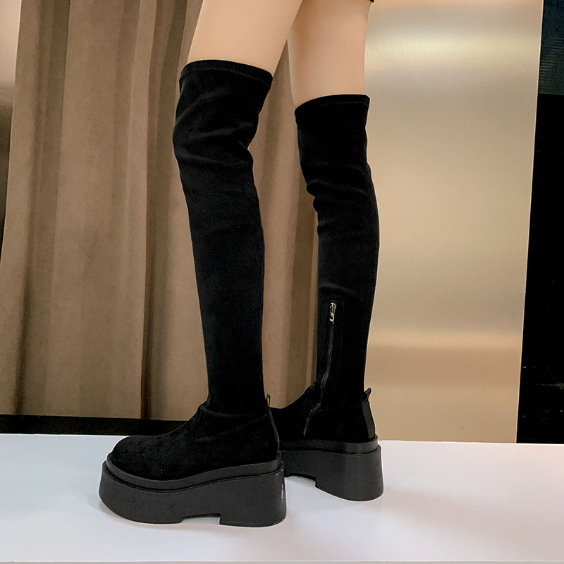 Qiumeier 두꺼운 밑창 무릎 위 롱 부츠 여성용 스웨이드 슬리밍 탄성 롱 부츠 봄과 가을 대형 튜브 라운드 두꺼운 다리 싱글 하이 튜브스토어 가기