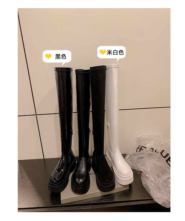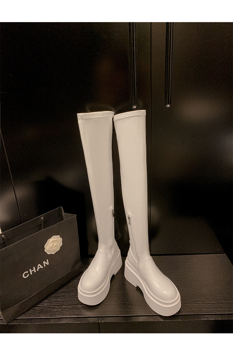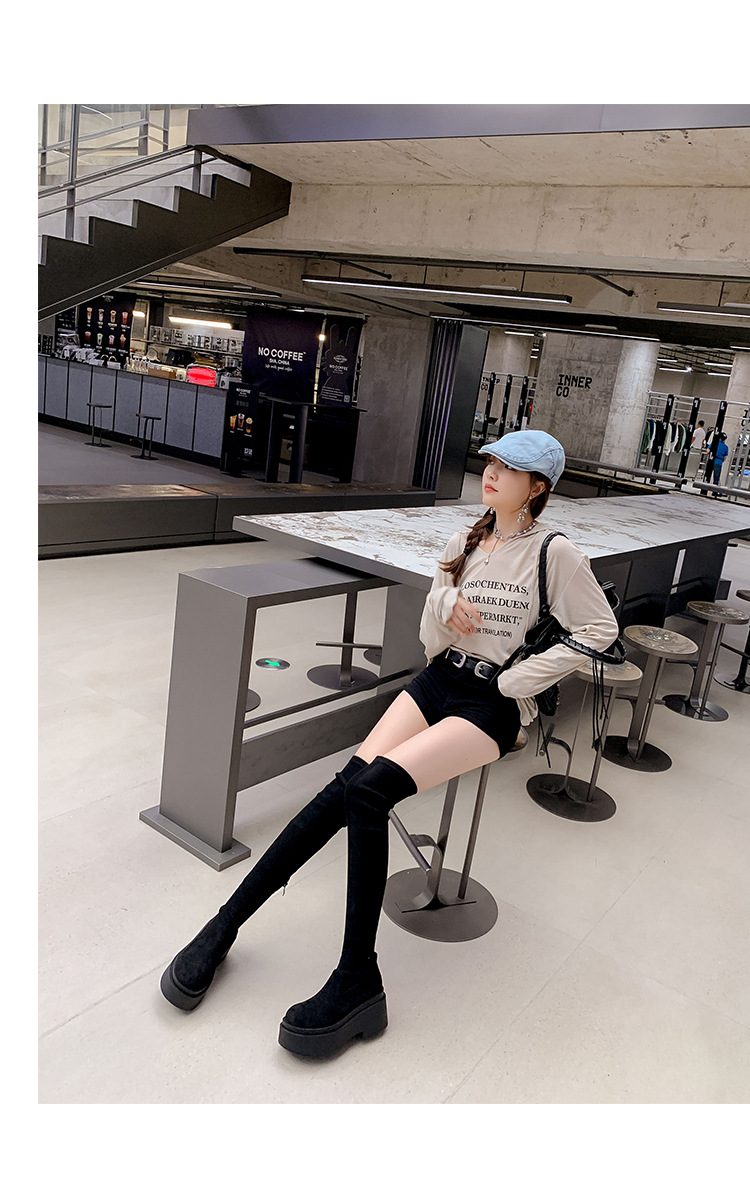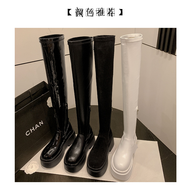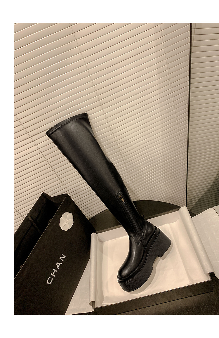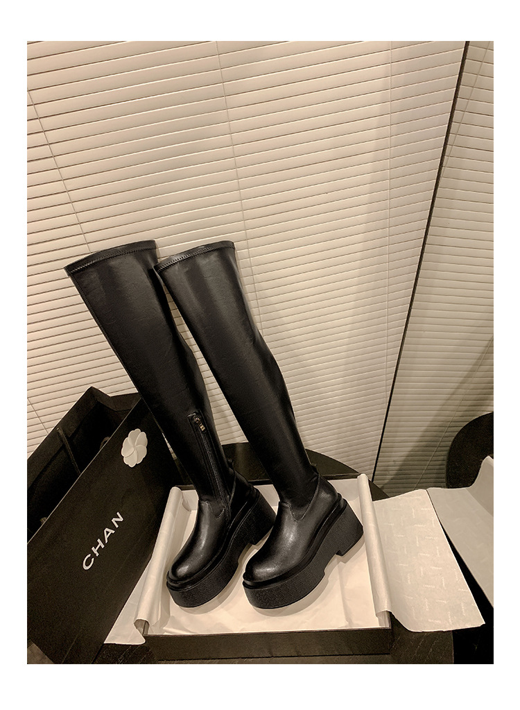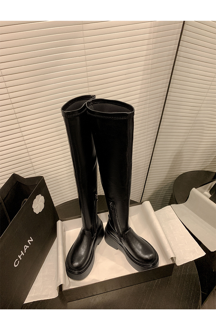 Qiumeier 두꺼운 밑창 무릎 위 롱 부츠 여성용 스웨이드 슬리밍 탄성 롱 부츠 봄과 가을 대형 튜브 라운드 두꺼운 다리 싱글 하이 튜브스토어 가기