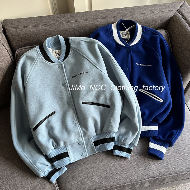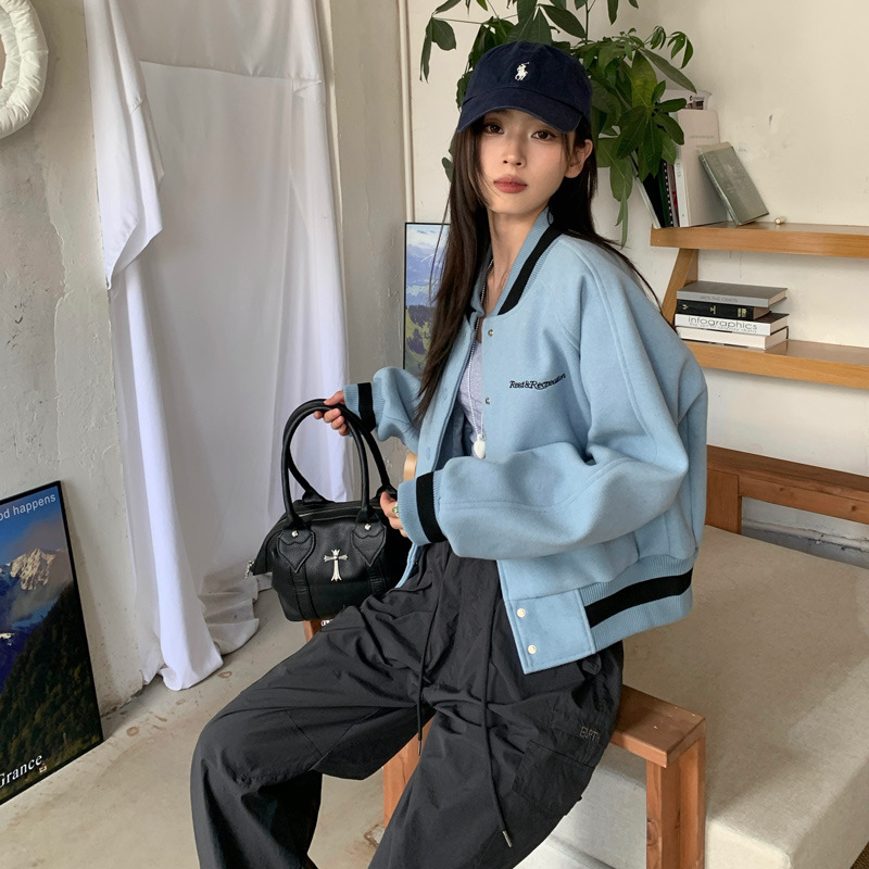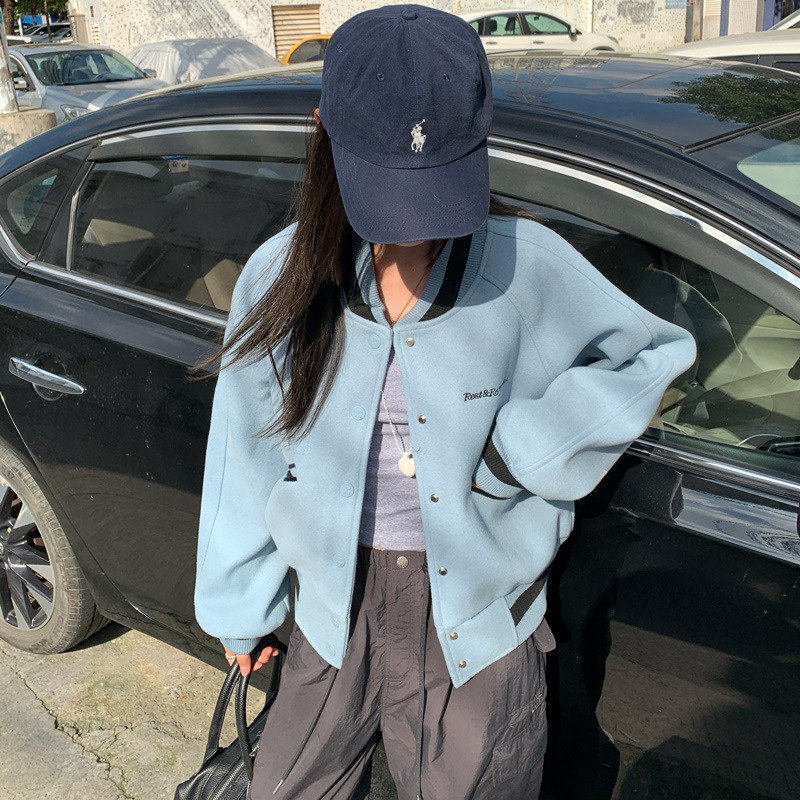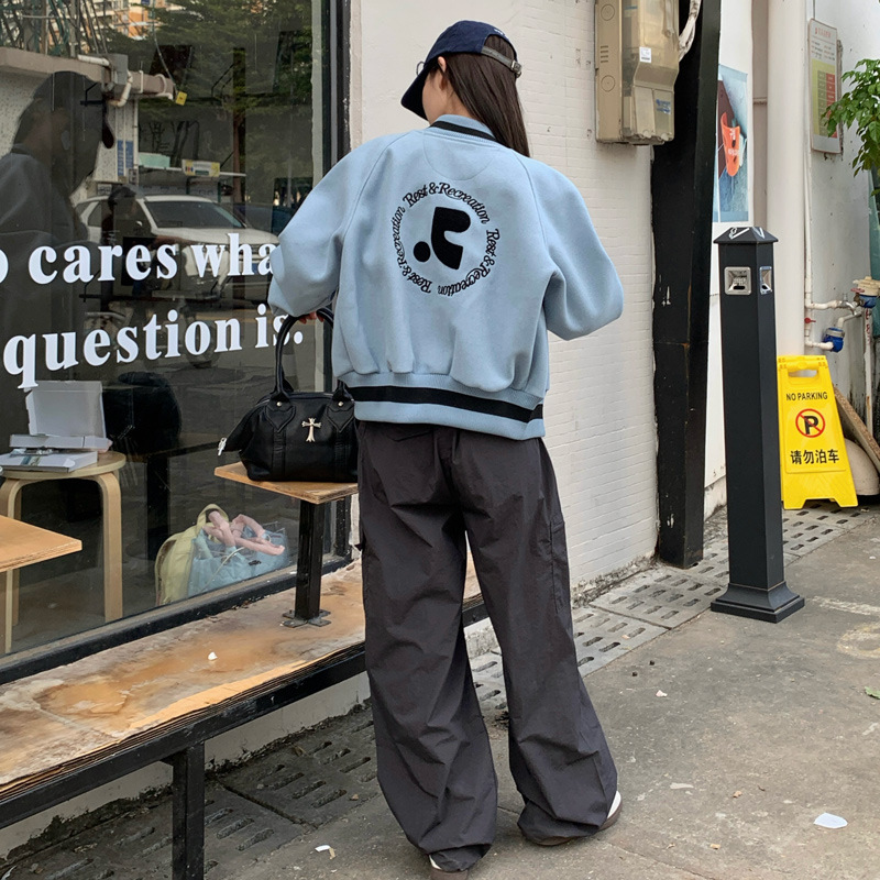 한국의 틈새 트렌드 브랜드 25 봄 신상 울 베이스볼 재킷 여성용 RR 백 로고 루즈핏 재킷