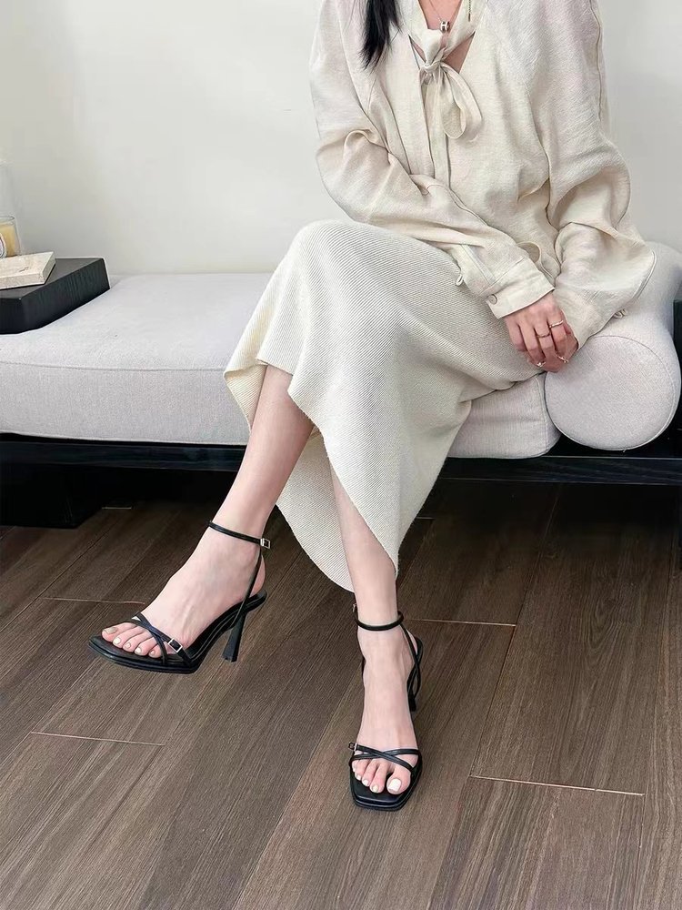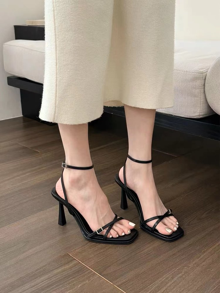 여성을위한 대외 무역 프랑스 샌들 2024 새로운 패션 여성 한 단어 스트랩 하이힐 스틸레토 스커트 여성 신발 도매스토어 가기