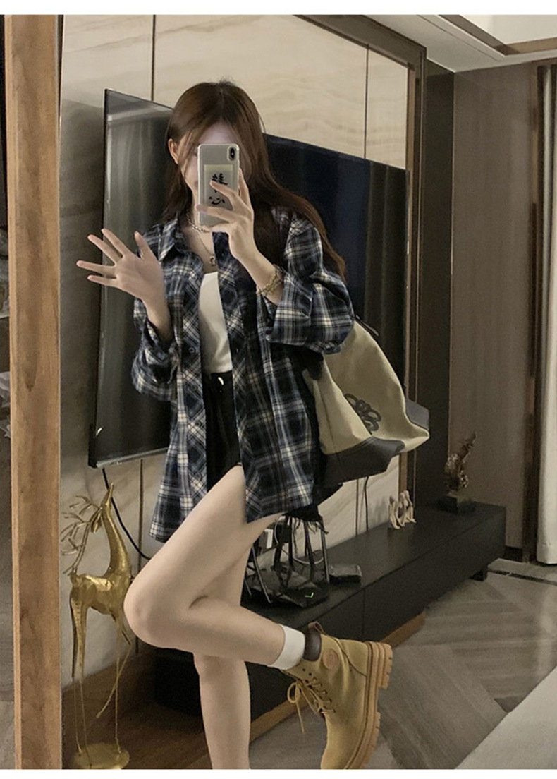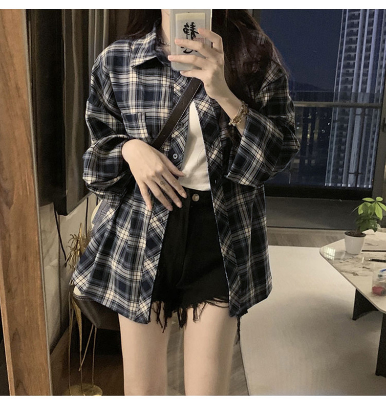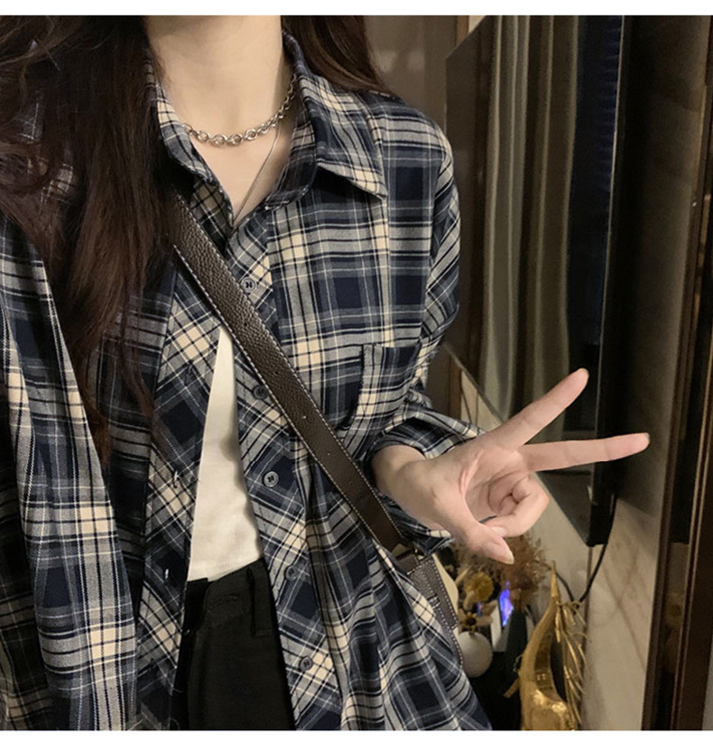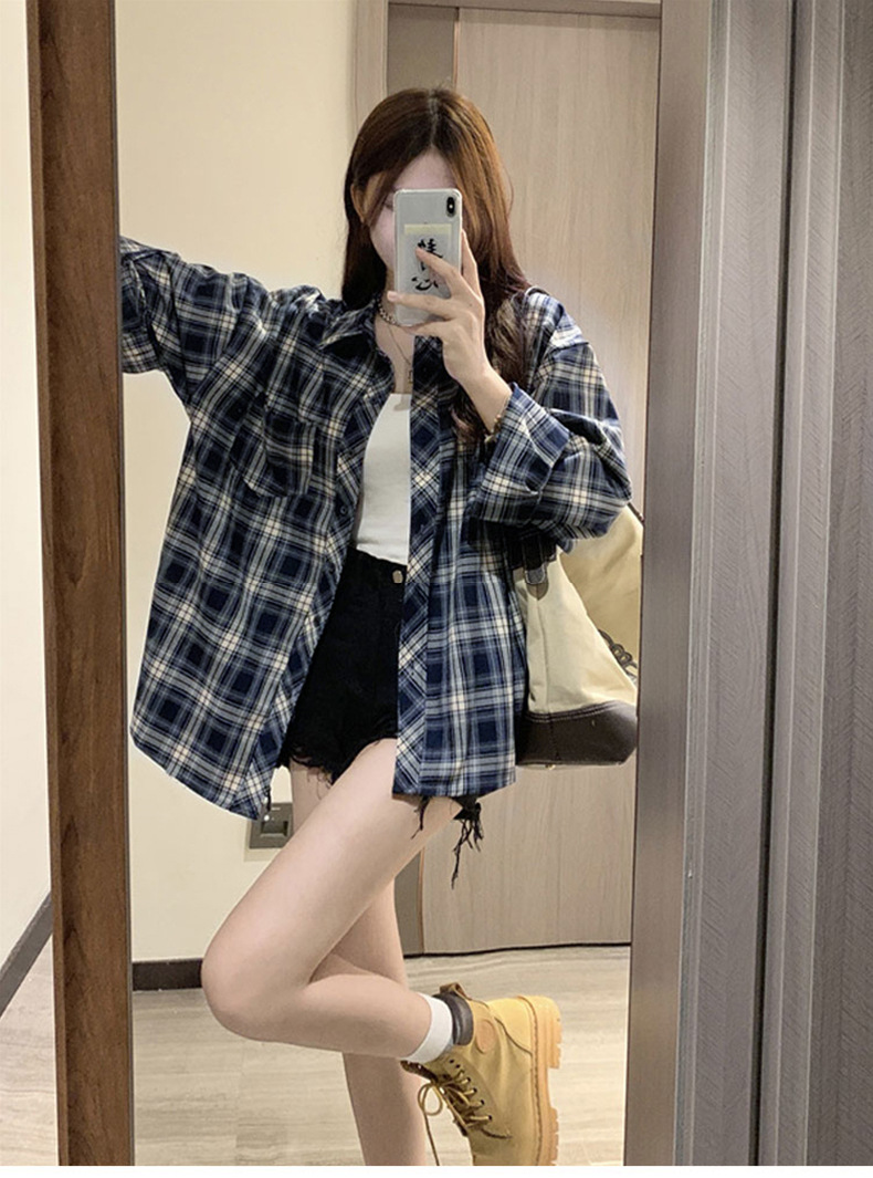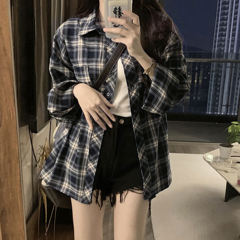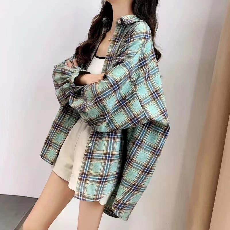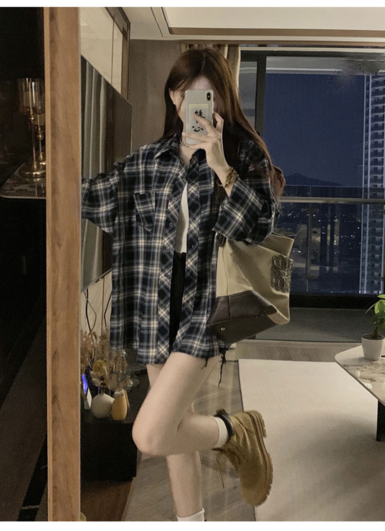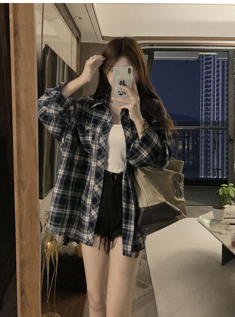 셔츠 코트 자외선 차단제 셔츠 얇은 이른 가을 긴팔 탑 하이 엔드 아메리칸 스타일 레트로 홍콩 스타일 여성용 격자 무늬 셔츠스토어 가기