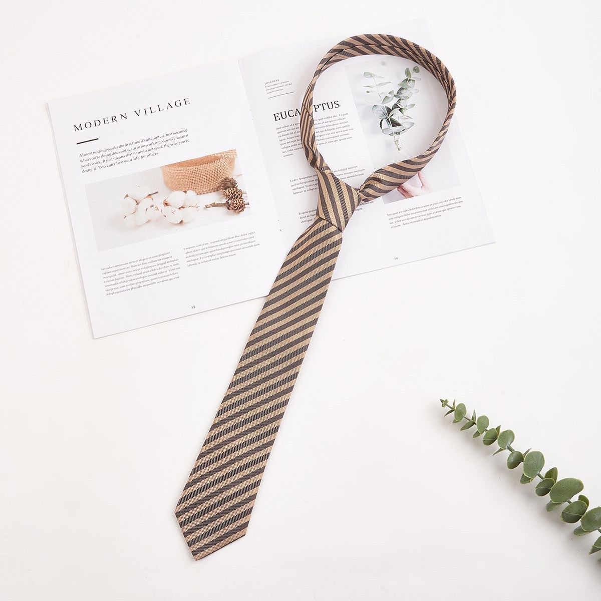 • 다크 브라운 흰색 줄무늬 손 넥타이