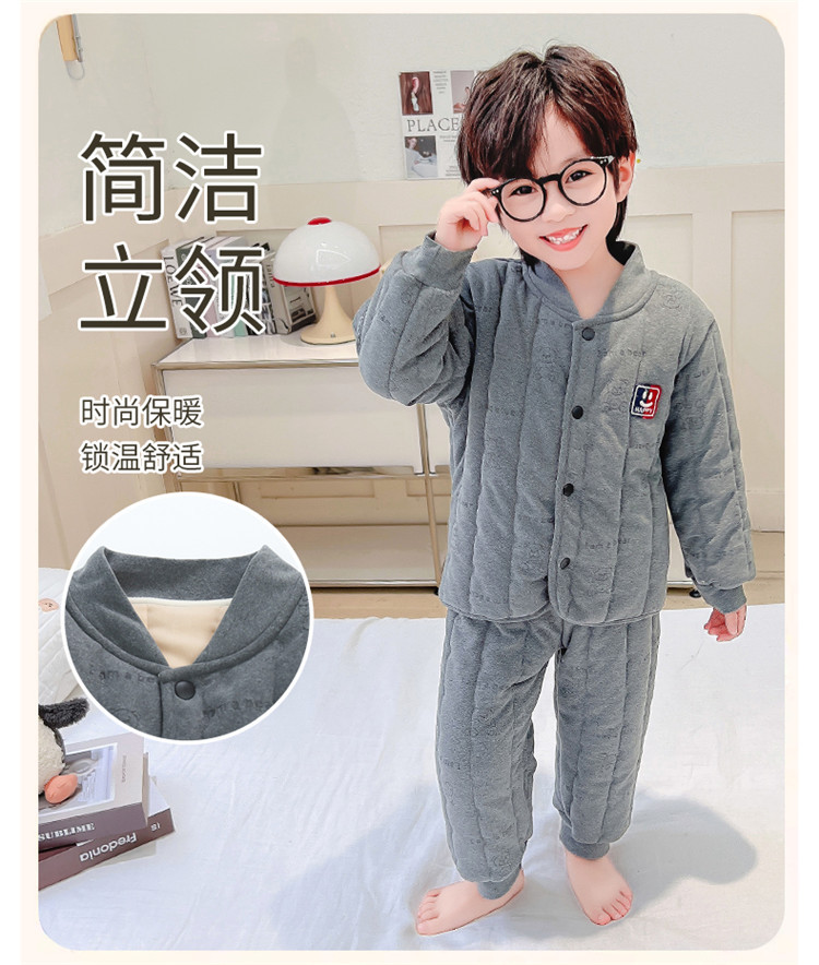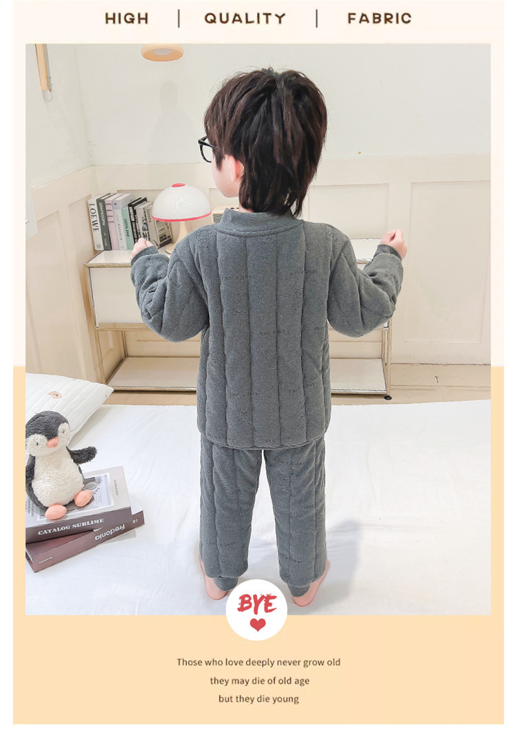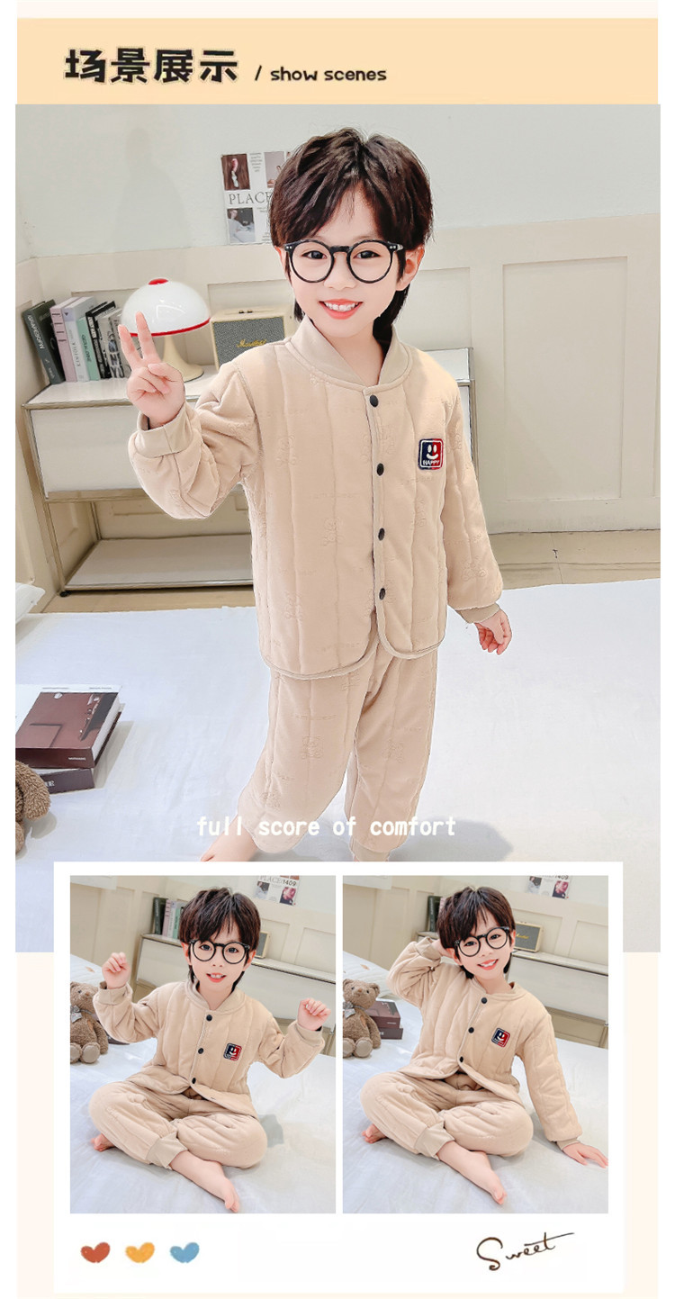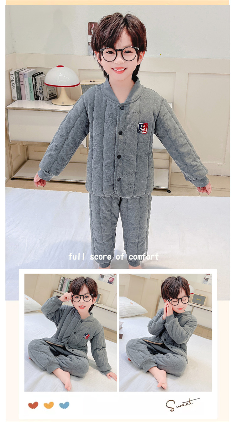 어린이 겨울 두꺼운 잠옷 한국식 소년 속옷 캐시미어 코튼 스탠드 칼라 홈 착용 3 층 퀼트 베이비 세트