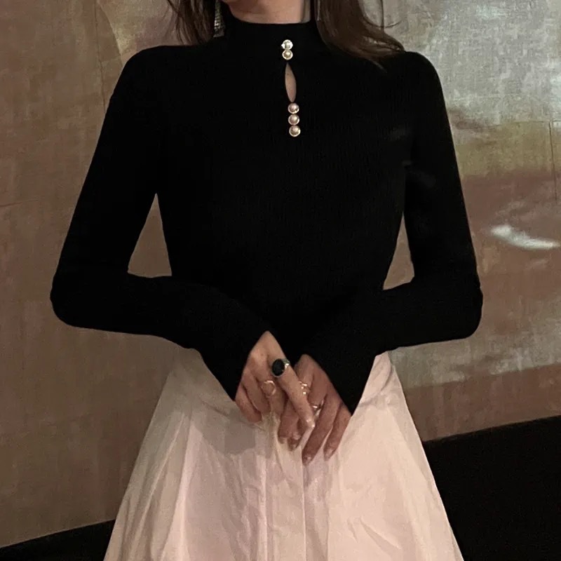 블랙 하프 하이 칼라 베이스 셔츠 여성의 가을과 겨울 스웨터 새로운 복고풍 부드러운 왁스 게으른 스타일 내부베이스 니트 탑