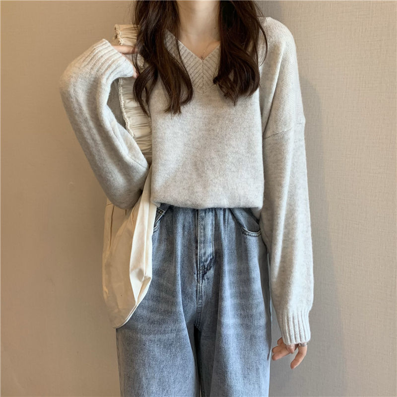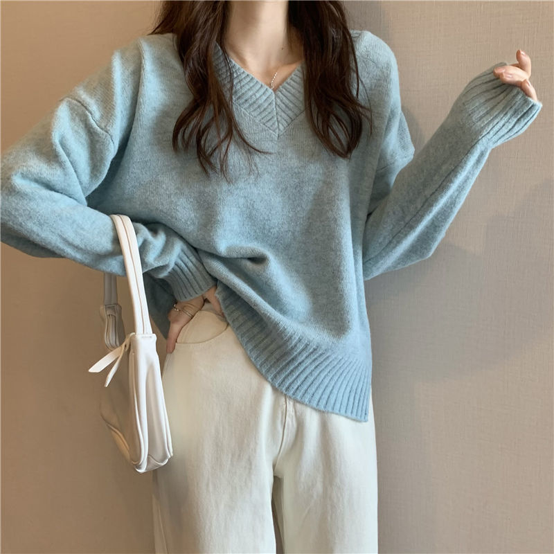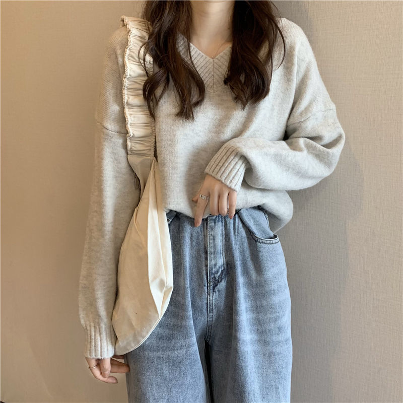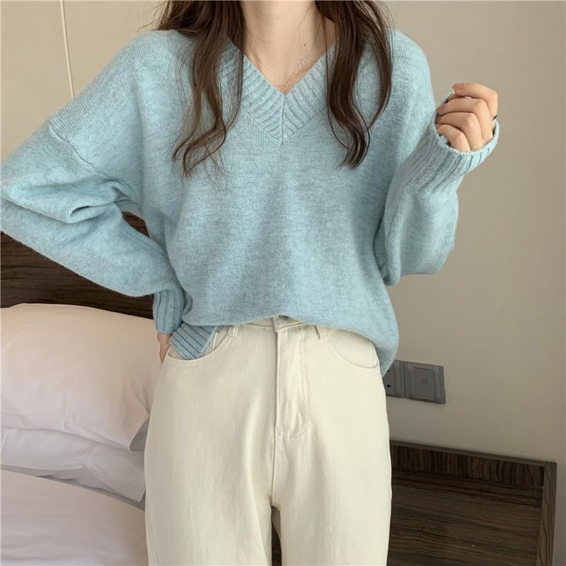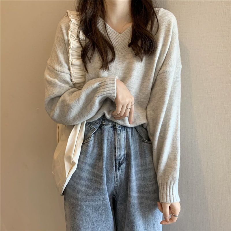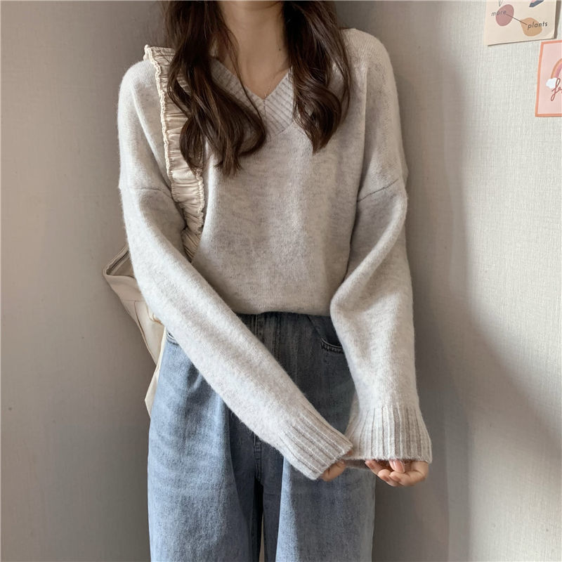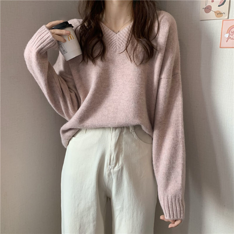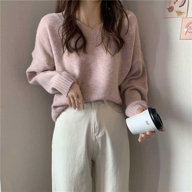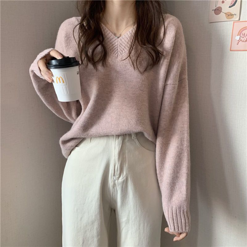 신상 한국 스타일 브이넥 순수하고 섹시한 고급 니트 스웨터 2024 방한 부드럽고 달콤한 루즈핏 니트웨어