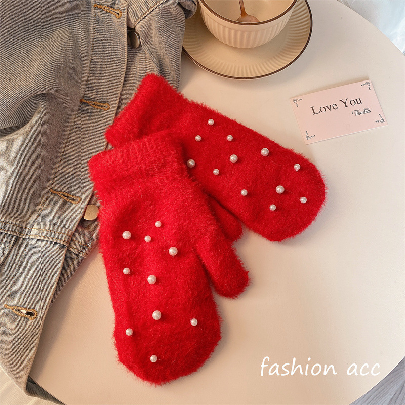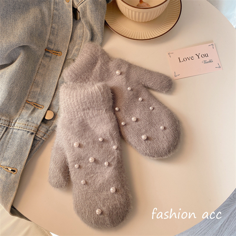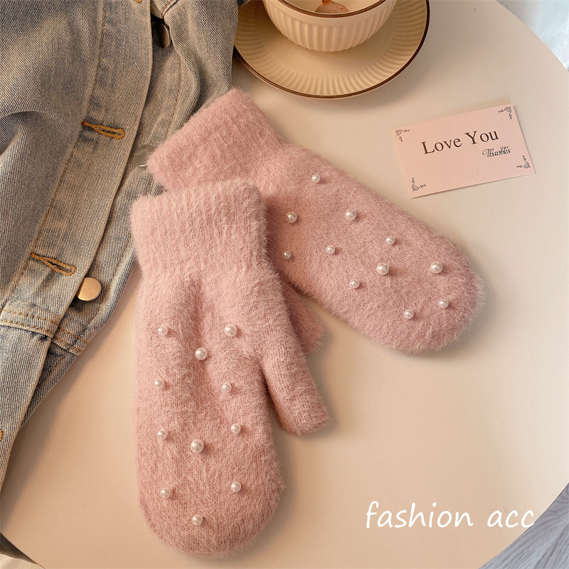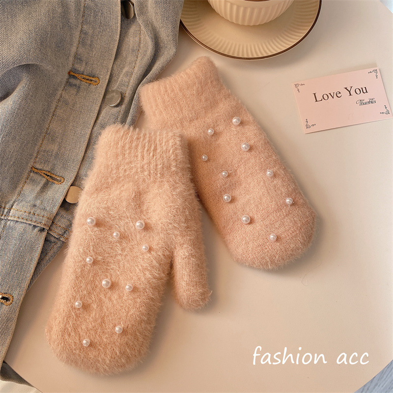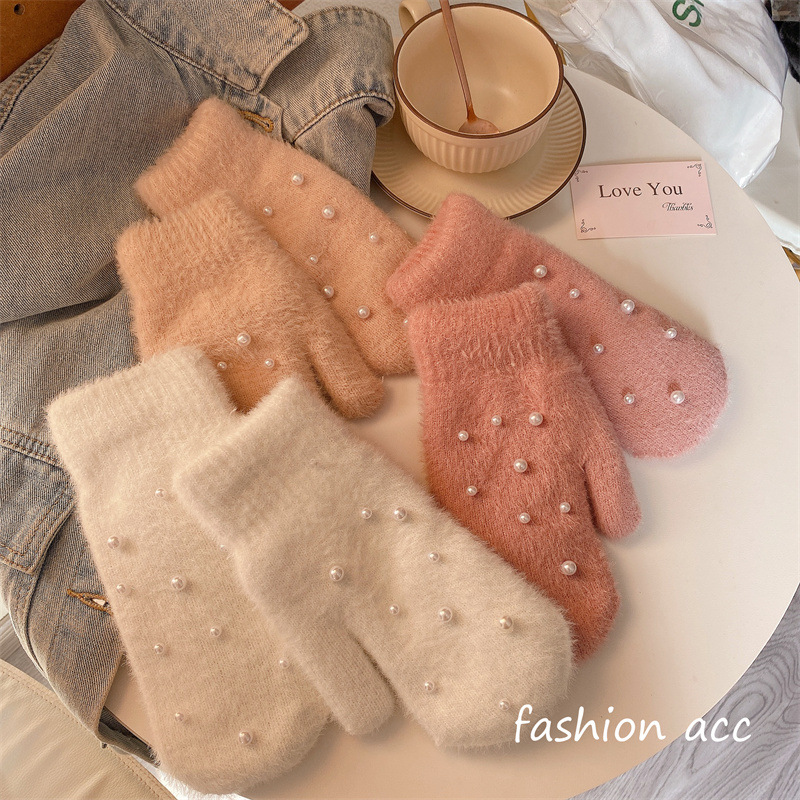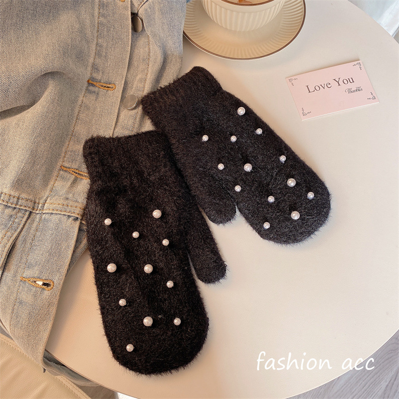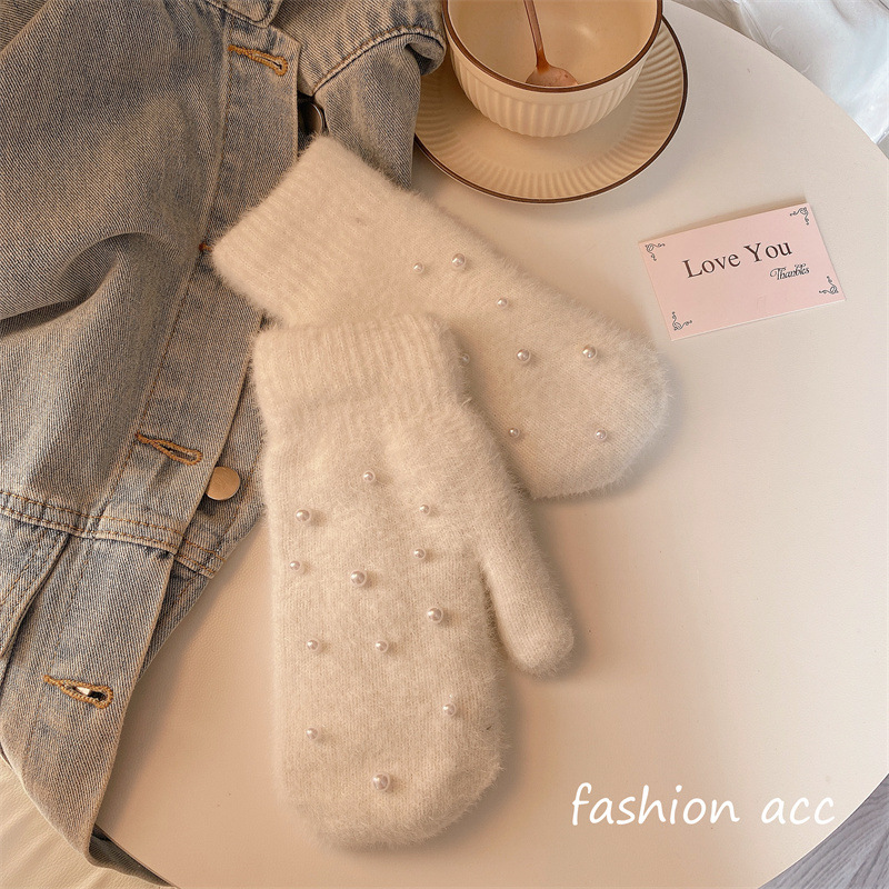 간단한 진주 가방 손가락 기모 두꺼운 달콤한 소녀 큰 어린이 양모 니트 우아한 가을과 겨울 장갑 여성용스토어 가기