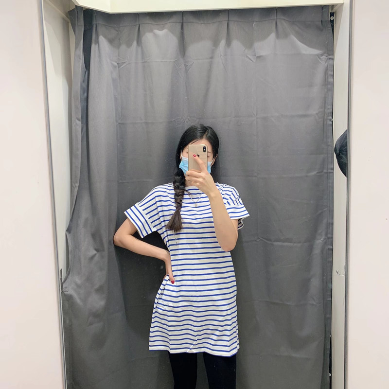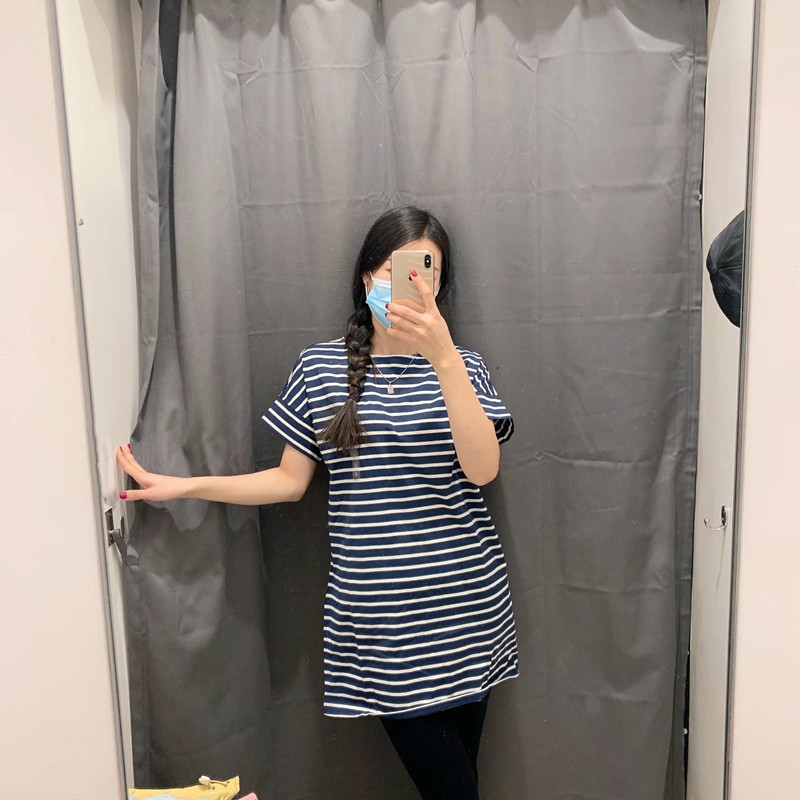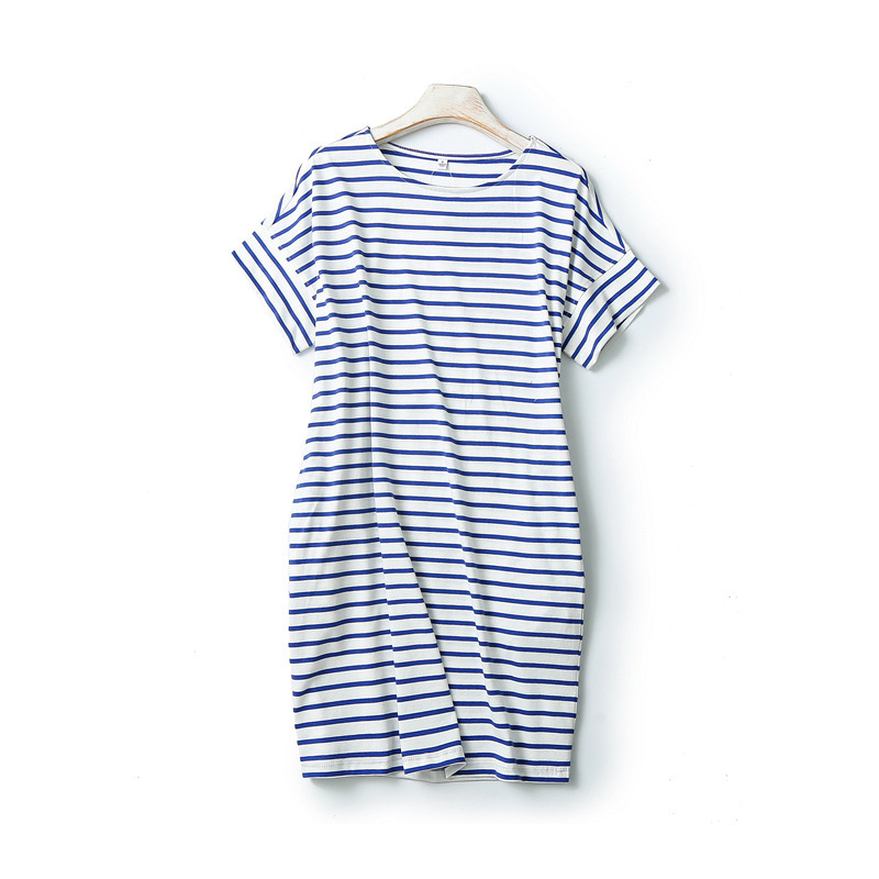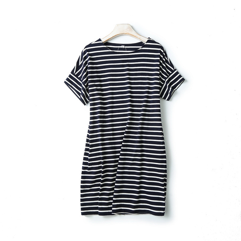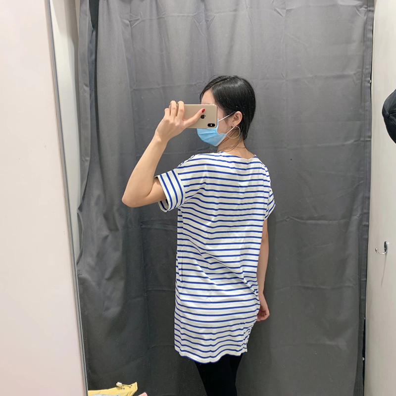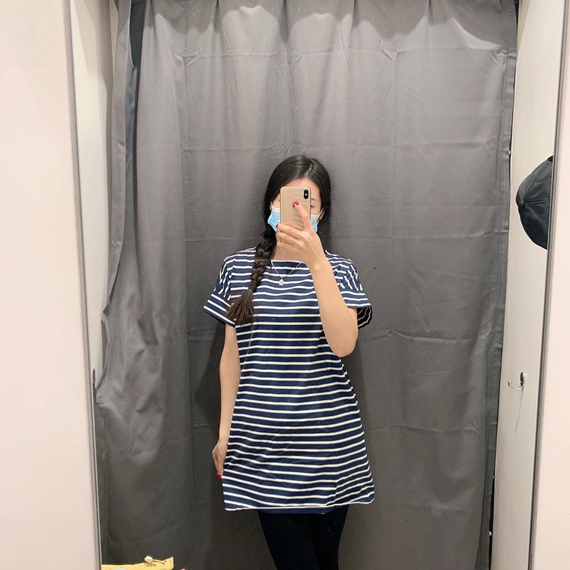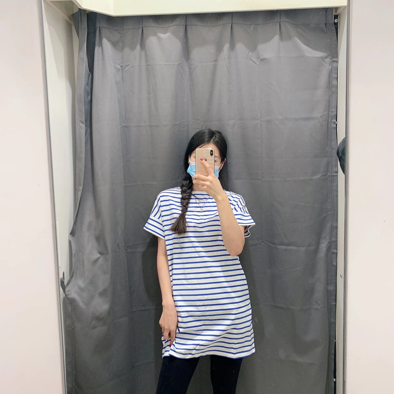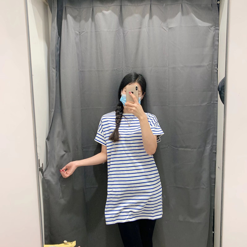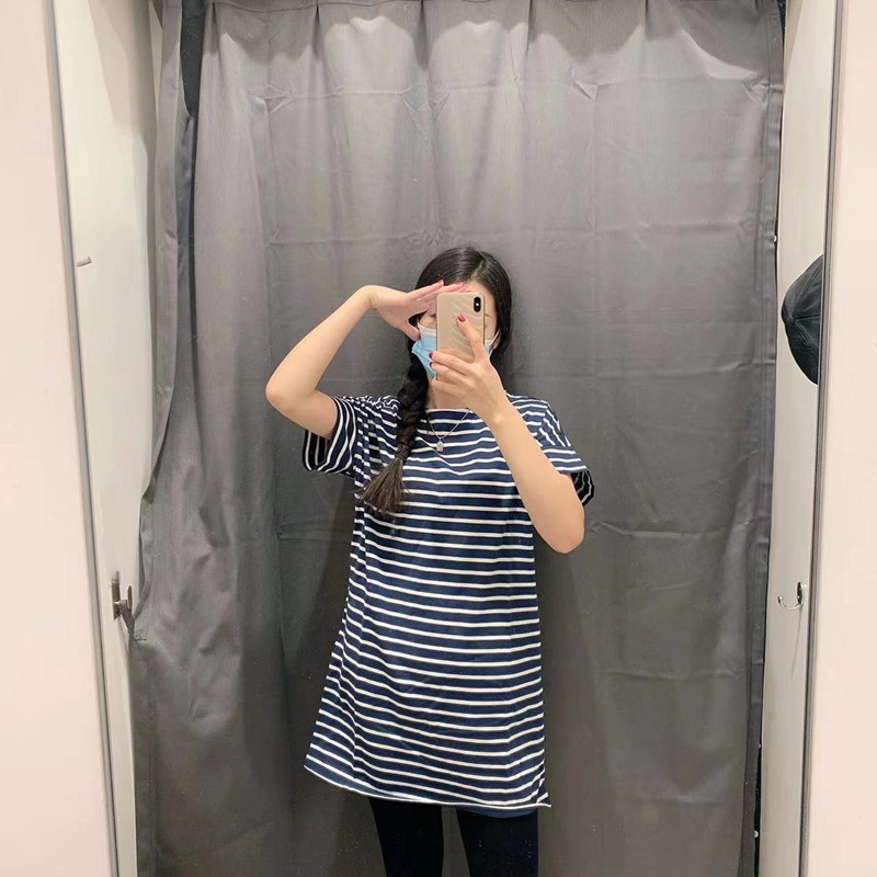 일본 여성복 22 신상 부드러운 면 스트라이프 중간 길이 반팔 티셔츠 원피스 여성 446265 여성용 티셔츠스토어 가기