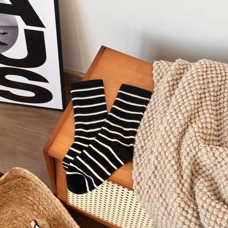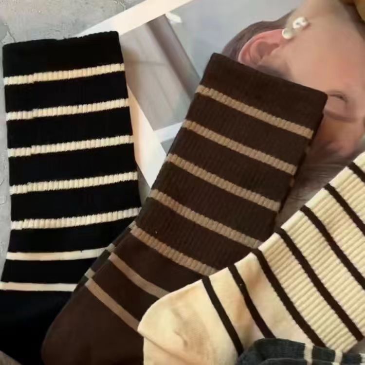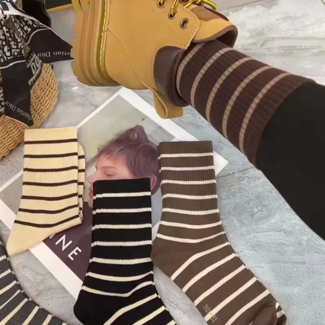 여성용 가을 겨울 양말, 메일라드 스트라이프 중목 양말, 카페색 레트로 스타일, 샤크 팬츠와 어울리는 트렌디한 롱 양말스토어 가기