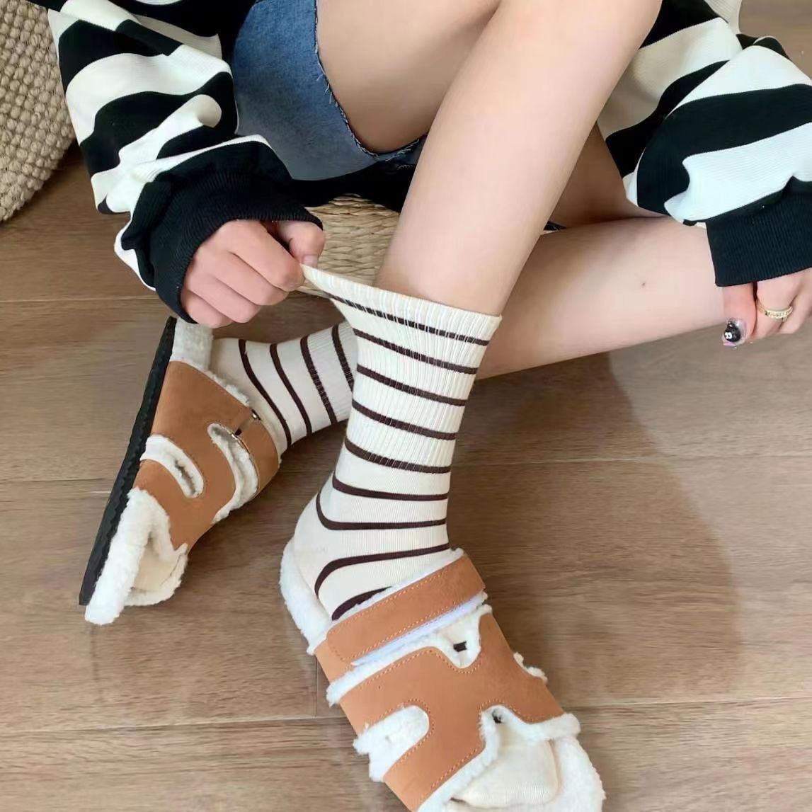秋冬季袜子女中筒袜女咖系条纹休闲袜堆堆袜女女士袜子批发诸暨市