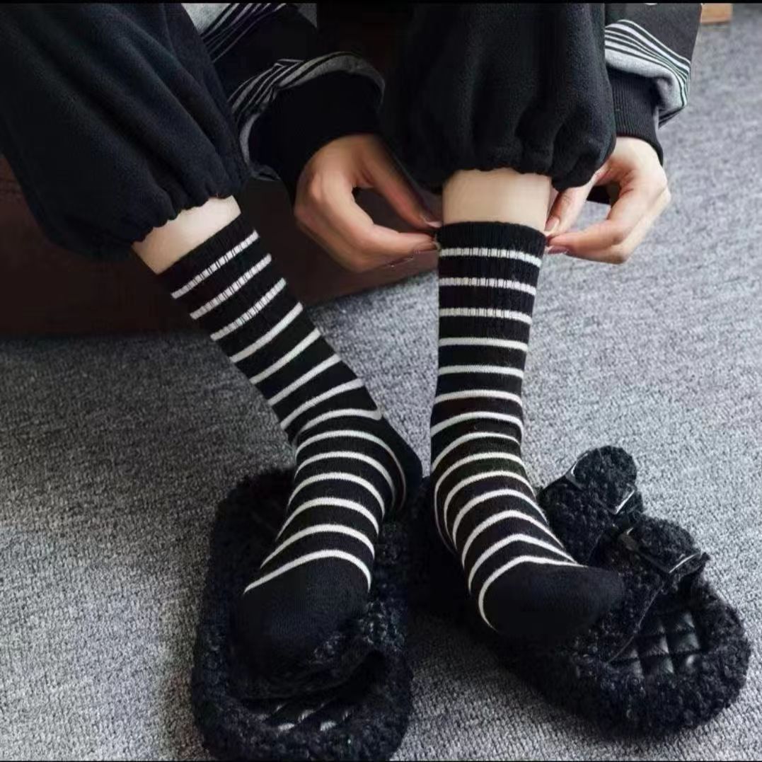 袜子女中筒秋冬新款条纹长筒袜美拉德配鲨鱼裤时尚外穿复古堆堆袜