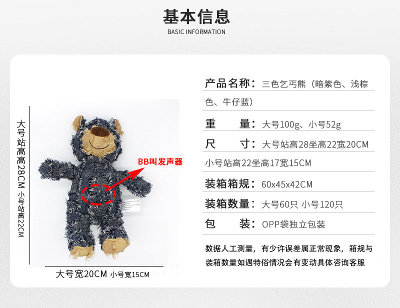 새로운 유럽과 미국 스타일의 애완 동물 봉제 곰 장난감 개 물린 소리 3 색 거지 곰 장난감 크기 옵션스토어 가기