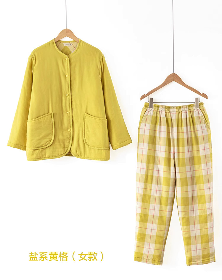무인쇄 일본식 고급 순면 이중 거즈 누빔 잠옷 여성용 면옷 남성용 가을 겨울 두꺼운 홈웨어 세트