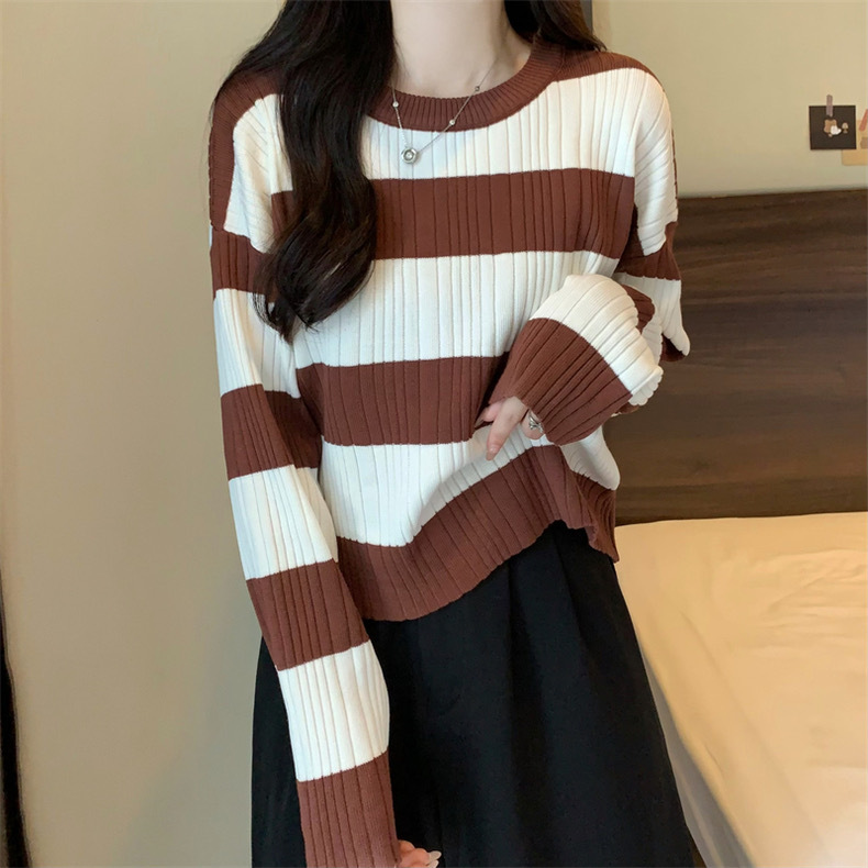 한국식 대비 색상 라운드 넥 스트라이프 긴팔 스웨터 여성용 가을과 겨울 슬림 한 느슨한 풀오버 숏베이스 셔츠 탑스토어 가기