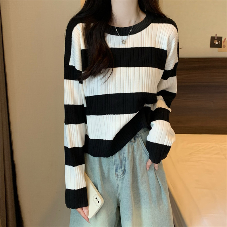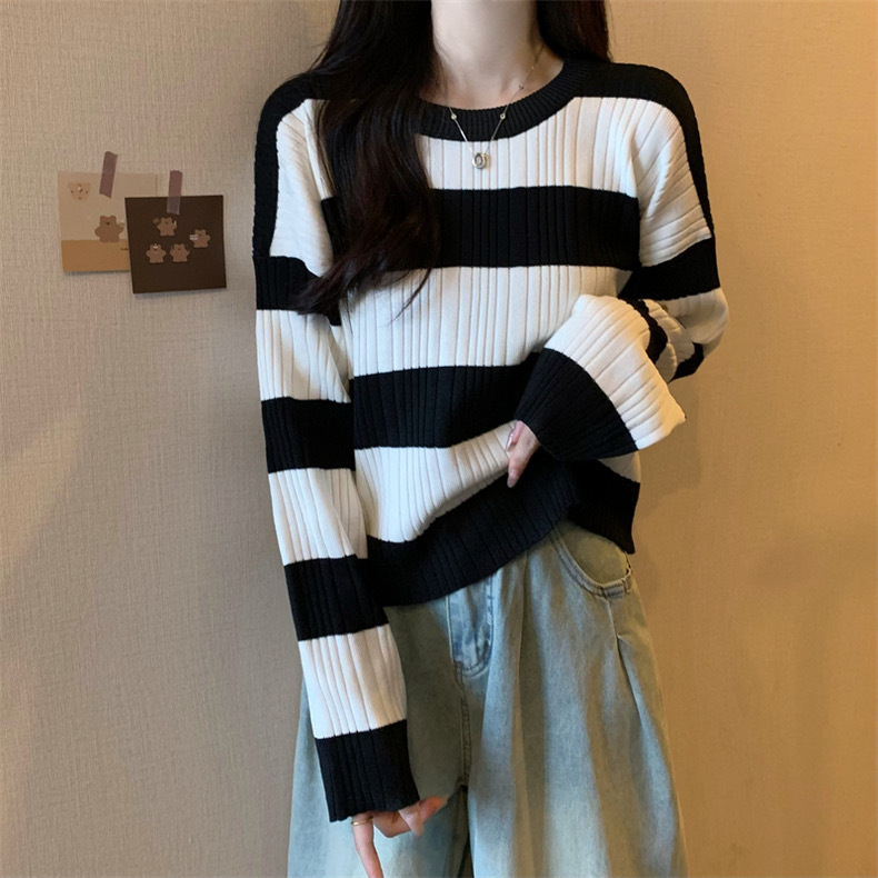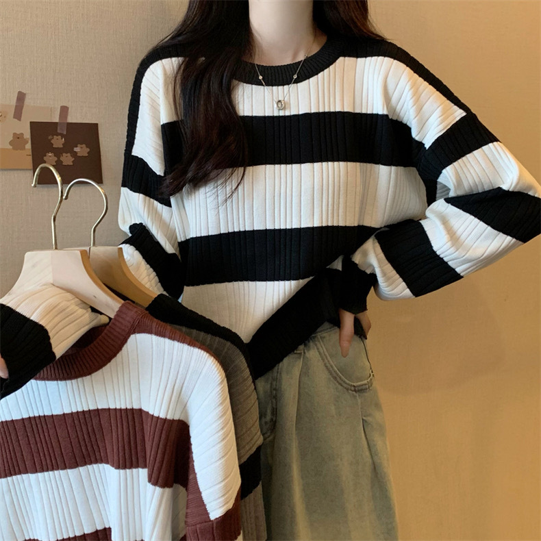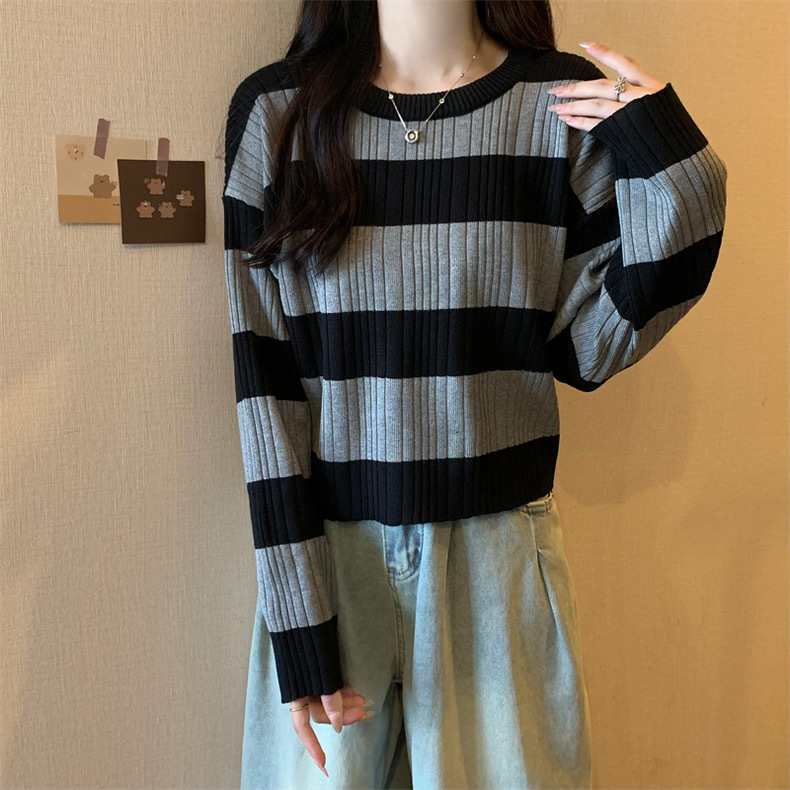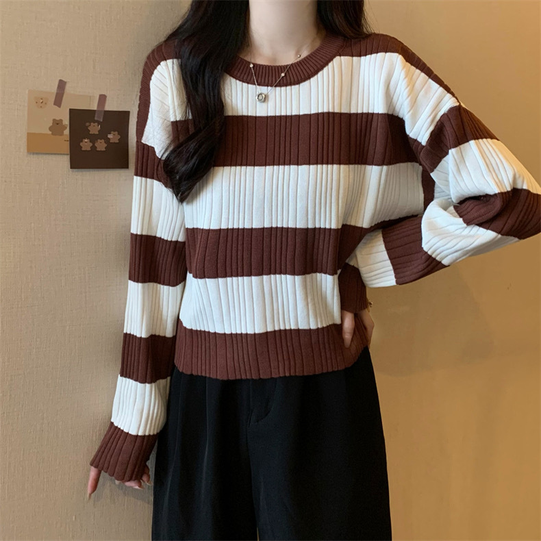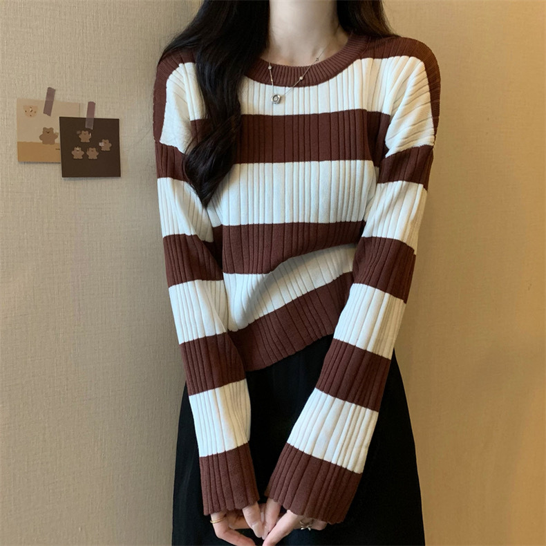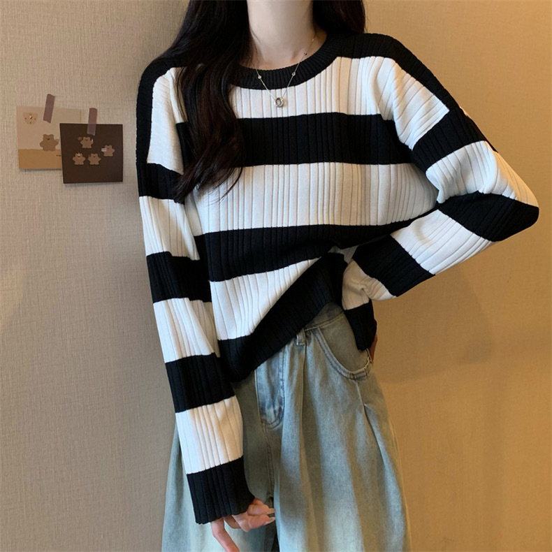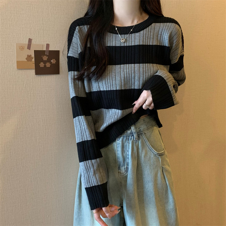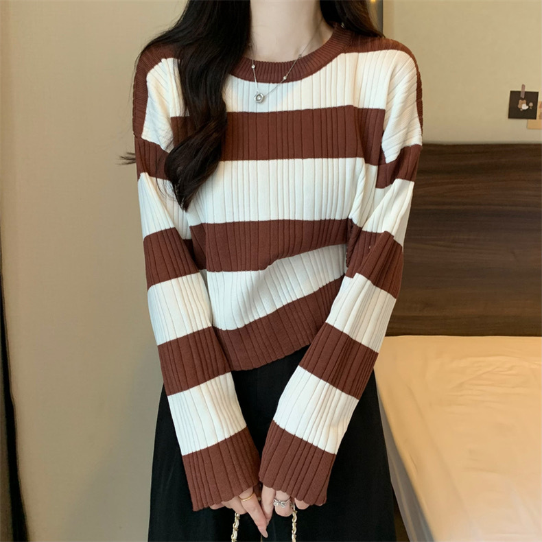 한국식 대비 색상 라운드 넥 스트라이프 긴팔 스웨터 여성용 가을과 겨울 슬림 한 느슨한 풀오버 숏베이스 셔츠 탑