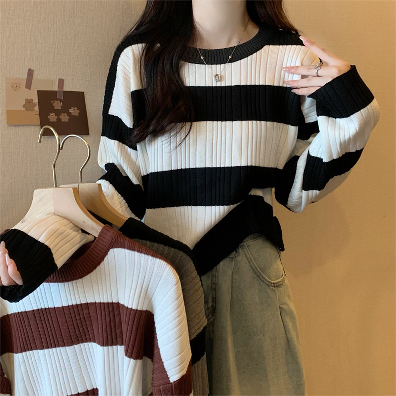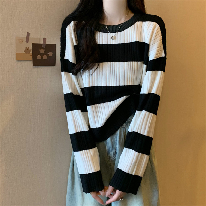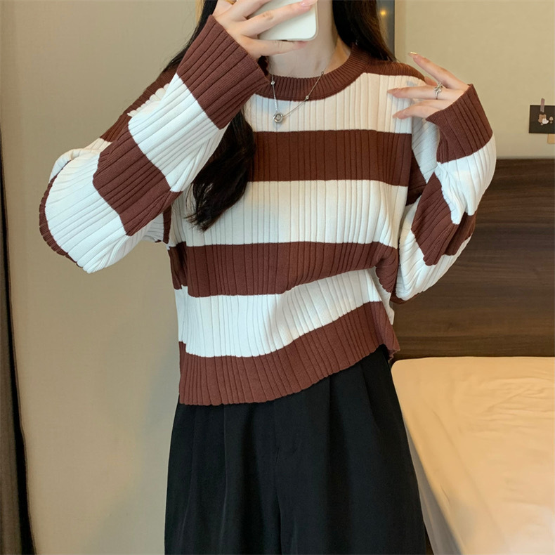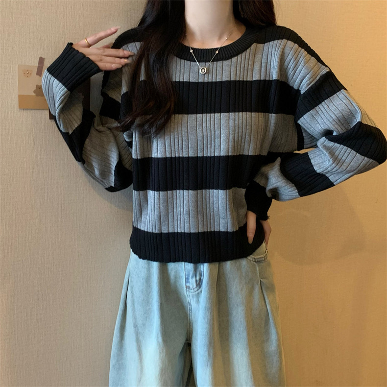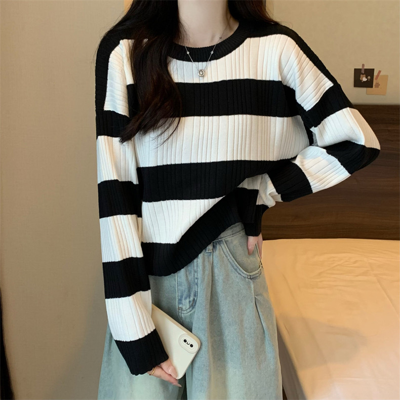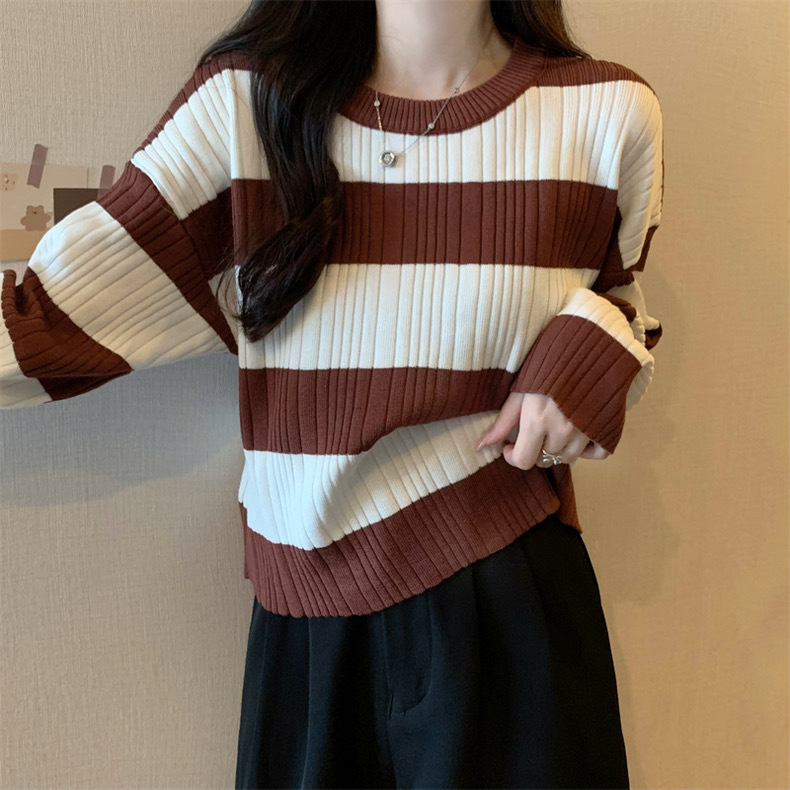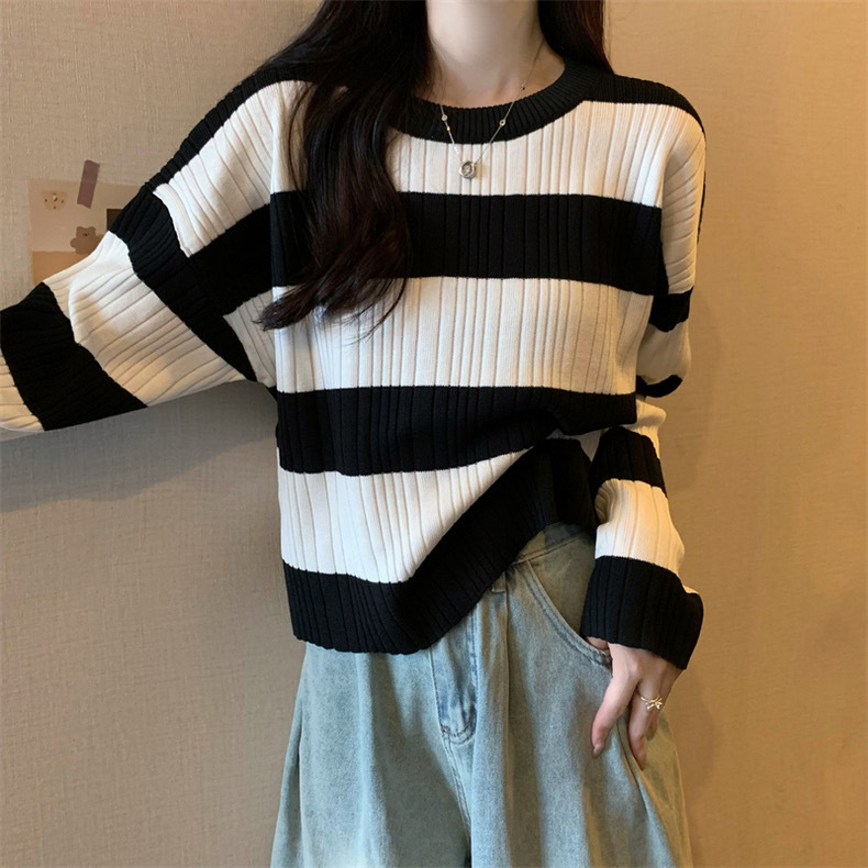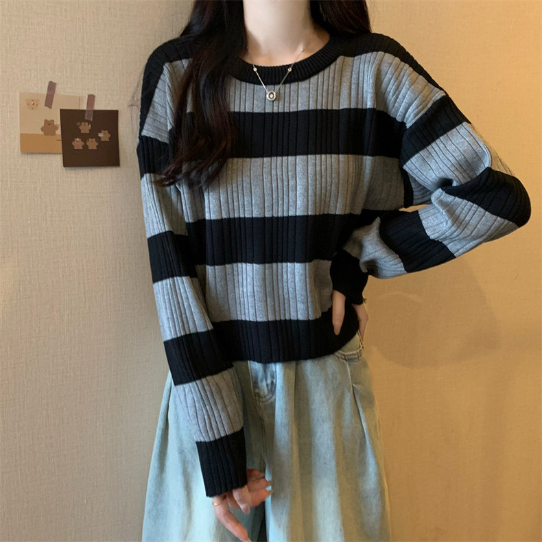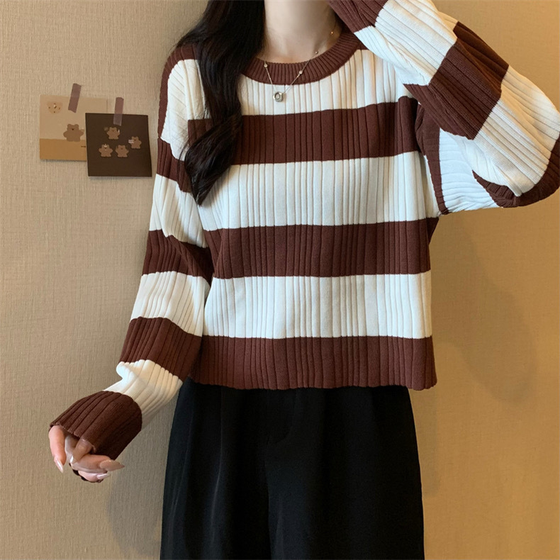 한국식 대비 색상 라운드 넥 스트라이프 긴팔 스웨터 여성용 가을과 겨울 슬림 한 느슨한 풀오버 숏베이스 셔츠 탑