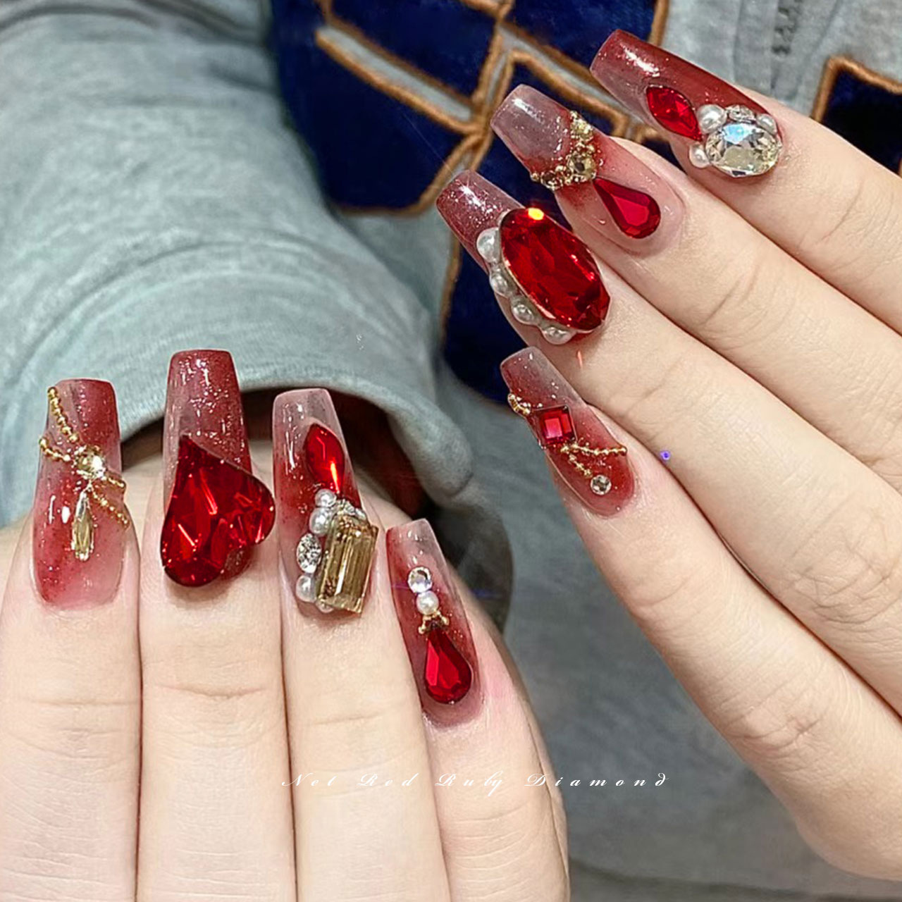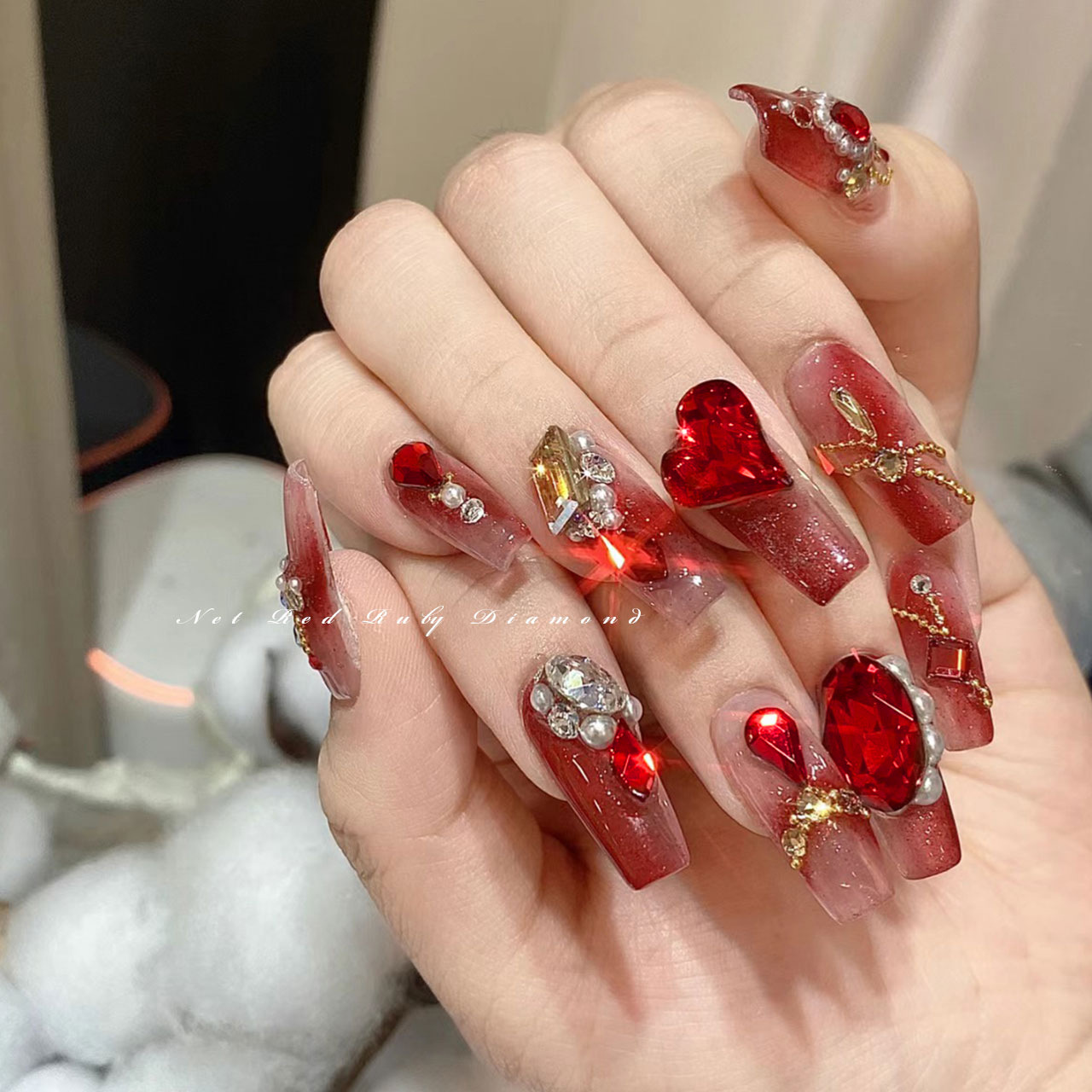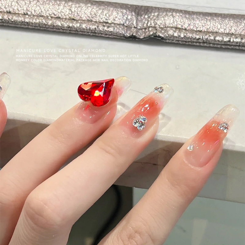 빨간 뾰족한 바닥 모양의 다이아몬드 네일 아트 보석 신부 갑옷 비뚤어진 심장 지방 사각형 다이아몬드 중국 빨간 손톱 쇠고기 피 레드 다이아몬드 도매스토어 가기