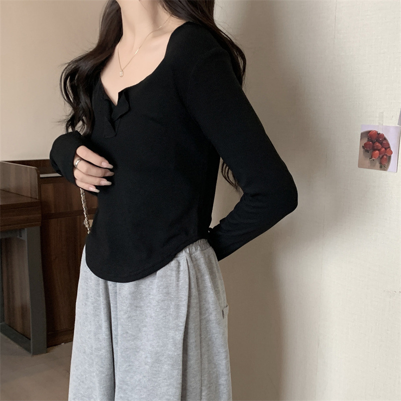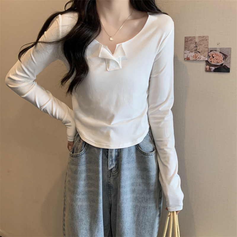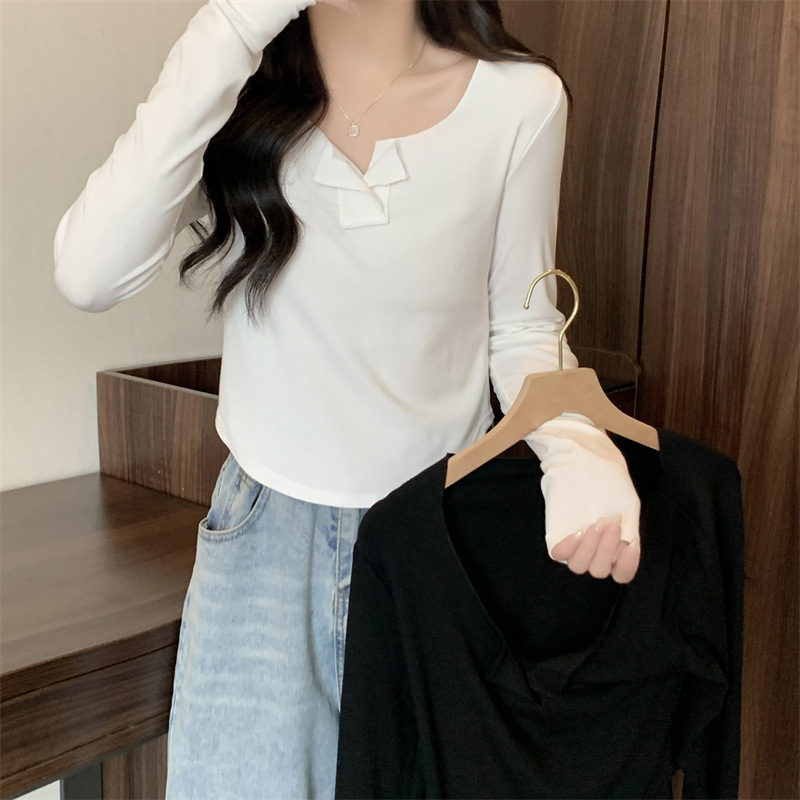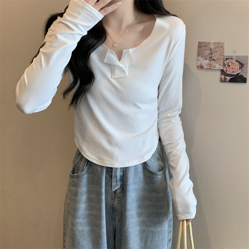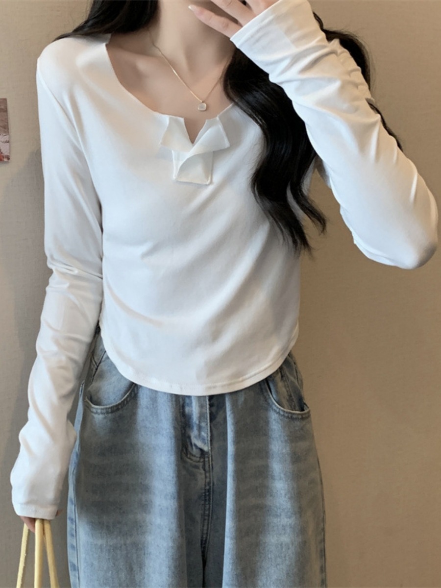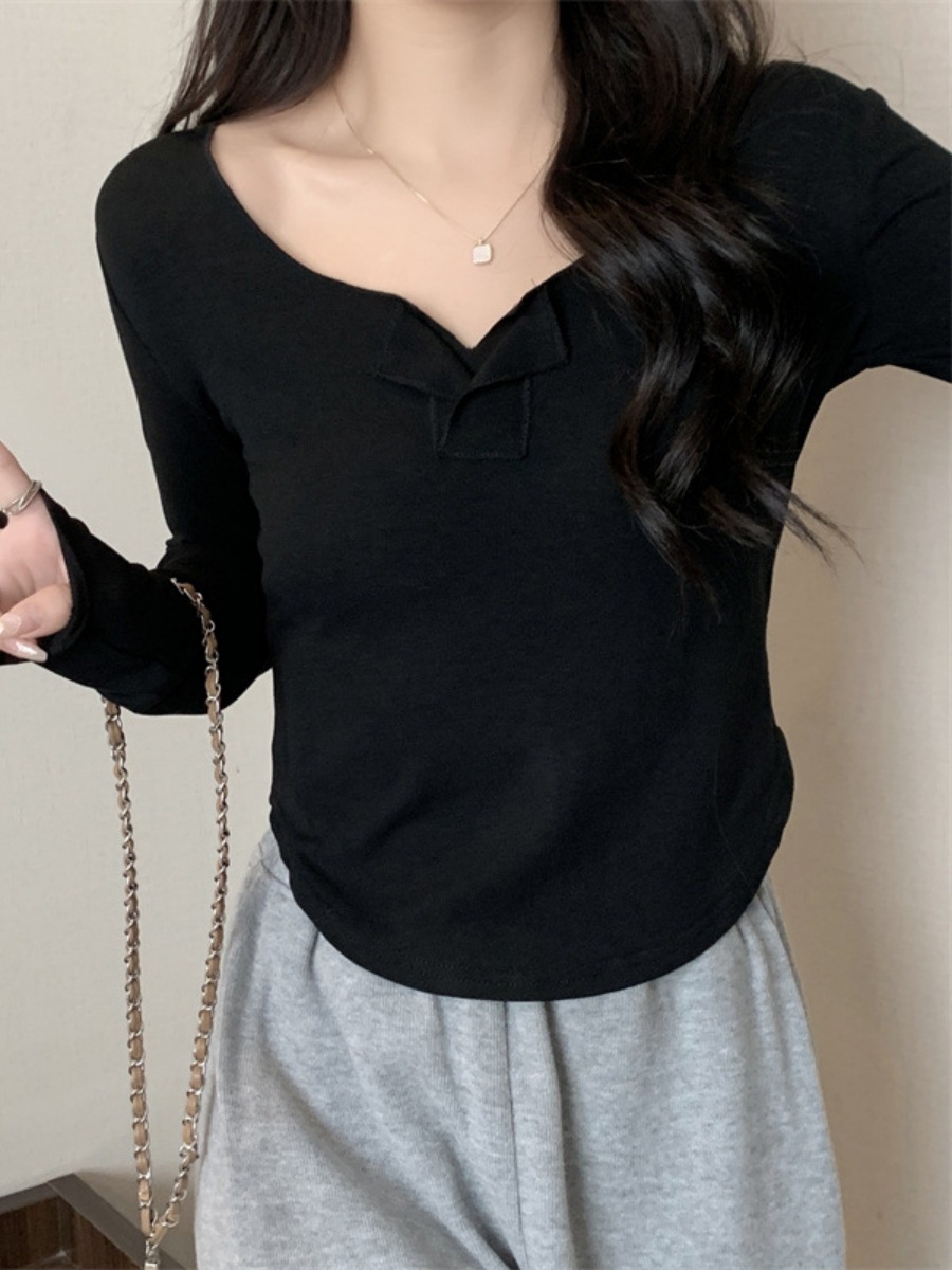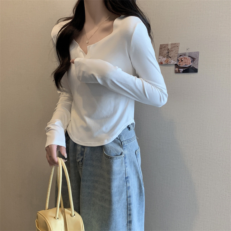 우유 파쇄 스파이스 걸 불규칙한 V-넥 긴팔 티셔츠 여성용 가을 디자인 센스 짧은베이스 셔츠 탑 트렌디스토어 가기