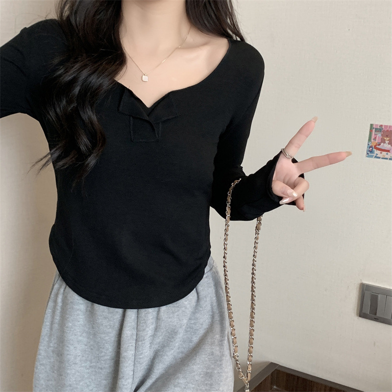 우유 파쇄 스파이스 걸 불규칙한 V-넥 긴팔 티셔츠 여성용 가을 디자인 센스 짧은베이스 셔츠 탑 트렌디
