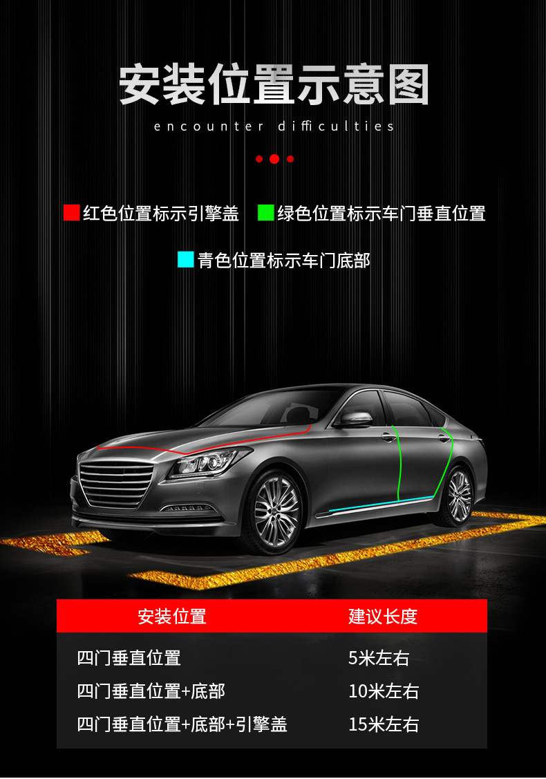 一车4门竖边+底部横边+后备箱底边安装长度为15m;