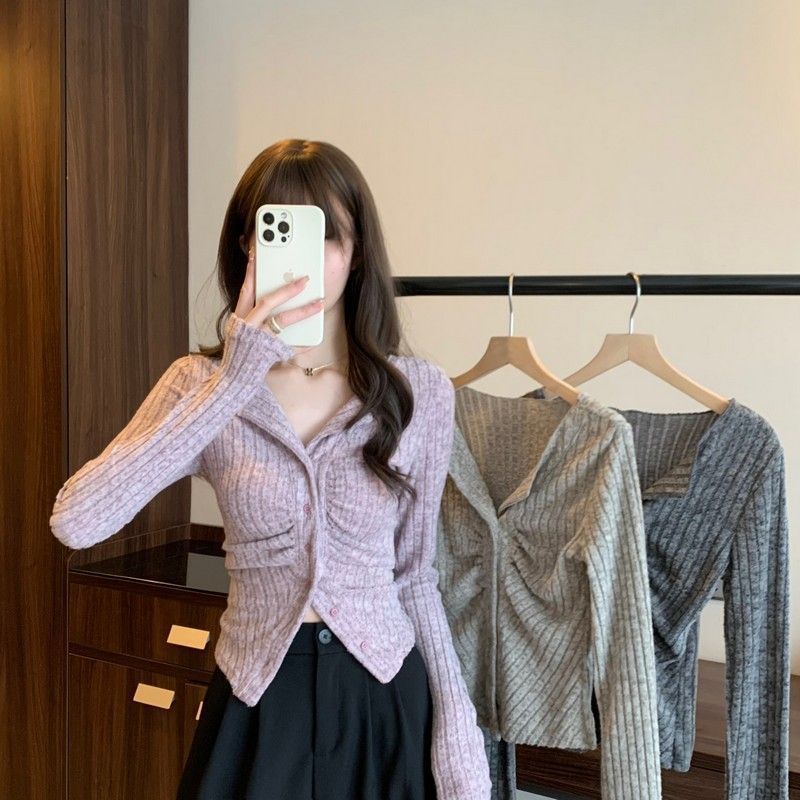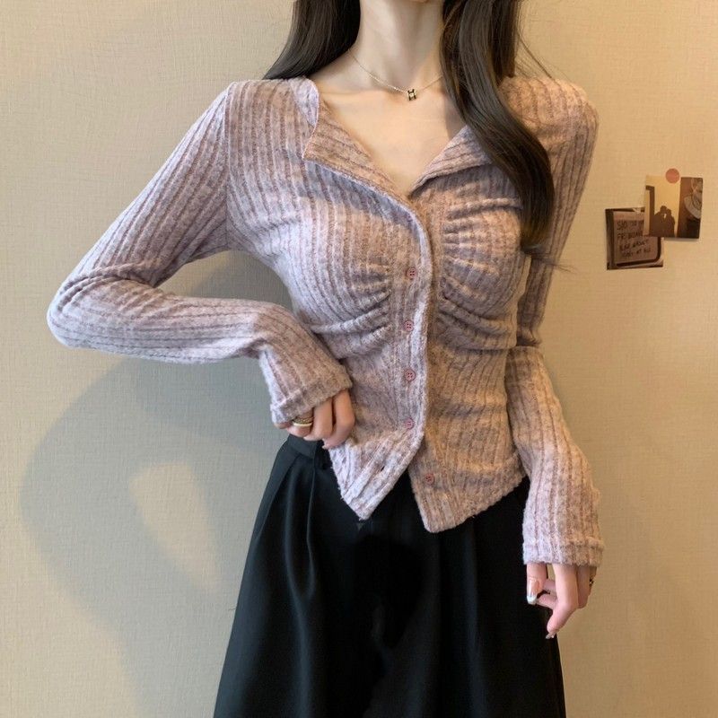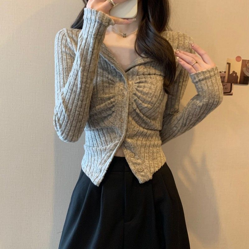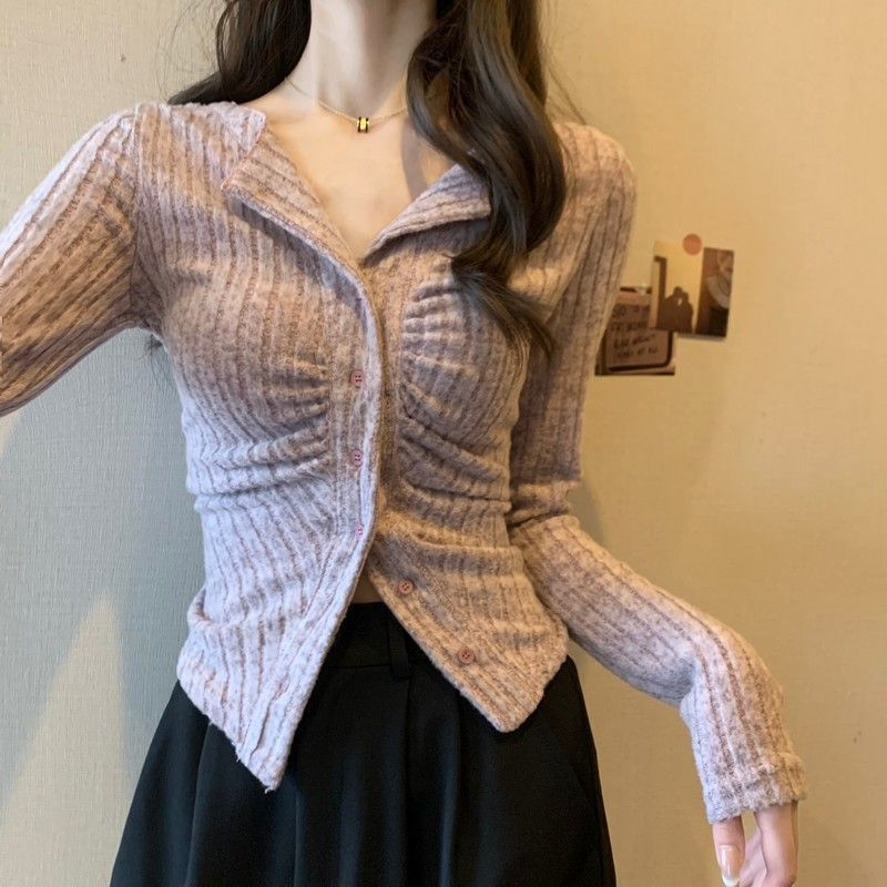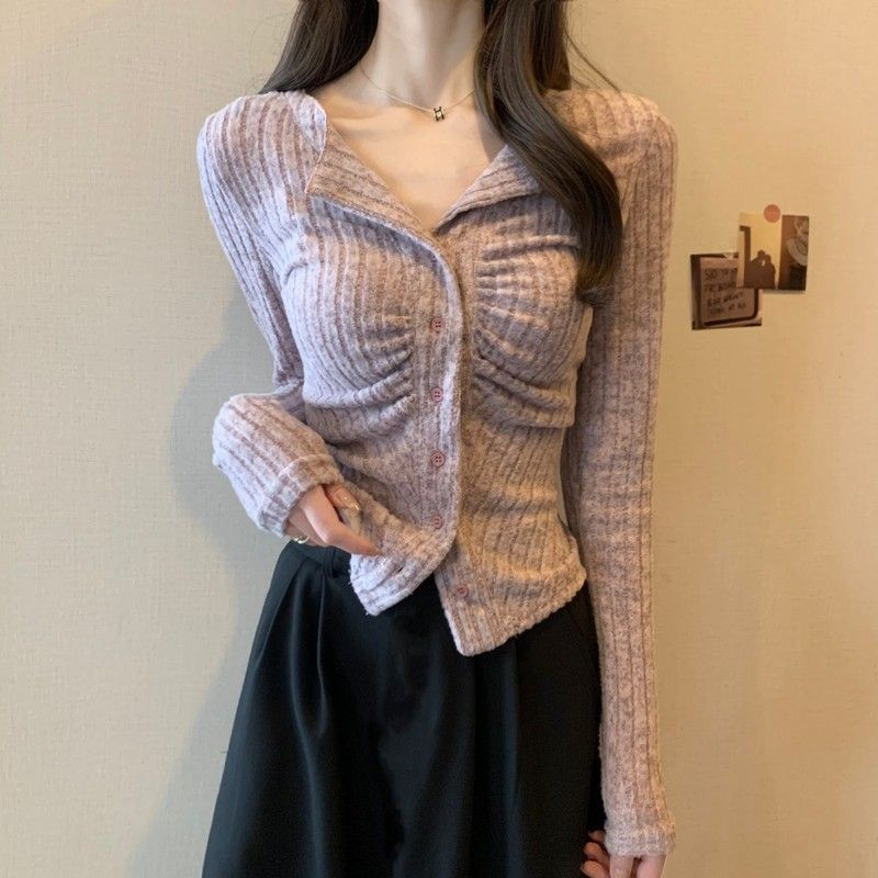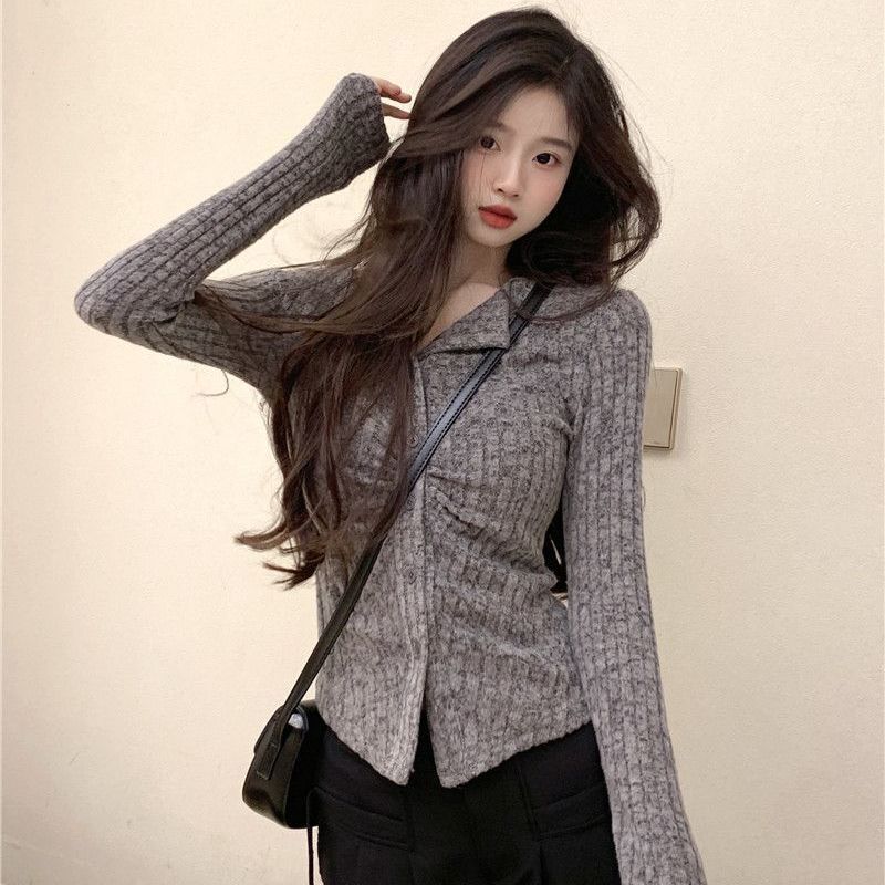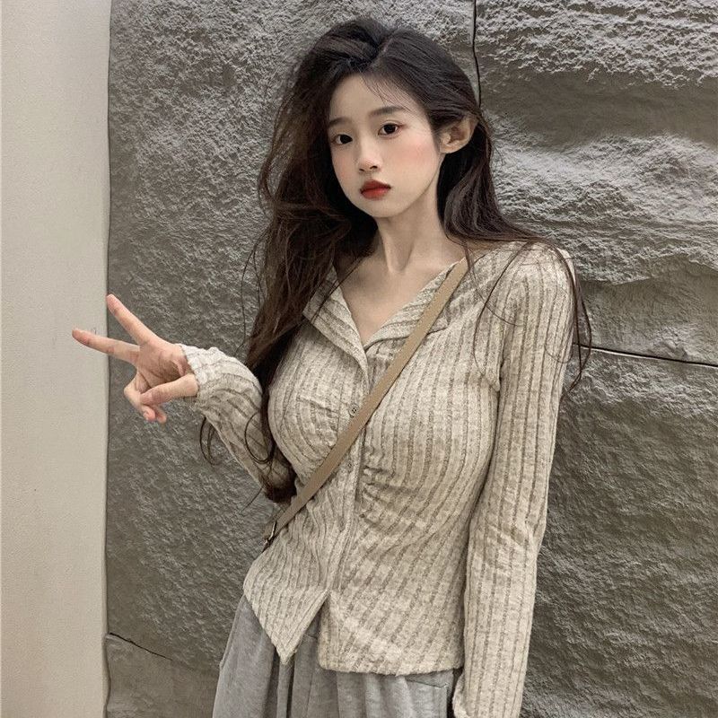 프렌치 슬림핏 라펠 플리츠 불규칙 슬림핏 슬림 여성용 가을 베이스 셔츠 내부 긴팔 틈새 탑스토어 가기