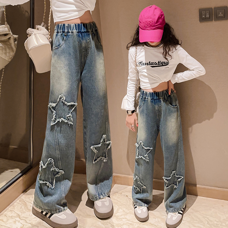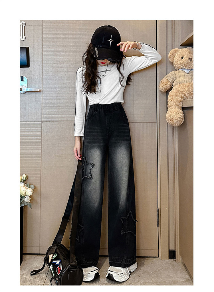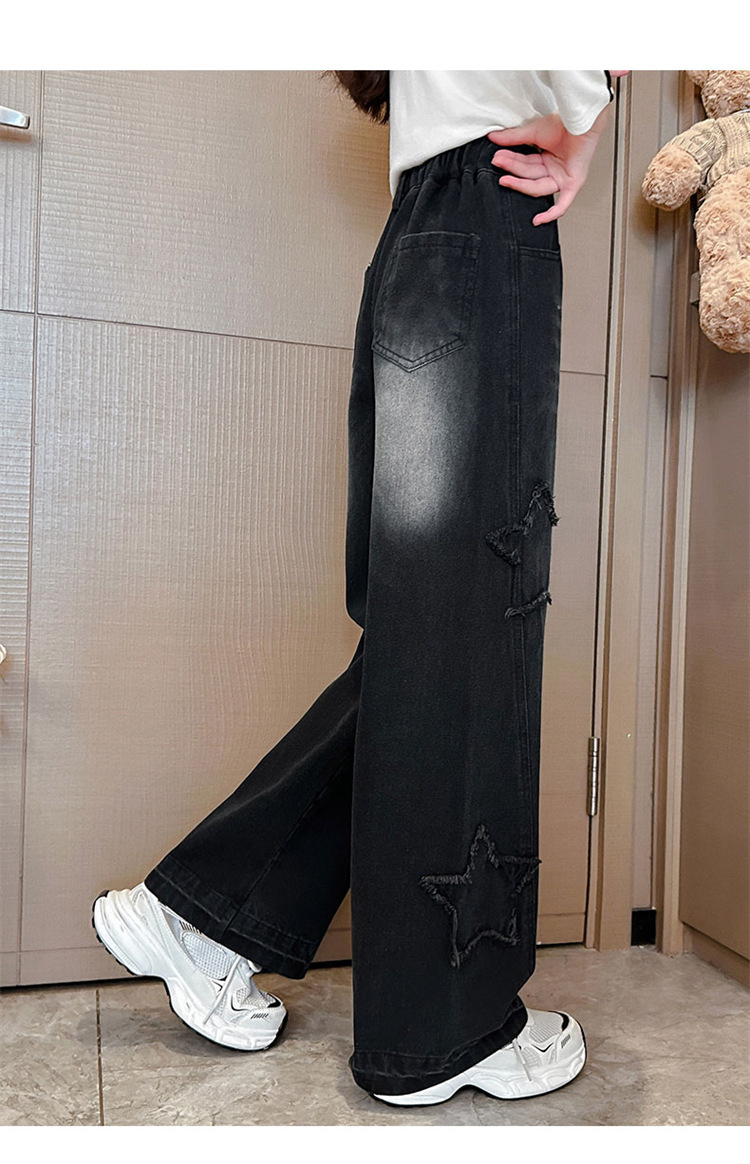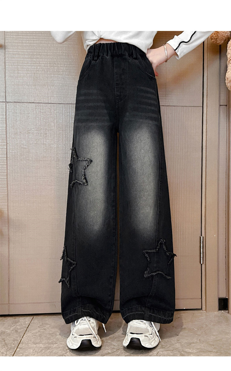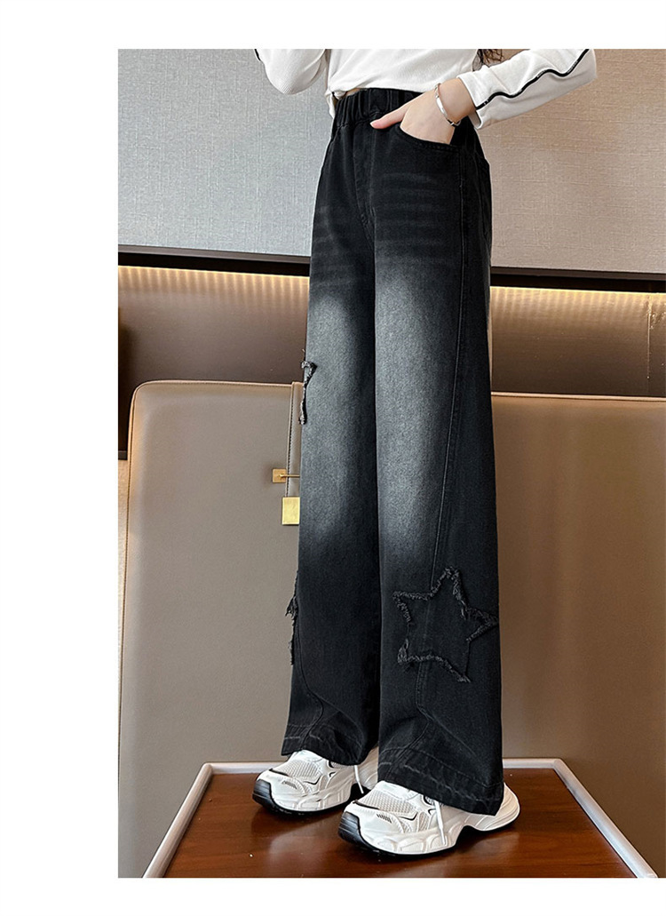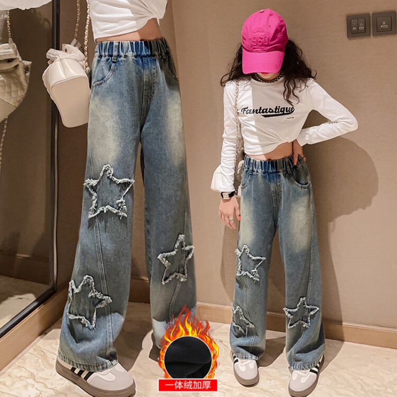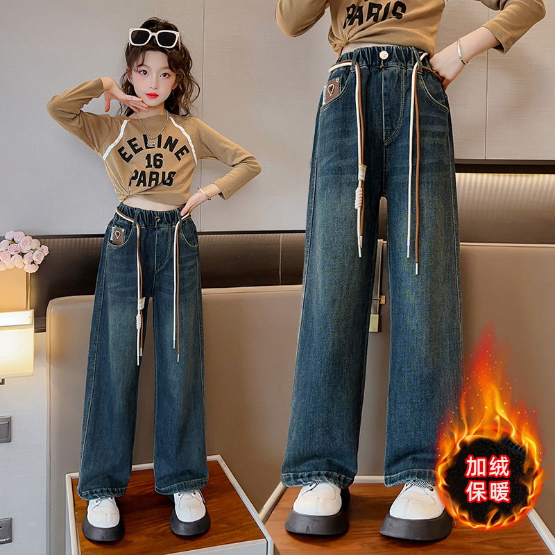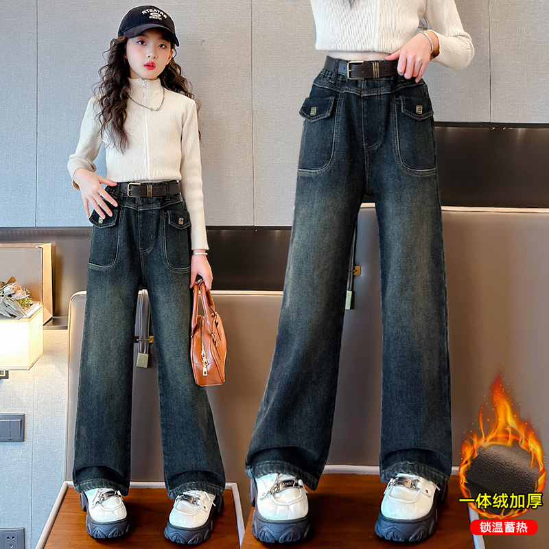 여아 와이드 레그 팬츠 가을과 겨울 큰 어린이 기모 두꺼운 느슨한 스트레이트 청바지 겨울 블랙 겨울 어린이 바지스토어 가기