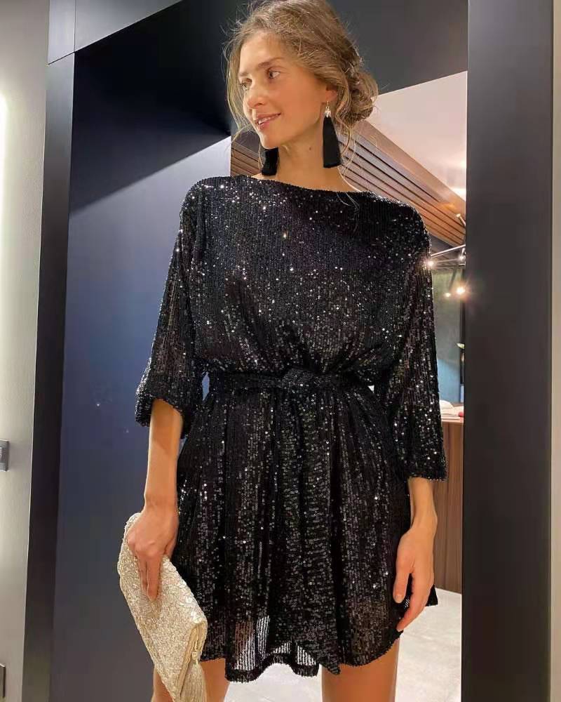 2025 유럽과 미국의 새로운 독립 스테이션 휴일 파티 패션 스팽글 비즈 컬러 허리 드레스 작은 드레스스토어 가기