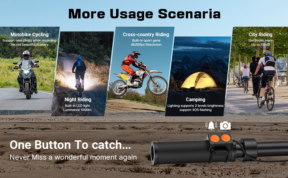 应用场景:通过配件固定在自拍杆或身体某部位、头盔、滑板、自行车把手上, 用于户外运动、骑行(自行车)或作为行车记录仪等