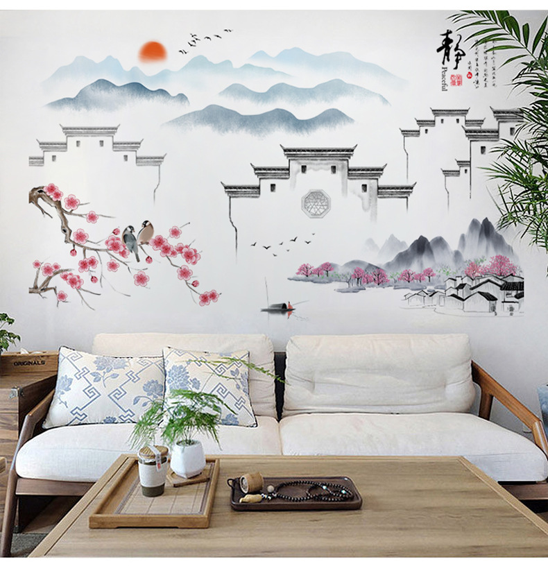 컬러 벽 스티커 CH69093 Jiangnan 타운 풍경 잉크 페인팅 홈 소파 배경 벽 자체 접착 스티커스토어 가기