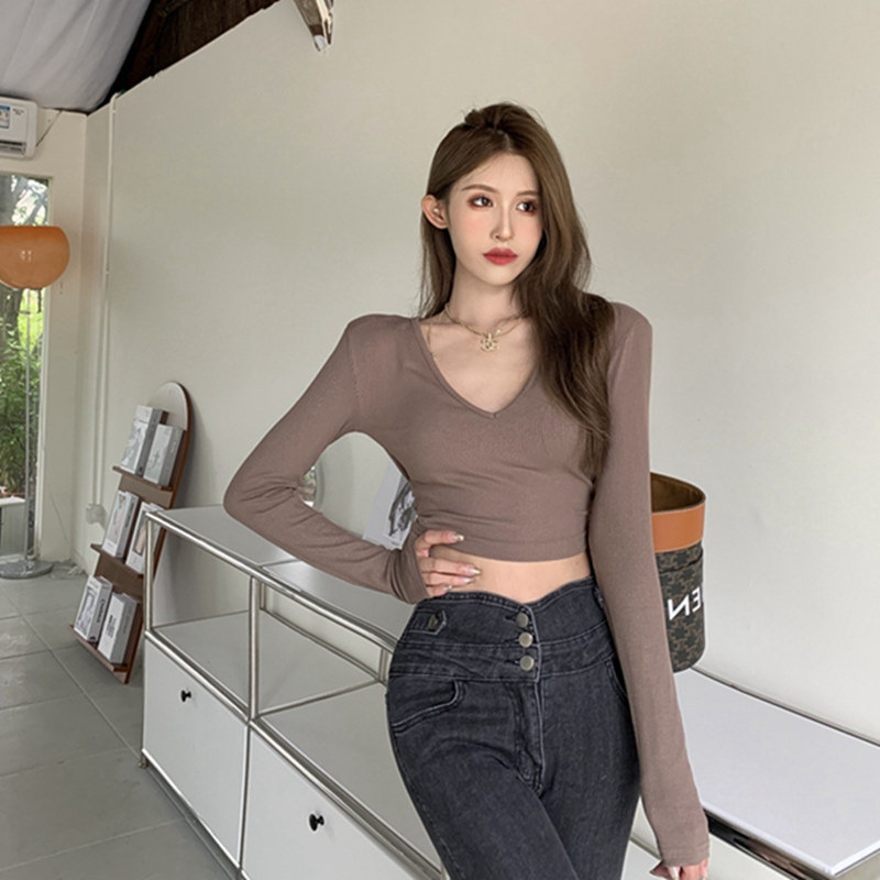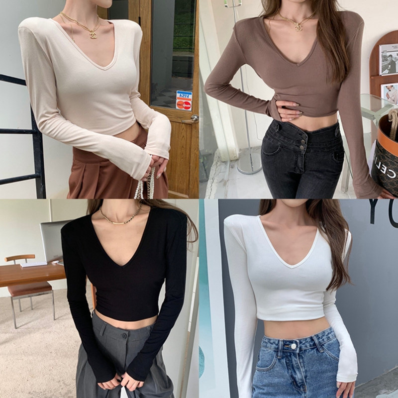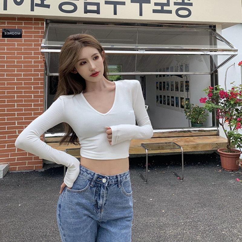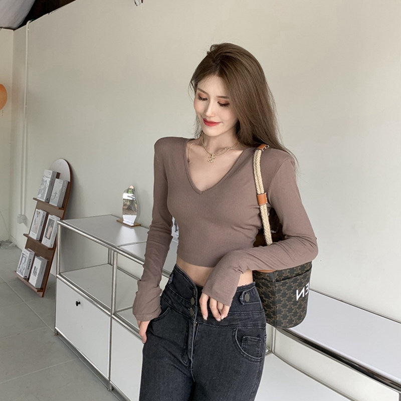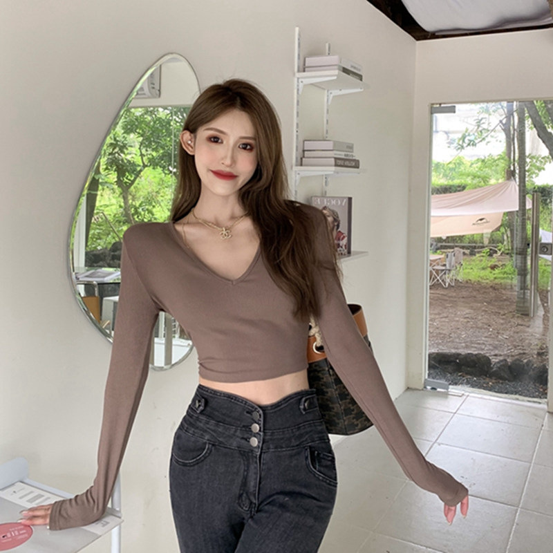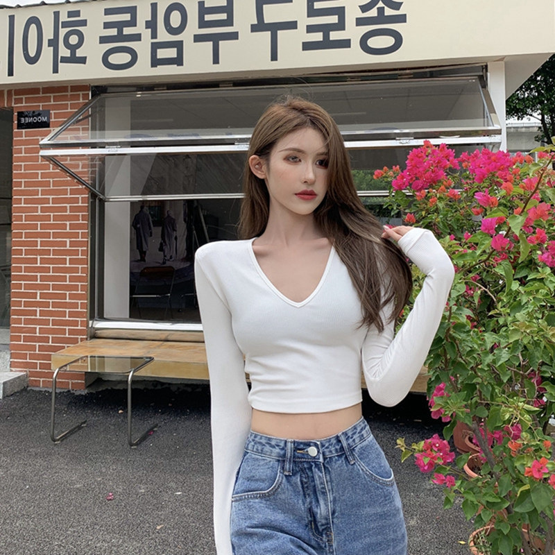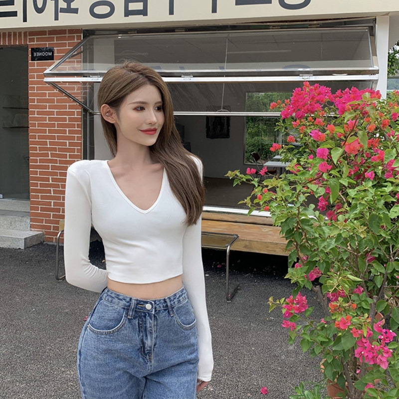 밀크 실크 티셔츠 여성용 짧은 슬림핏 긴팔 베이스 셔츠 가을 섹시한 V-넥 쇄골 학생 탑 여성스토어 가기