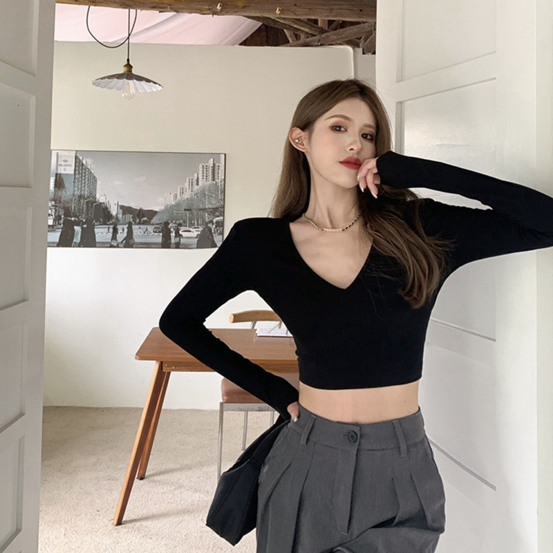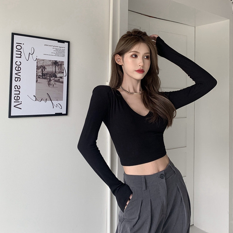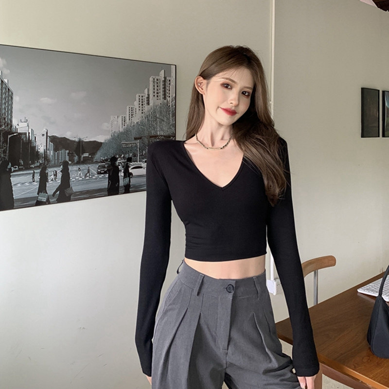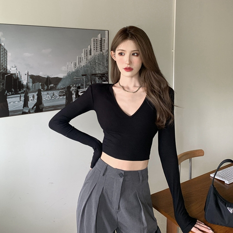 밀크 실크 티셔츠 여성용 짧은 슬림핏 긴팔 베이스 셔츠 가을 섹시한 V-넥 쇄골 학생 탑 여성