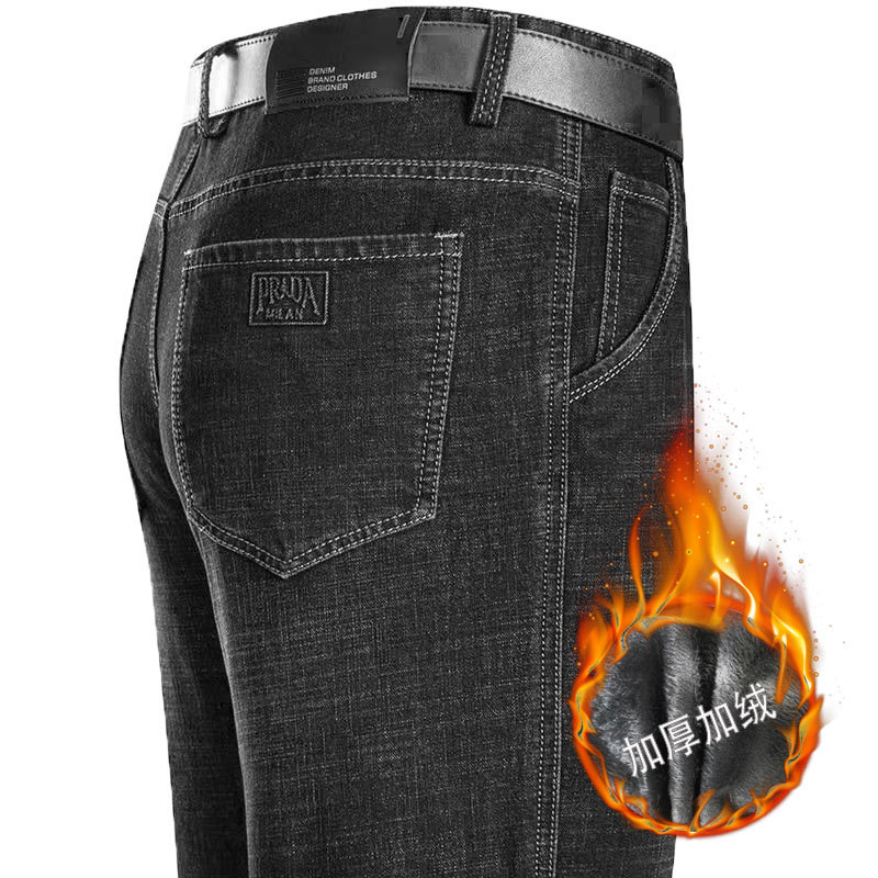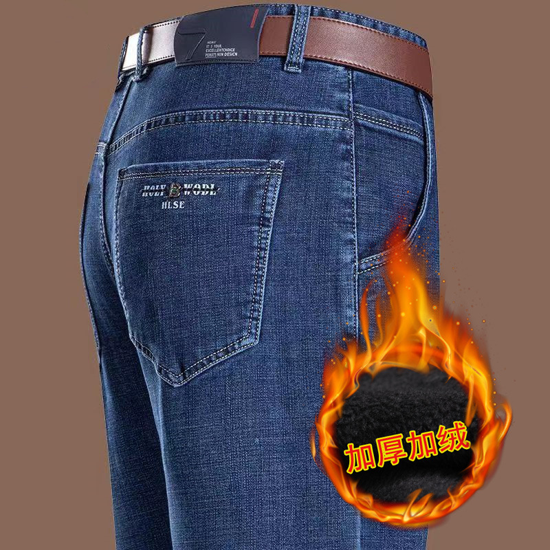 가을 겨울 두꺼운 기모 데님 팬츠, 루즈핏 스트레이트, 중년 비즈니스 아빠들을 위한 하이웨이스트 캐주얼 남성 바지, 보온 팬츠