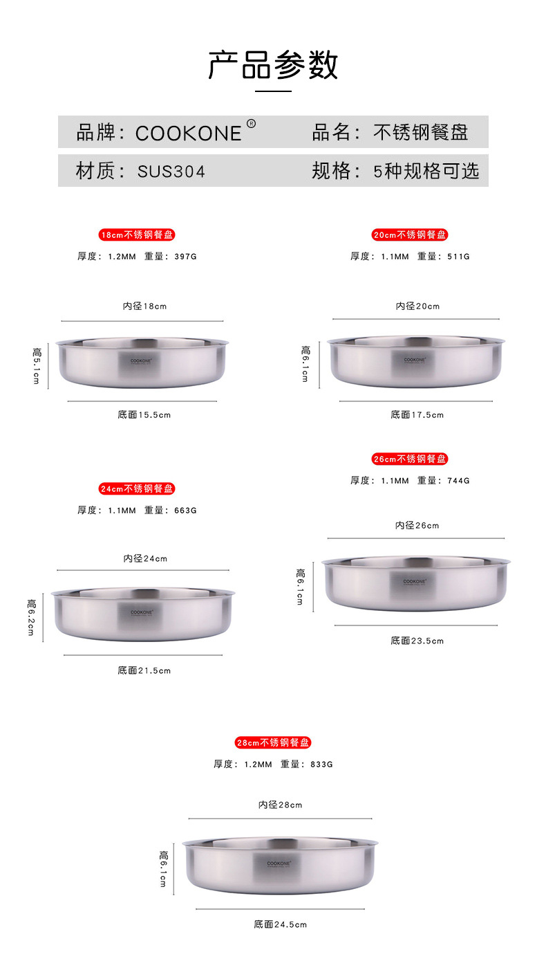 COOKONE18/10 스테인레스 스틸 두꺼운 만두 플레이트 콜드 스킨 플레이트 멀티 사용 디너 플레이트 접시 요리 수프 플레이트스토어 가기