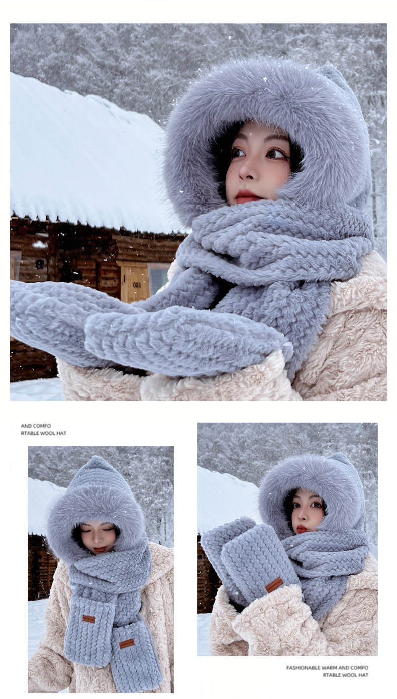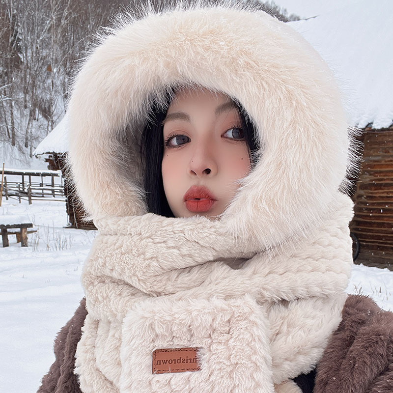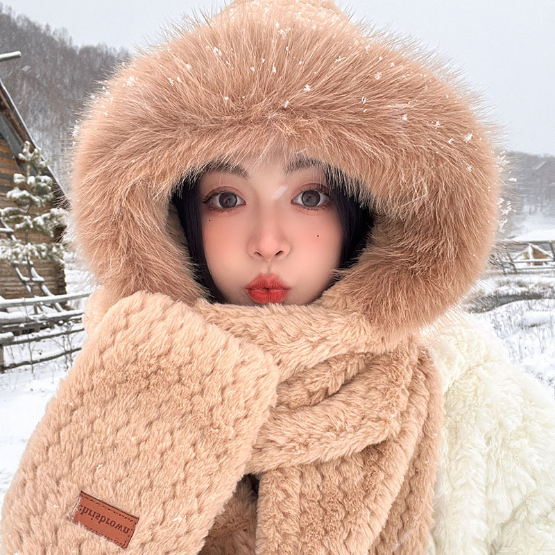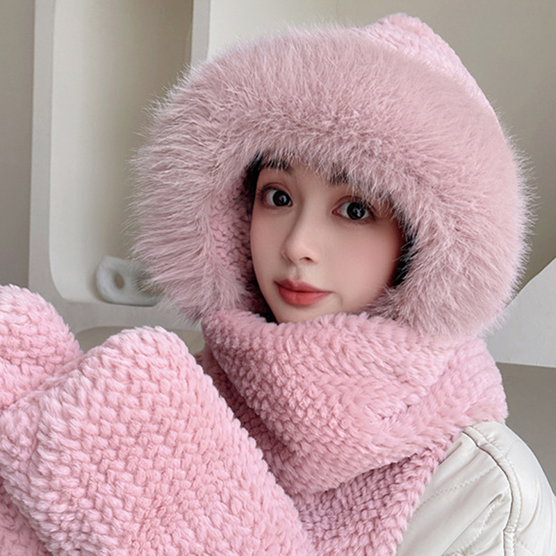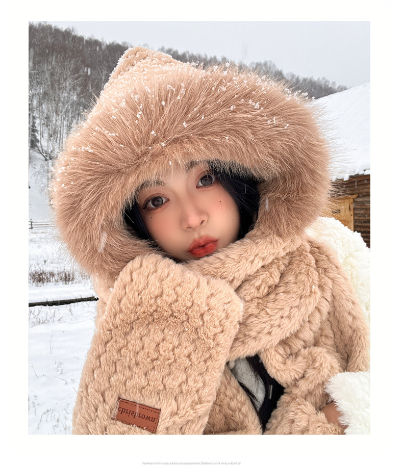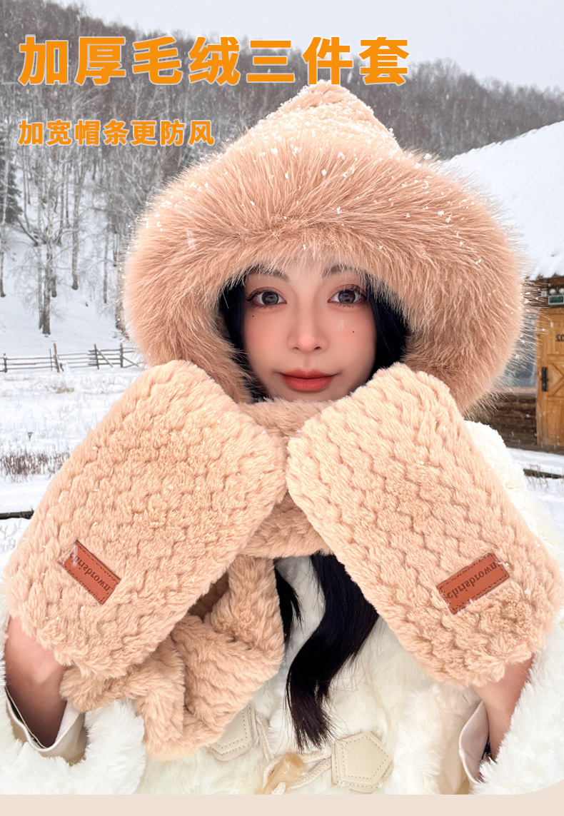 곰 플러시 모자와 스카프 일체형 여성용 겨울 귀여운 가을 겨울 장갑 3종 세트 따뜻한 2024 새로운 스타일