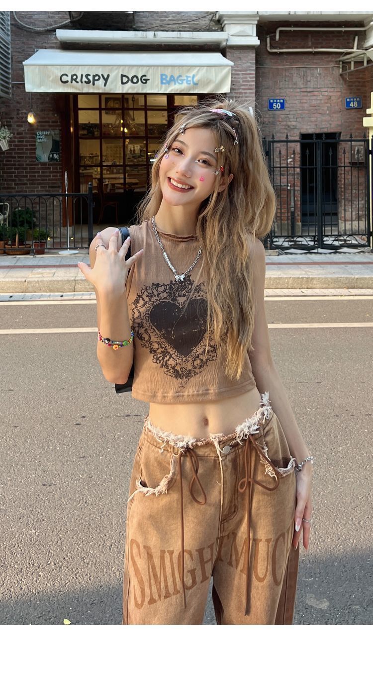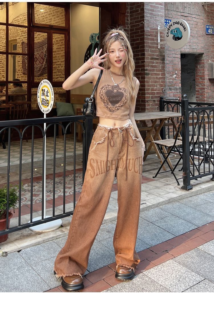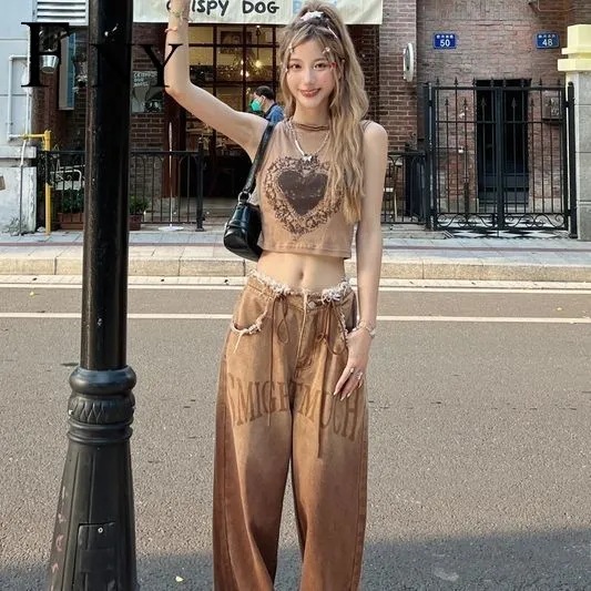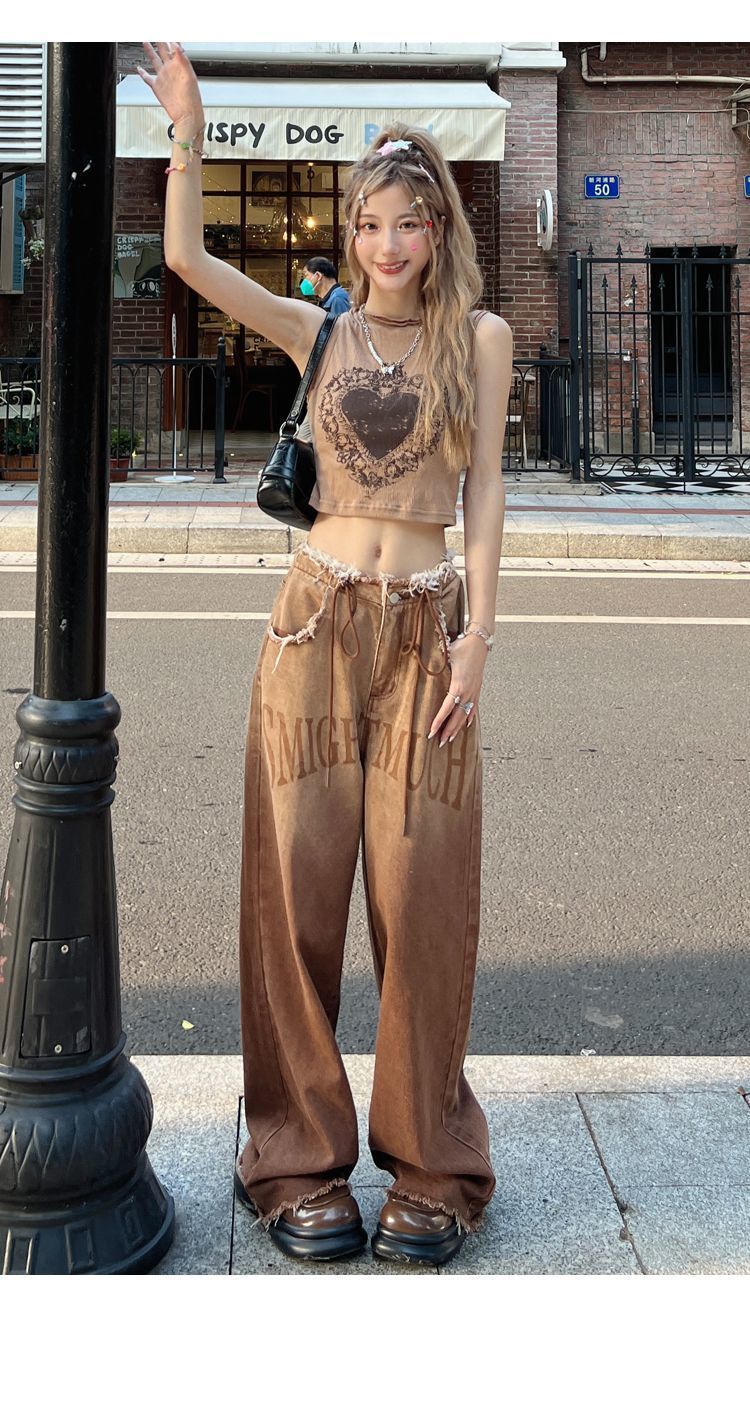 아메리칸 스타일 다크 브라운 편지 인쇄 청바지 여성용 레트로 하이 웨이스트 스트레이트 로우 하이 스트리트 바이브 스파이스 걸스 와이드 레그 바지스토어 가기