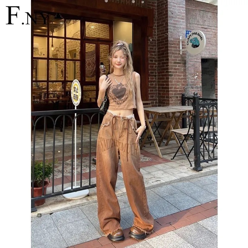 아메리칸 스타일 다크 브라운 편지 인쇄 청바지 여성용 레트로 하이 웨이스트 스트레이트 로우 하이 스트리트 바이브 스파이스 걸스 와이드 레그 바지